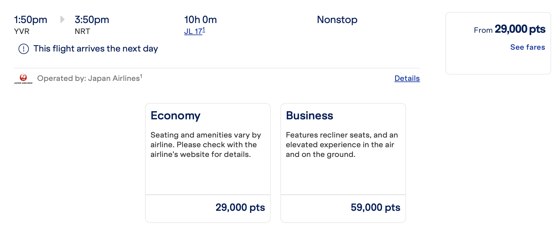 美西出发,目前看上去不管线路如何变化(譬如 LAX-HND,LAX-KIX,SFO-NRT,YVR-NRT 等等),经济舱显示单程需要 29,000 里程,超经和商务都是 59,000 里程。这应该不对。如本文最开始所述,刚上线的时候,超经是显示 49,000 里程的,AwardWallet 的博客也是这么报道,它说美西线路的所需里程数应该是 39,000/49,000/64,000。还请大家以实际 DP 为准。这也让人怀疑这些票到底是否出得出来,是否是幽灵票。