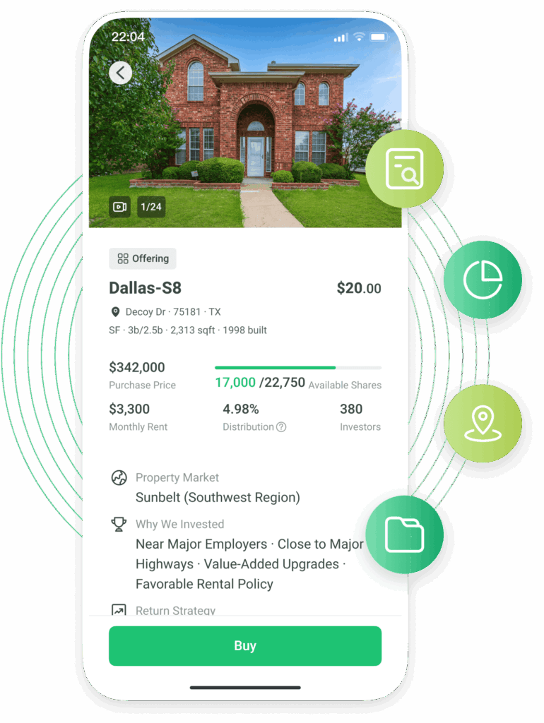 - 门槛超低,随时分散投资:$20就能买进美国热门城市房产股份,还能把资金分散到不同州、不同类型项目,降低风险。