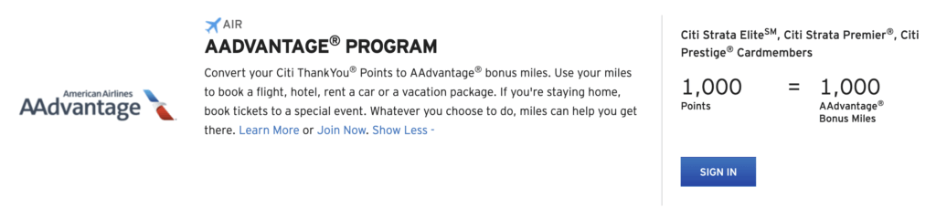 令人惊喜的是,目前 Citi 出现了一个新情况:有多张卡可以将 TYP 以 1:1 的比例转成 AA 里程 – Strata Elite, Strata Premier, Citi Prestige (已绝版)。
