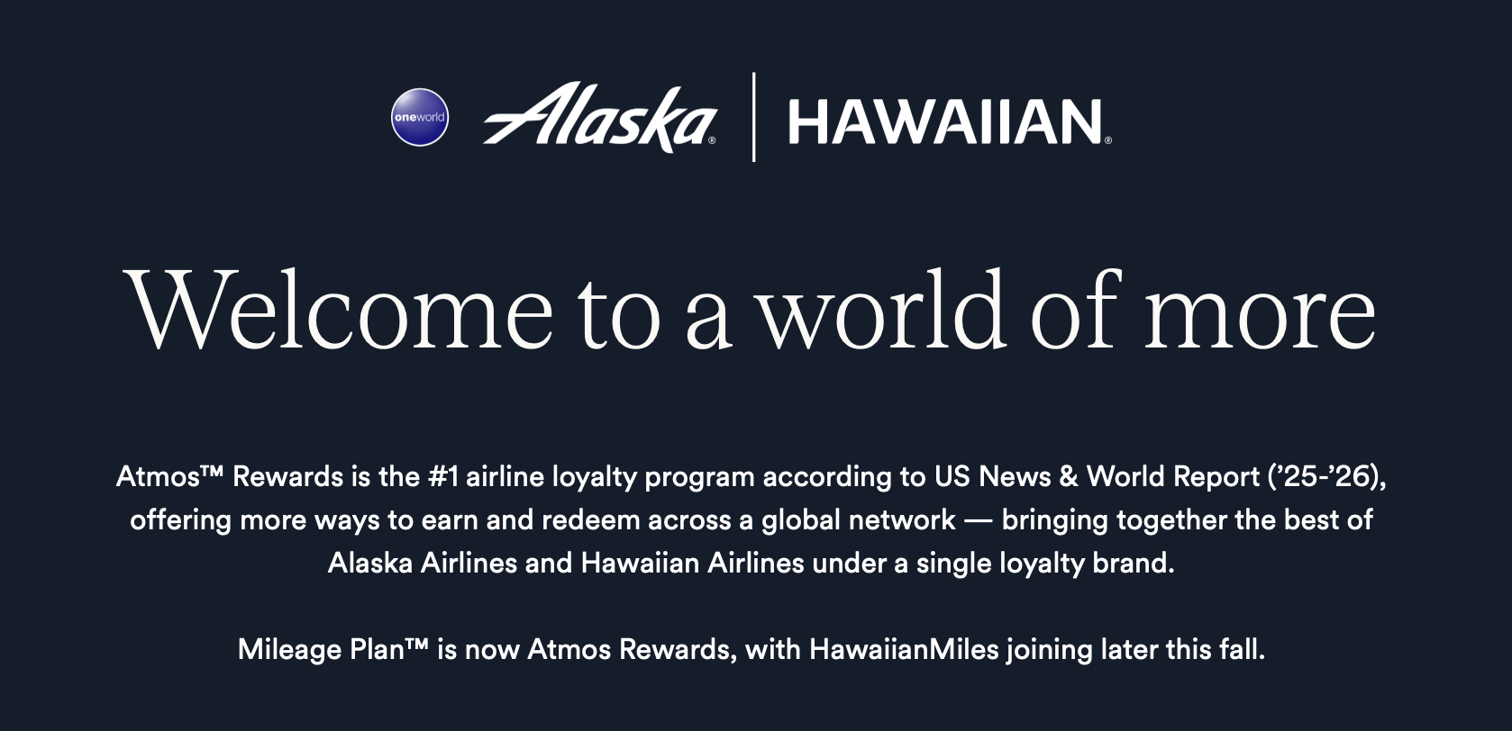 Alaska 发布了 Alaska Airlines 和 Hawaiian Airlines 通用的会员计划 Atmos Rewards,老的 Alaska MileagePlan 已经直接改为新的 Atmos Rewards 了,而 HawaiianMiles 要等到2025年10月才会完全合并进来。在2025年接下来的时间,新的 Atmos Rewards 将保留曾经的 MileagePlan 各项特性和福利,同时从2026年起,将主要有以下变动: