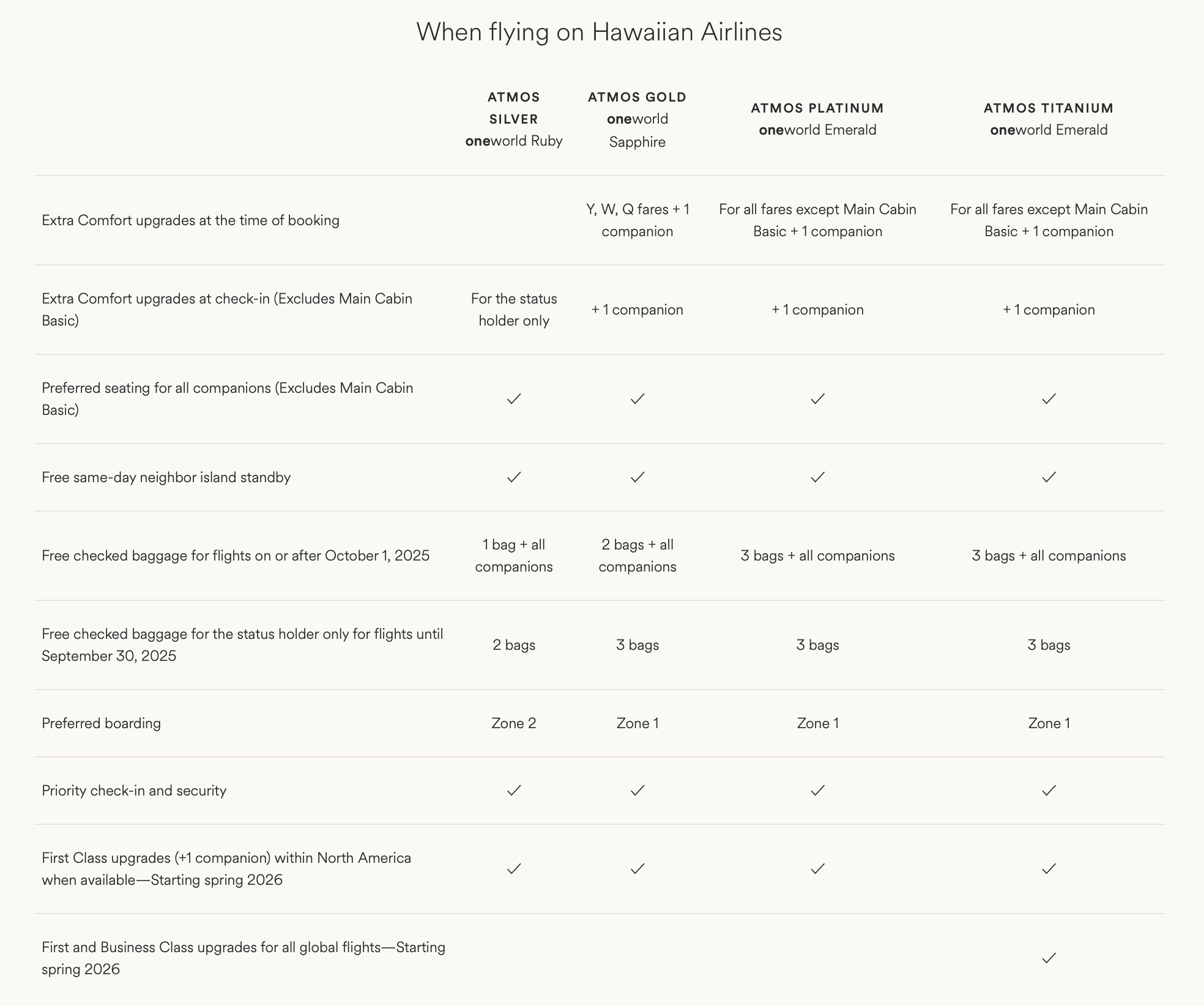 值得期待的是,随着 Alaska Airlines 也开始开通国际航线,从2026年起,Atmos Titanium 会员飞行 Alaska 国际航线时也有免费升舱福利(其他美国航司不提供长途国际航线会员免费升舱福利)。同样的,Atmos 钛金会员2026年期可在 Hawaiian Airlines 国际航线上享受免费升舱福利。