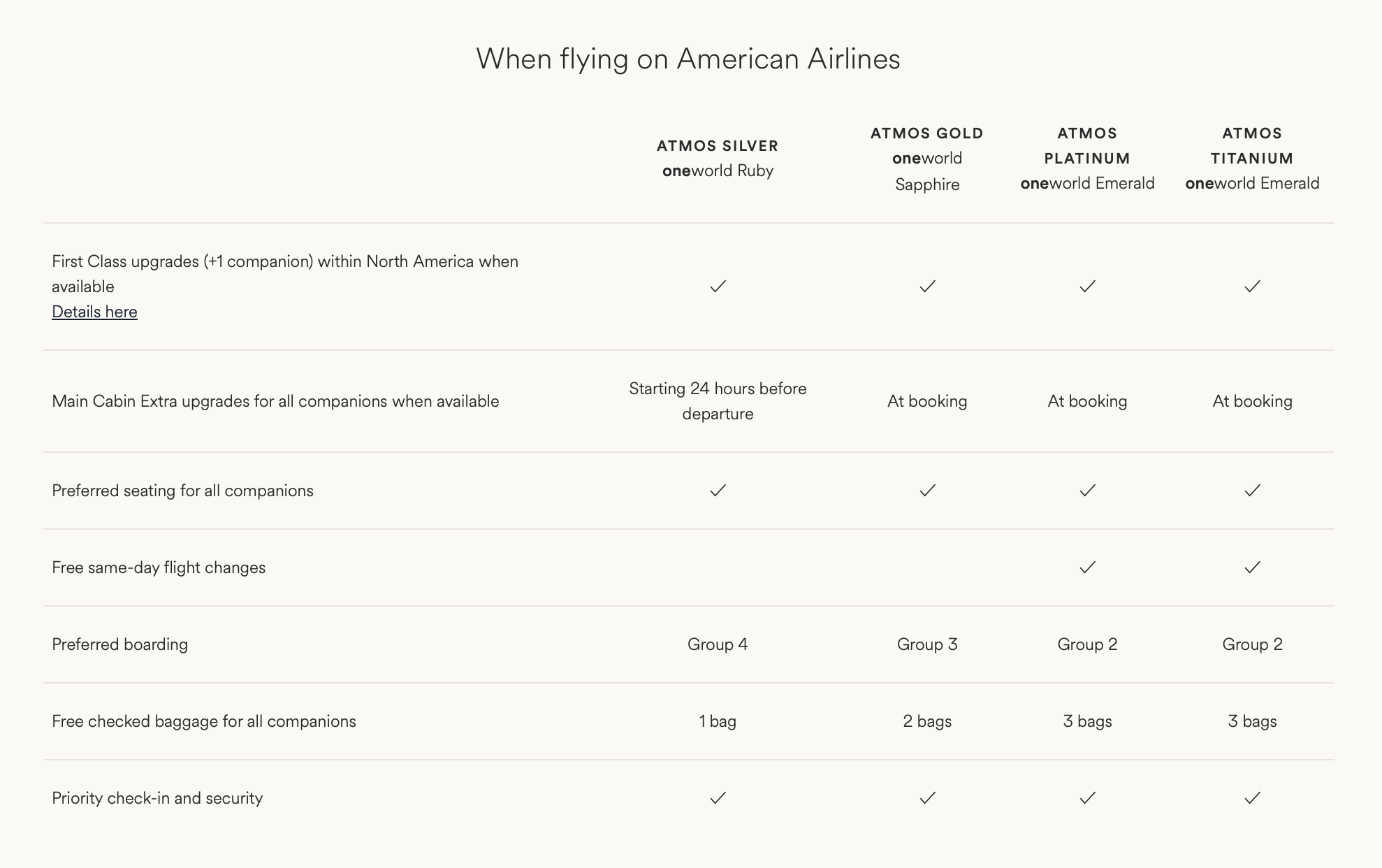 官网详细列出了 Atmos 会员在乘坐 Alaska Airlines, Hawaiian Airlines, American Airlines 和其他伙伴航司时的福利内容。