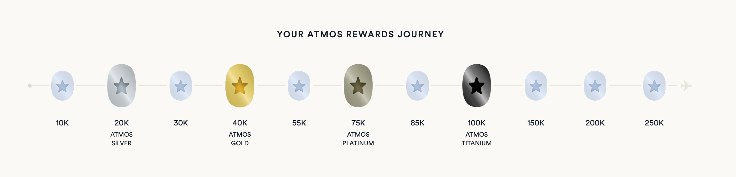 和之前的 MileagePlan 一样,除了达标会籍解锁福利,Atmos Rewards 系统还额外设置了7个级别的里程碑奖励,用户达标后可从每一级别的列表中选择奖励。里程碑奖励按照 status points 来计算。