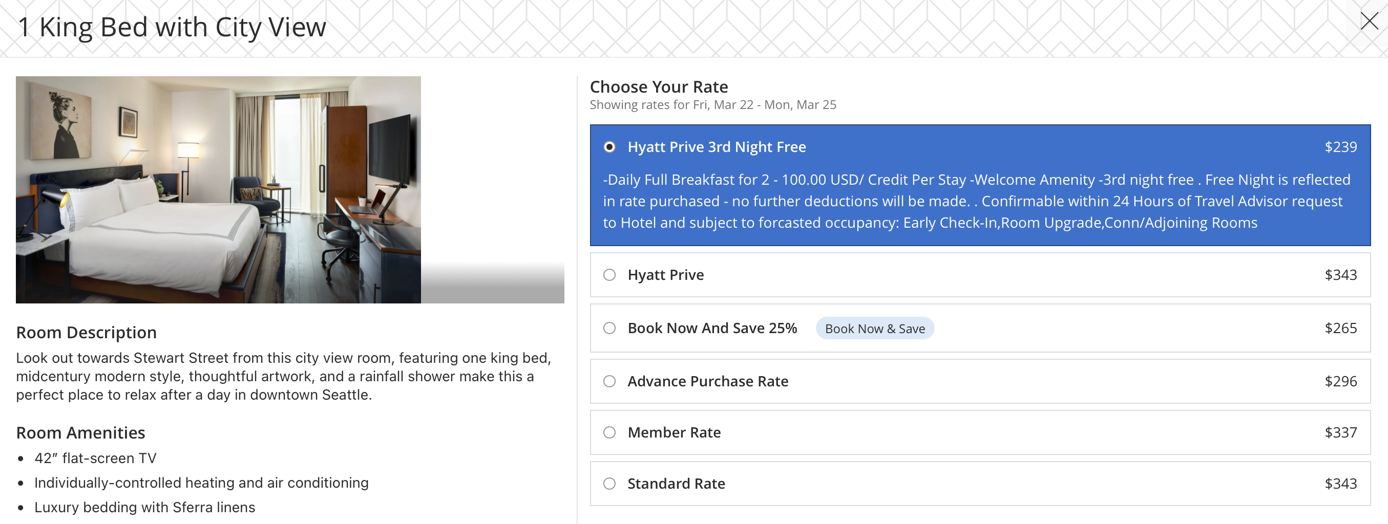 比如 Thompson Seattle 酒店现在就有 Privé 住二送一促销,这个促销价比其他 public rate 便宜多了。