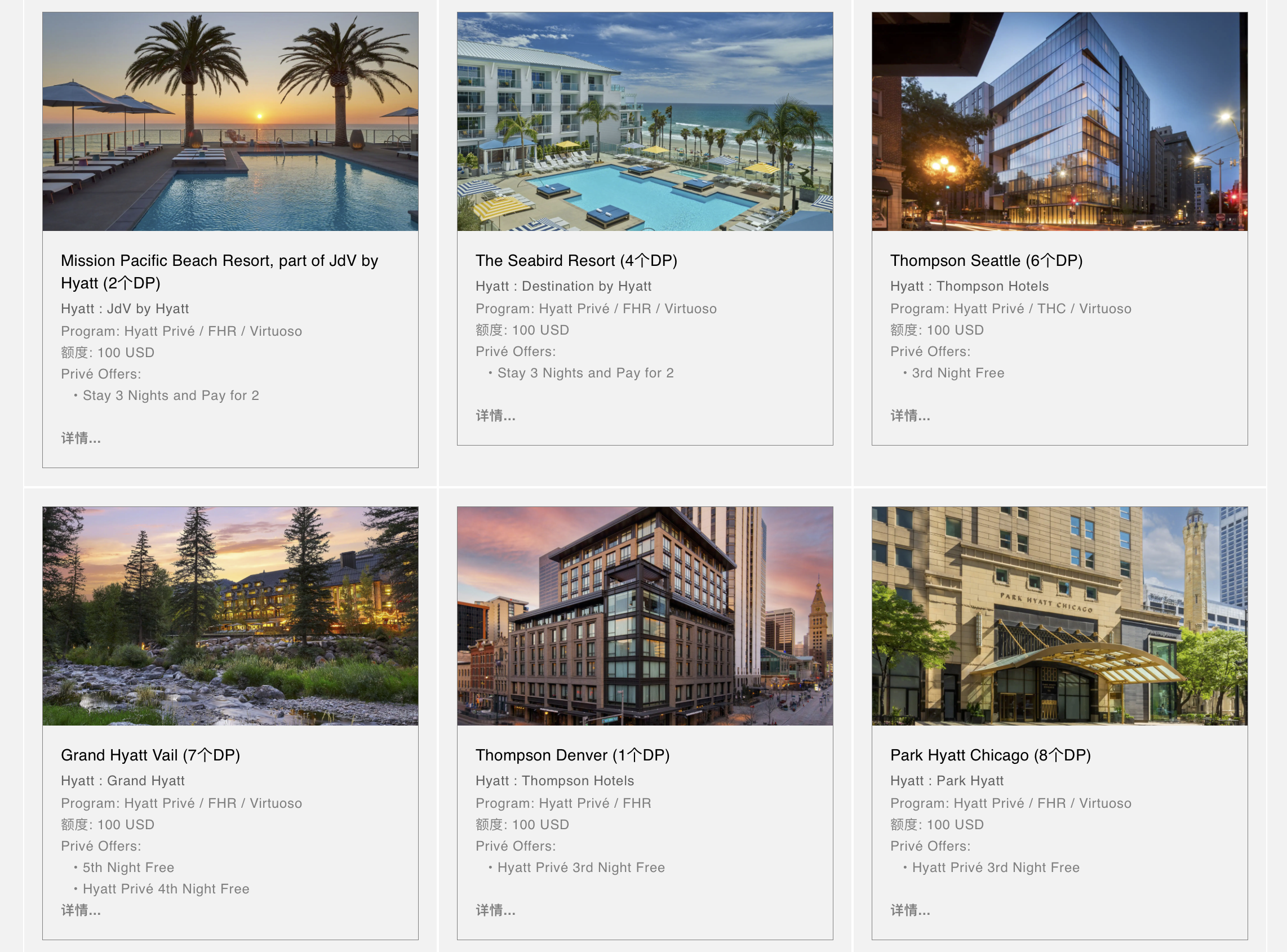 目前 Hyatt 自己没有一个公开的 Hyatt Privé 酒店列表,我们专门制作了一个 Hyatt Privé 地图(见第4小节),包含了当前的 Hyatt Privé 酒店列表,以及:最低入住晚数,消费额度,是否有 Hyatt Privé 促销等信息。