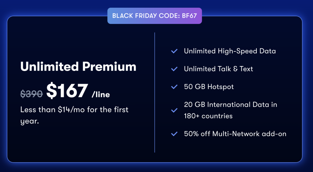 US Mobile 推出一项黑五限时优惠:使用优惠码 BF67 时,可将 12 个月服务费用锁定为 US$167。11.27开始可以买。