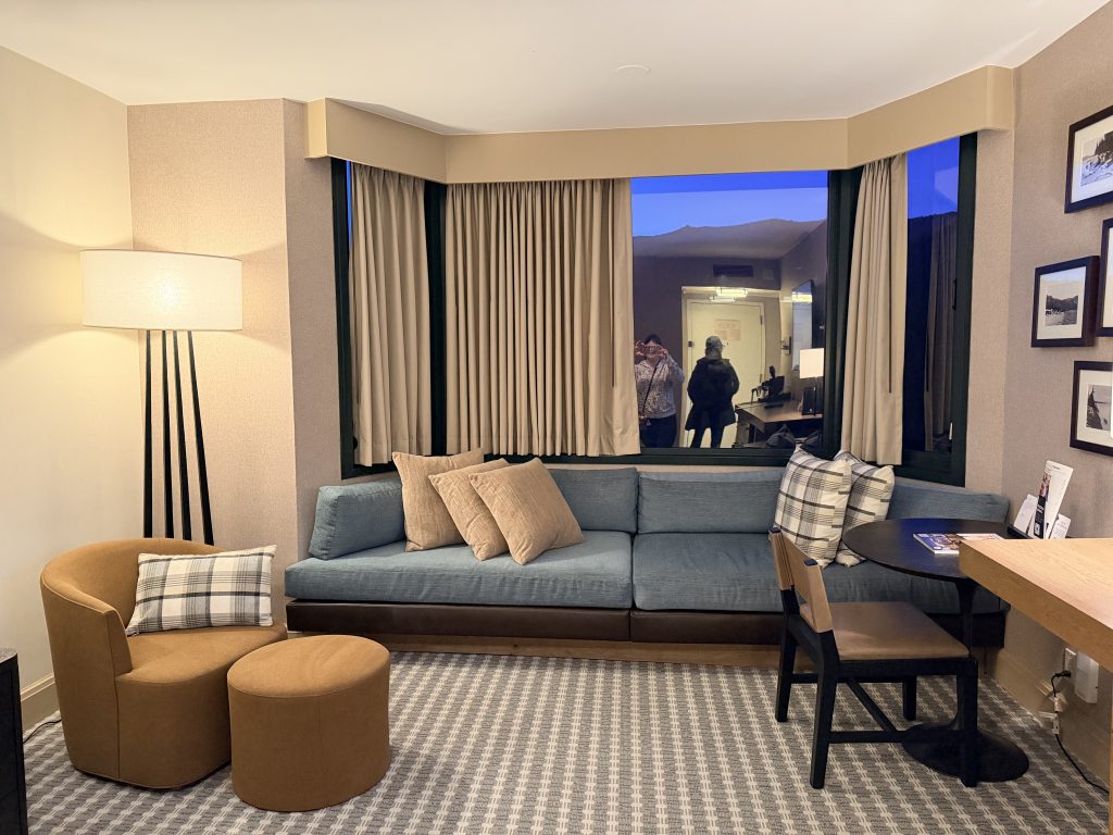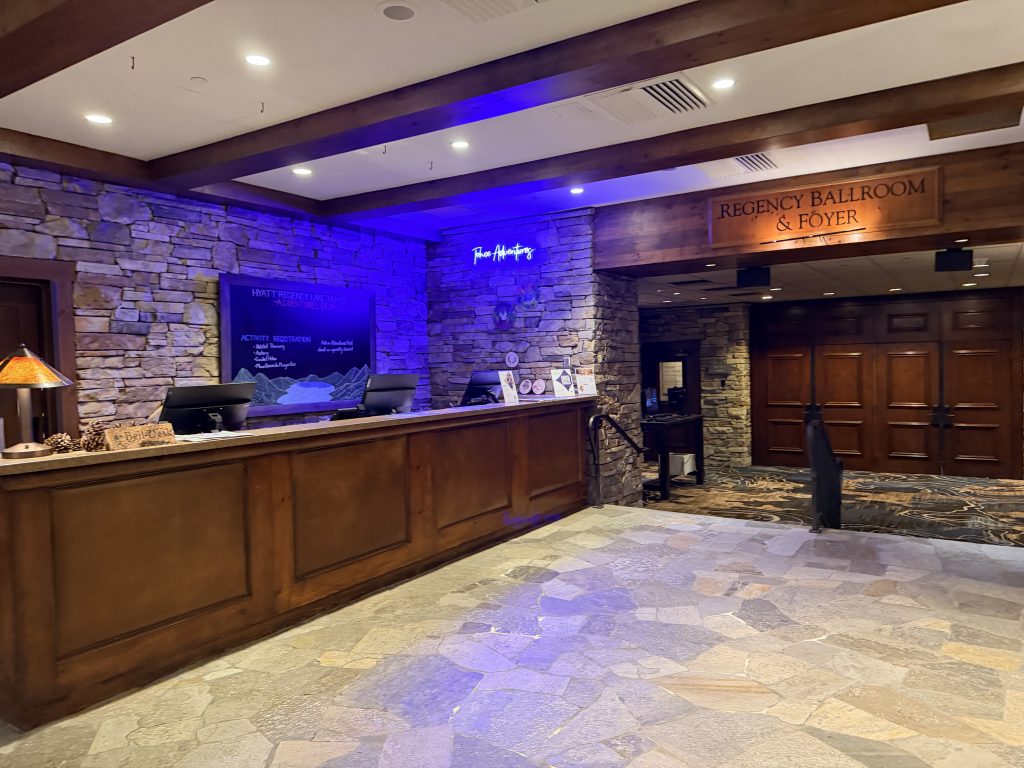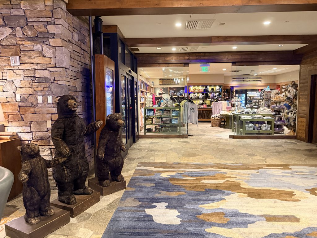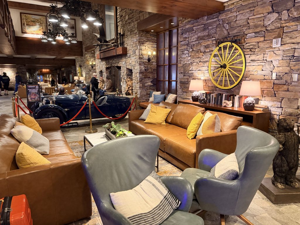 酒店提供「代客泊車」服務,一晚要價$50美金,也可以自助停車,一晚要價$29美金。若持有「環球客」會籍時,停車可享半價優惠。大廳內的設計很有山林度假的氛圍,挑高的天花板搭配巨大的石砌壁爐,大量運用原木和石材元素,還有大熊雕像向你打招呼。辦理入住手續時,服務人員態度格外友善,可惜當天因為入住房客全滿的關係,所以沒辦法升等到更好的房型。辦理完入住手續後,可以一人選擇一個酒精飲料當作迎賓禮,除了有香檳之外,也有當地的啤酒可以選擇。