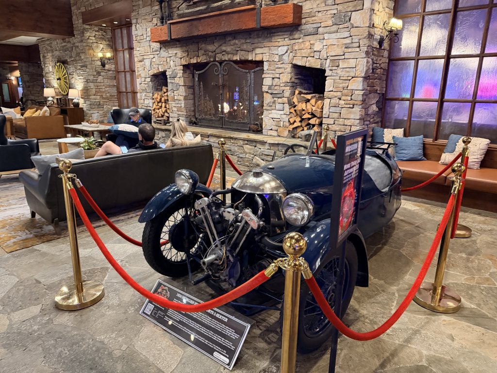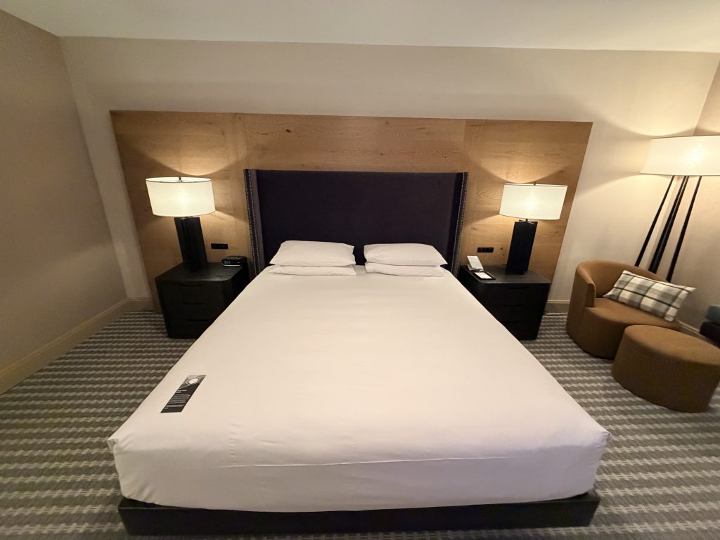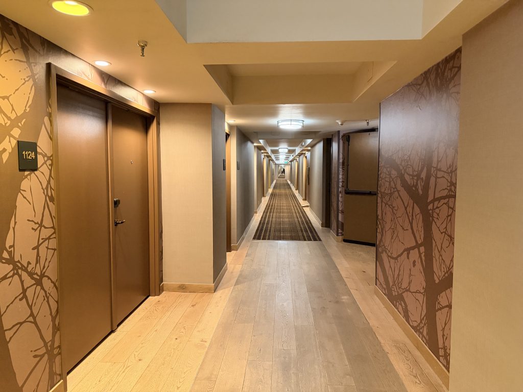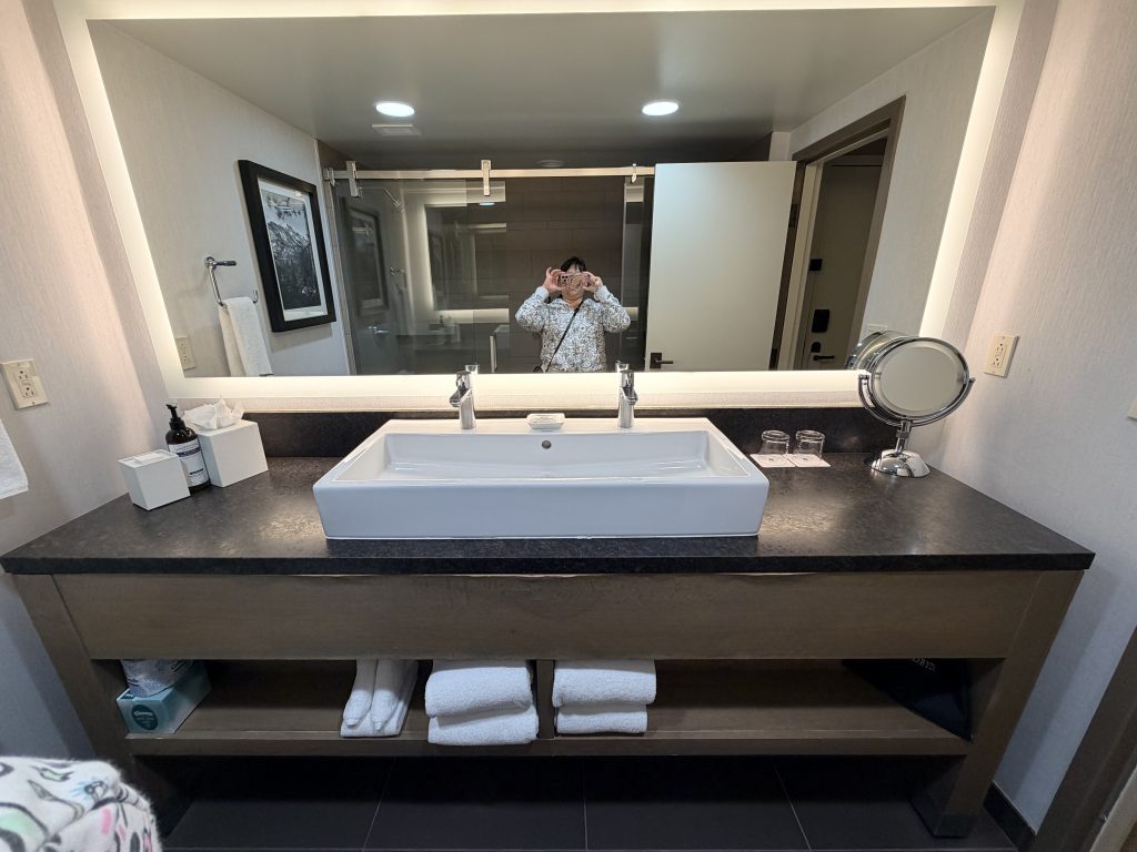 酒店提供「代客泊車」服務,一晚要價$50美金,也可以自助停車,一晚要價$29美金。若持有「環球客」會籍時,停車可享半價優惠。大廳內的設計很有山林度假的氛圍,挑高的天花板搭配巨大的石砌壁爐,大量運用原木和石材元素,還有大熊雕像向你打招呼。辦理入住手續時,服務人員態度格外友善,可惜當天因為入住房客全滿的關係,所以沒辦法升等到更好的房型。辦理完入住手續後,可以一人選擇一個酒精飲料當作迎賓禮,除了有香檳之外,也有當地的啤酒可以選擇。