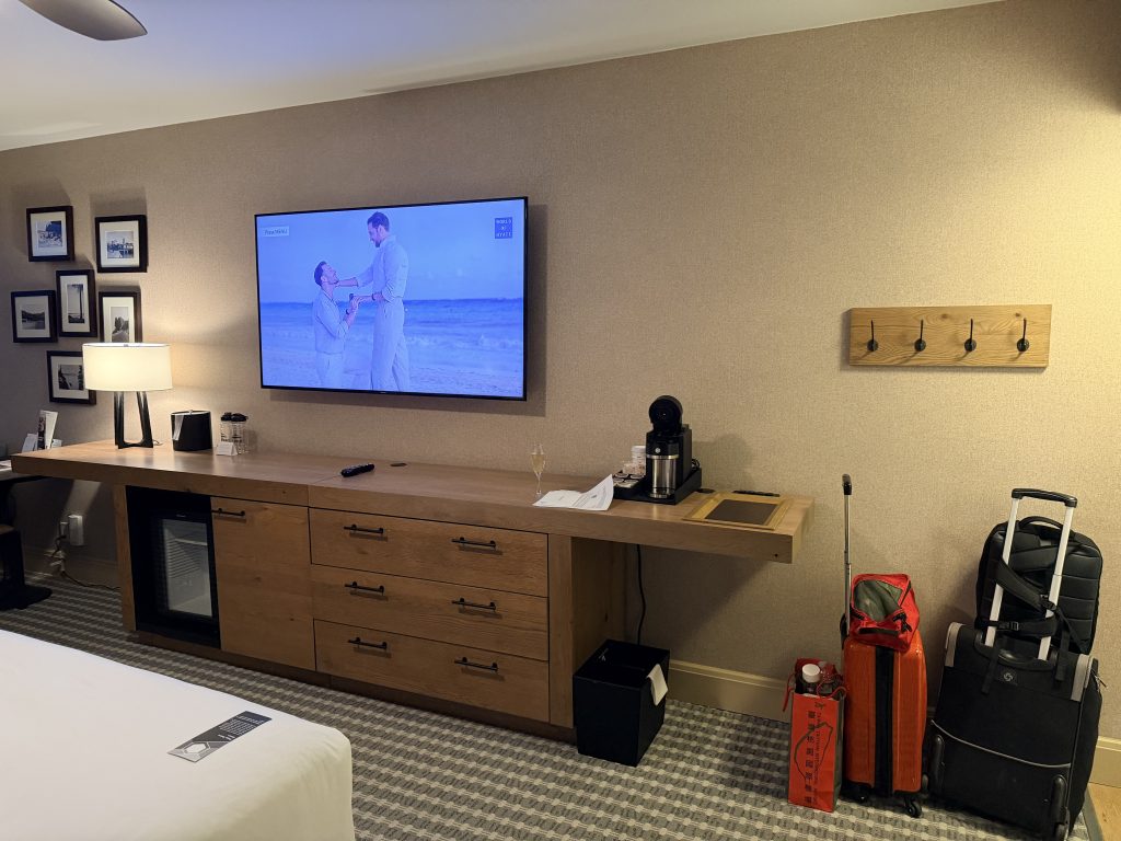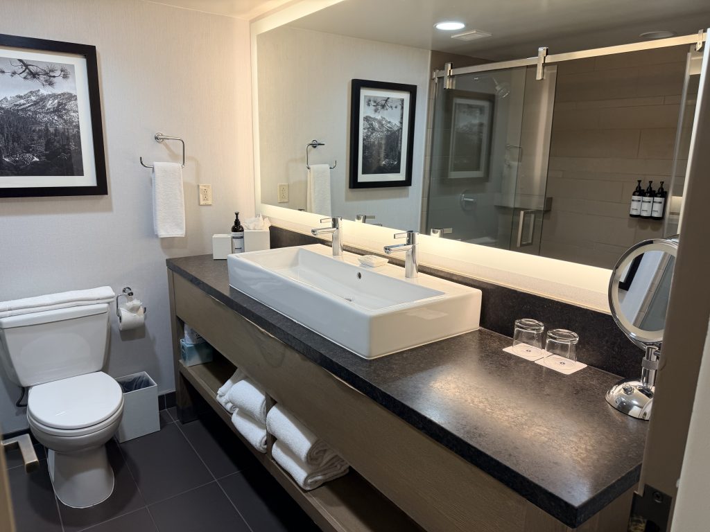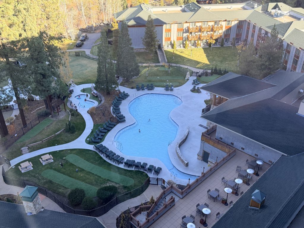 這次入住的是面向游泳池的一般房型,基本房型有400平方英呎,雖然不是直接面對太浩湖的湖景房,但房間內的設計依然讓人感到舒適愜意。牆上以太浩湖自然景觀為主題的藝術作品,讓整個空間充滿了在地的故事感,從窗戶望出去時,可以看見渡假村的游泳池,雖然景觀不像是湖景房那般震撼,但游泳池周圍綠意盎然的造景,也別有一番渡假風情。
