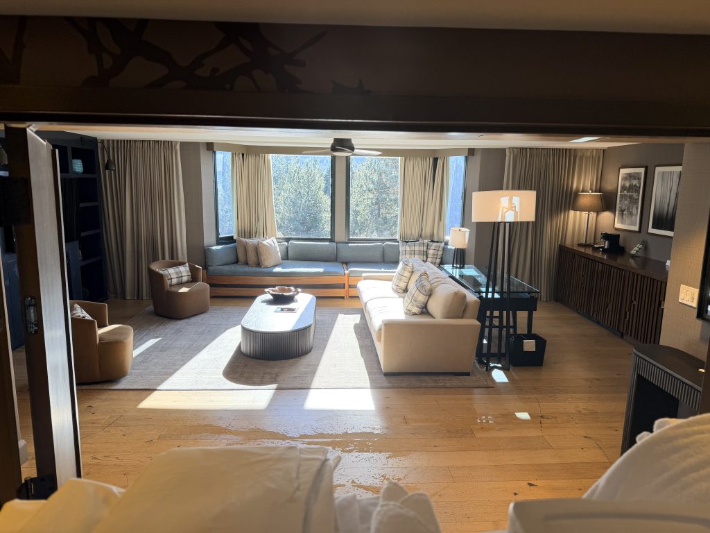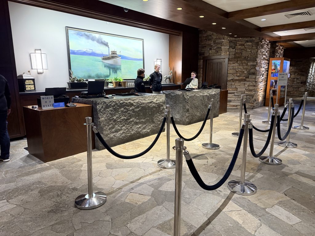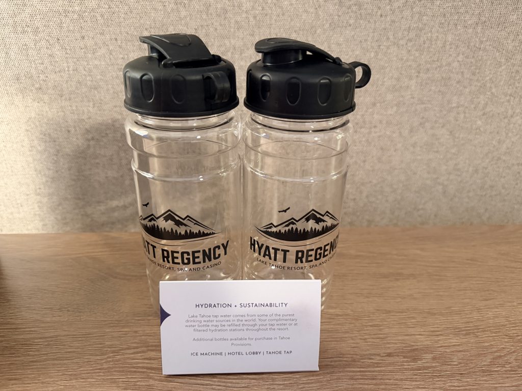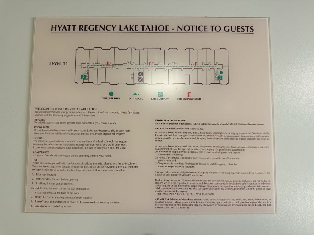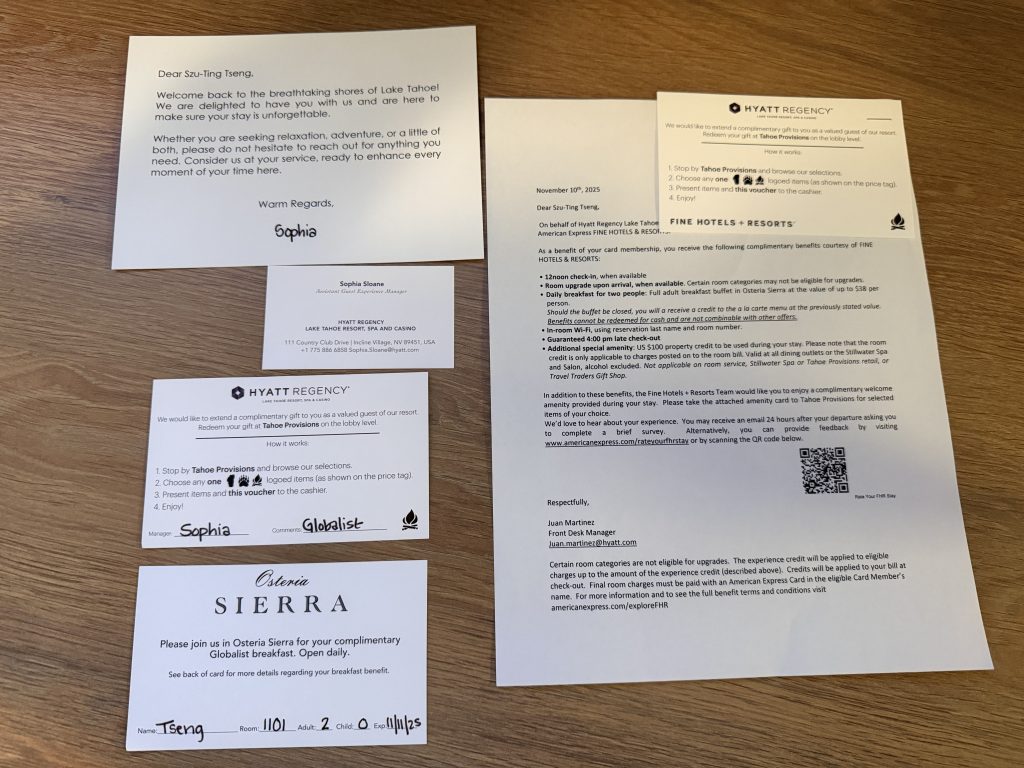 這間屬於凱悅集團 (Hyatt) 旗下的「等級五」渡假村,使用點數兌換的話,平常是每晚20,000點,另外入住時通常會額外收取$50美金的「渡假村費用」(Resort Fee),不過因為我持有凱悅集團「環球客」會籍的關係,所以不會收取這項費用。這個「渡假村費用」在夏季與冬季時節,有提供不同的服務,在任何季節都有提供免費接駁車往返附近小鎮「Incline Village」之外,還有提供迎賓飲料,$5美金的賭場退額補助,游泳池/按摩水池的使用,以及各式健身課程跟渡假村活動等等。而在夏季的時候,還有提供接駁車往返「Incline Village」小鎮的特定沙灘,並且提供沙灘入場券,也可以免費使用一小時獨木舟,或是優先租借汽艇等等服務。至於在春/秋/冬季時,則是有提供雪鞋探險,導覽登山,免費雪鞋借用,免費「GoPro」攝影機借用,以及前往附近滑雪勝地「Diamond Peak Ski Resort」的接駁車等等服務。