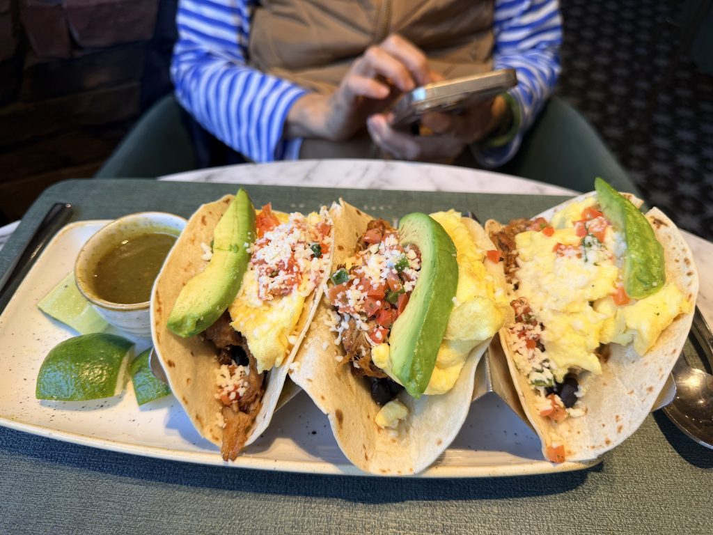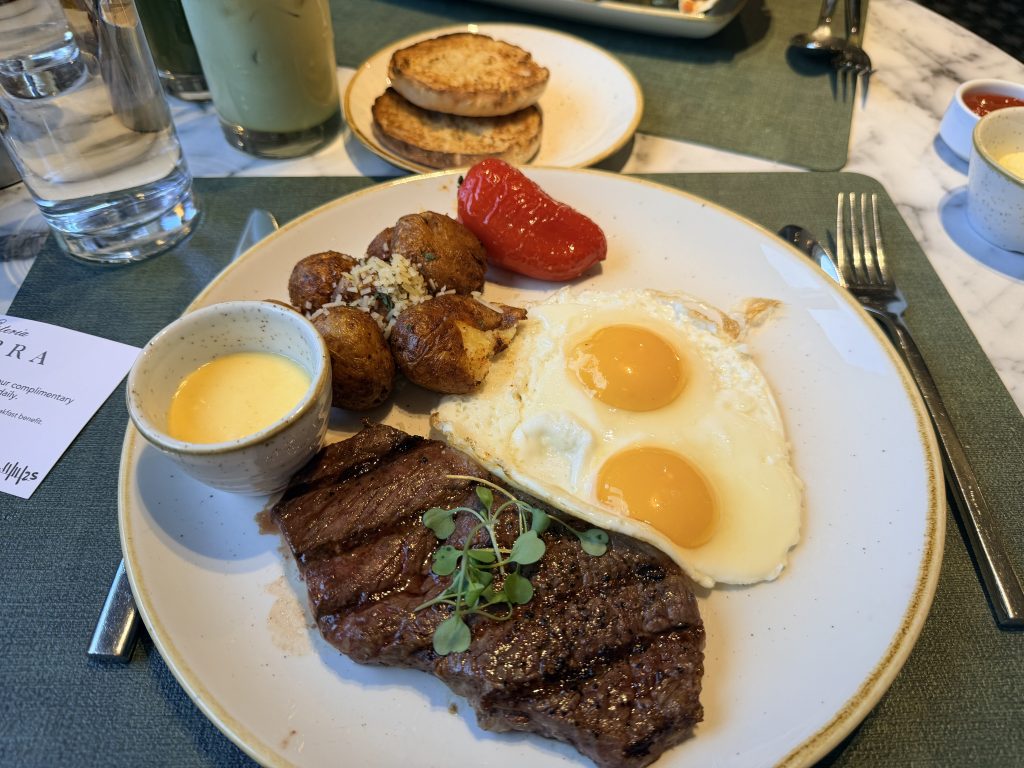 而早餐也是由這間餐廳提供,服務人員讓我們在現場可以使用給予凱悅集團「環球客」會籍的兌換券用餐,就可以任意點選一份主菜加上飲料,若是使用「FHR」訂房功能所給予早餐福利,只有每人$38美金的額度。