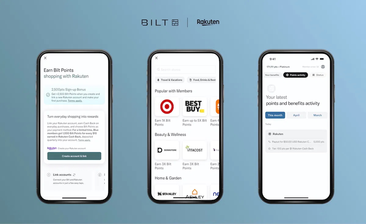 - 從11/6/2025開始,在初始的六個月之內,所有的Bilt Rewards點數系統會員都可以獲得1:1的回饋轉換比率,也就是每$10美金的Rakuten網站的現金回饋,就相當於1,000點的Bilt Rewards點數