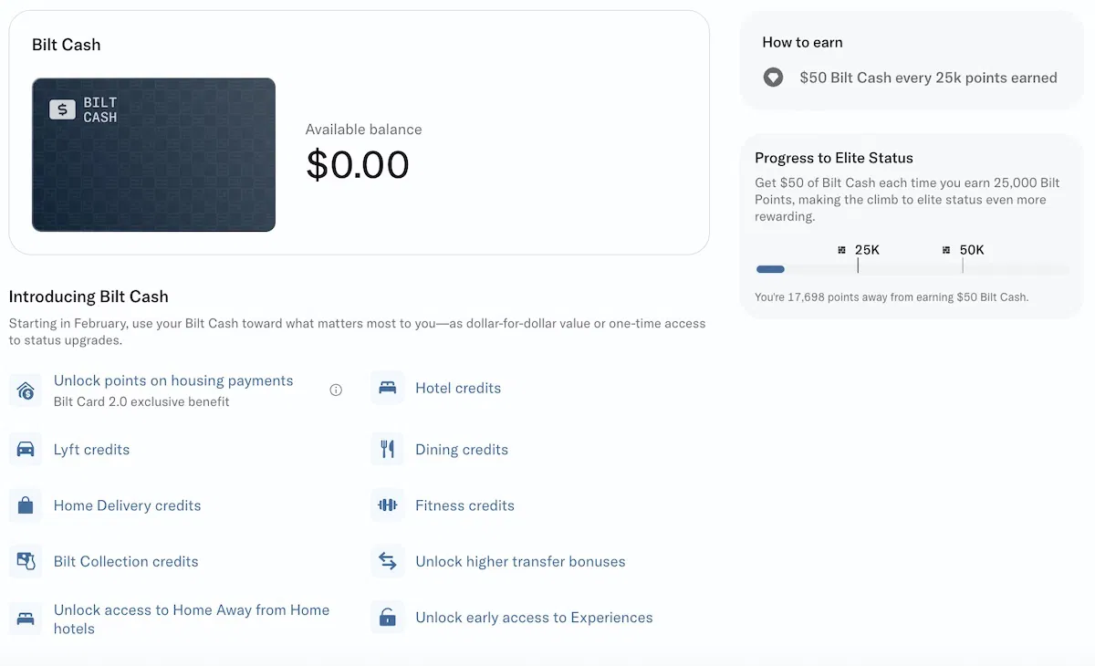 這邊要特別說明一點,在每年1/1~6/30之間獲得足夠點數而升級/保級的朋友,會籍有效日期到隔年的1/31為止,而在每年7/1~12/31之間獲得足夠點數而升級/保級的朋友,會籍有效日期則是到隔年的12/31為止。另外,在2026年二月時,也正式推出「Bilt Cash」獎勵金的制度,除了下一段篇幅會提到的,透過聯名信用卡可獲得「Bilt Cash」獎勵金之外,透過任何方式每獲得25,000點的時候,也會同時獲得$50美金的「Bilt Cash」獎勵金制度,至於「Bilt Cash」獎勵金的詳細使用方式,請參考這篇文章(點我)。