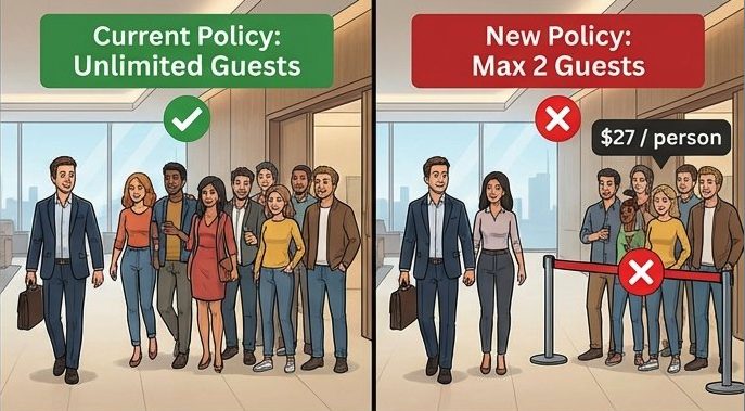 - 更新規定: 從1/15/2026開始,持卡人及副卡持有人只可透過新貴通會員卡,攜帶「最多2位」的同行旅伴,免費進入全世界合作的貴賓室,超出的人數將以每人$27美金的標準收費