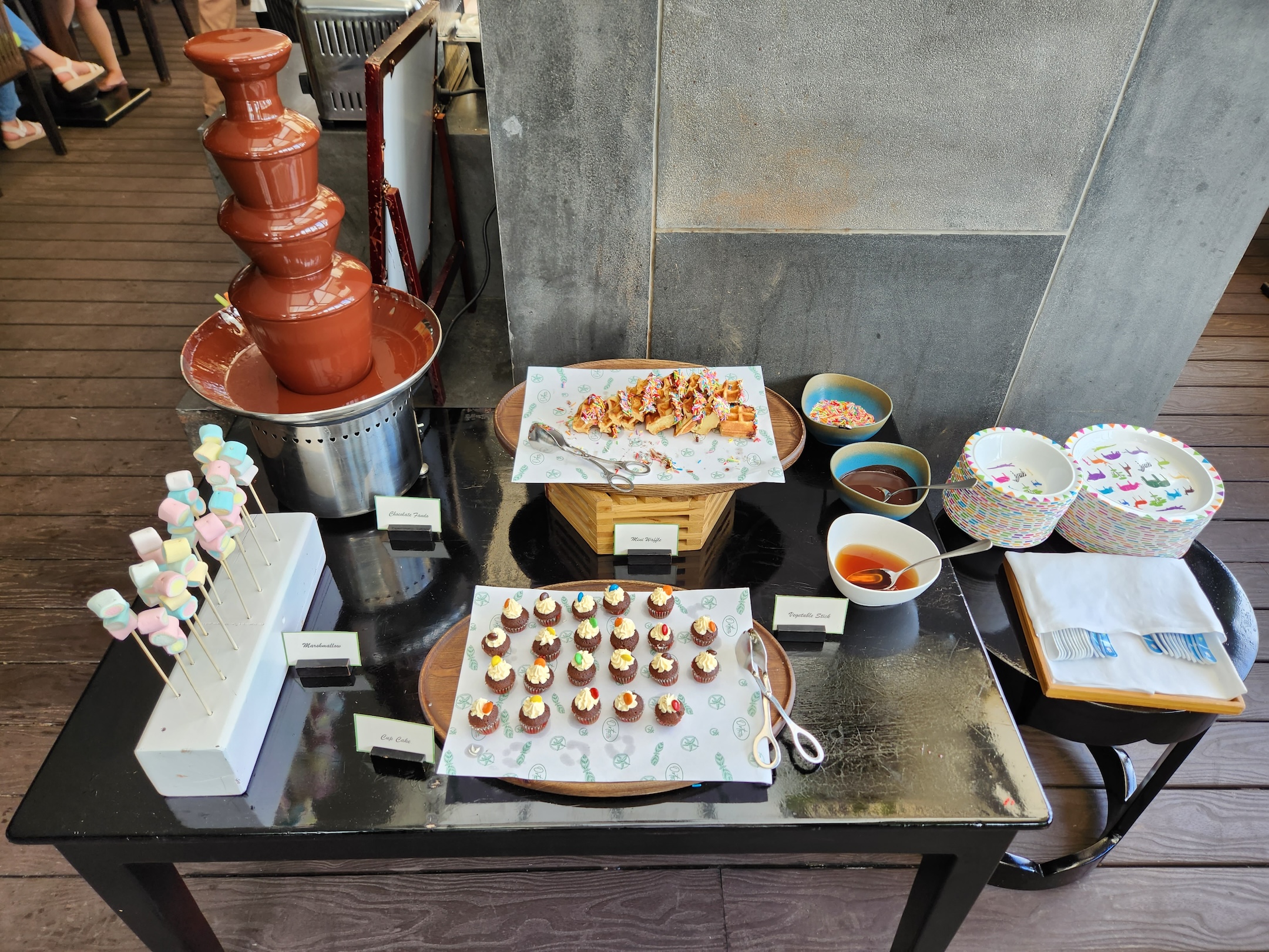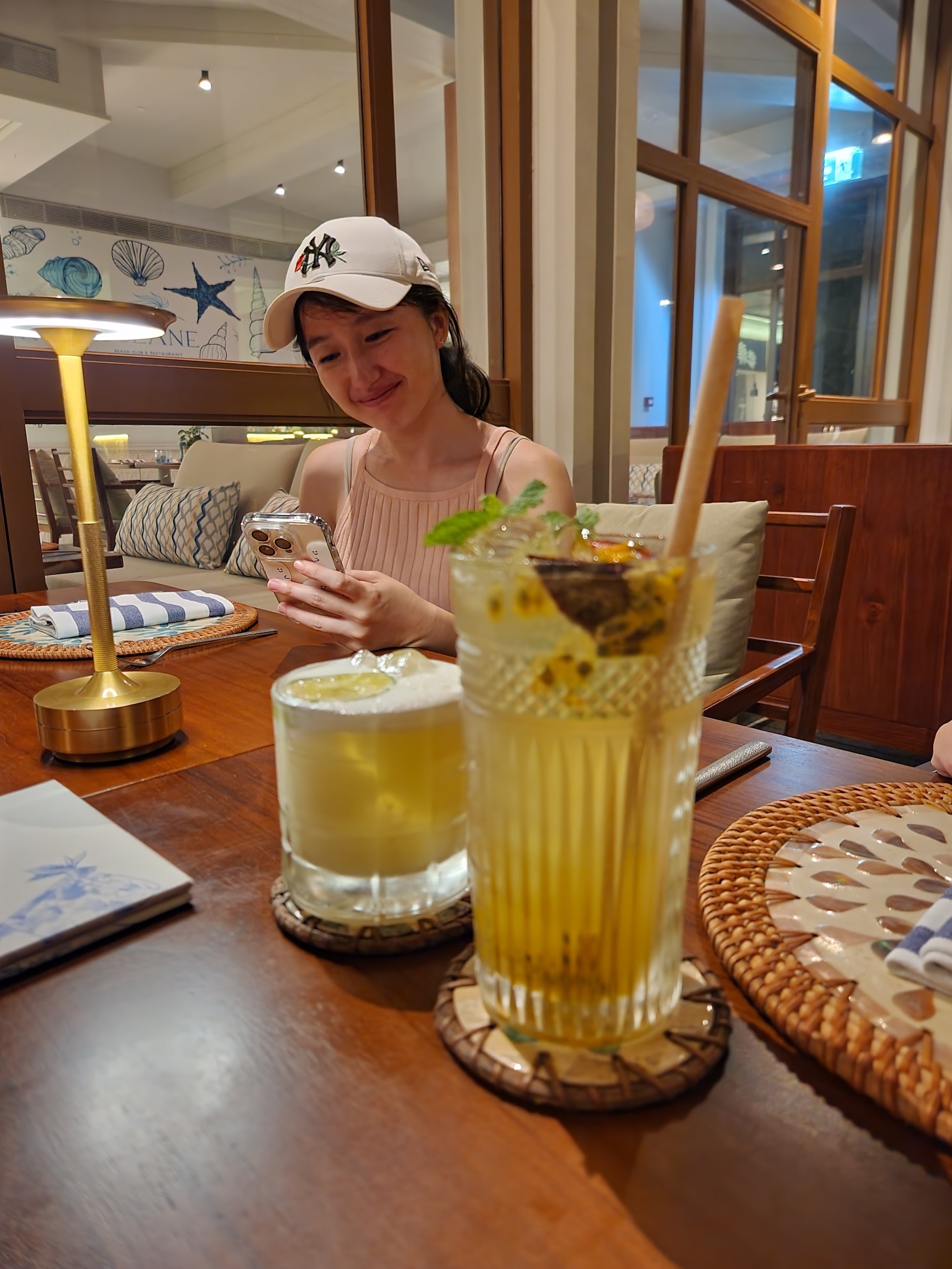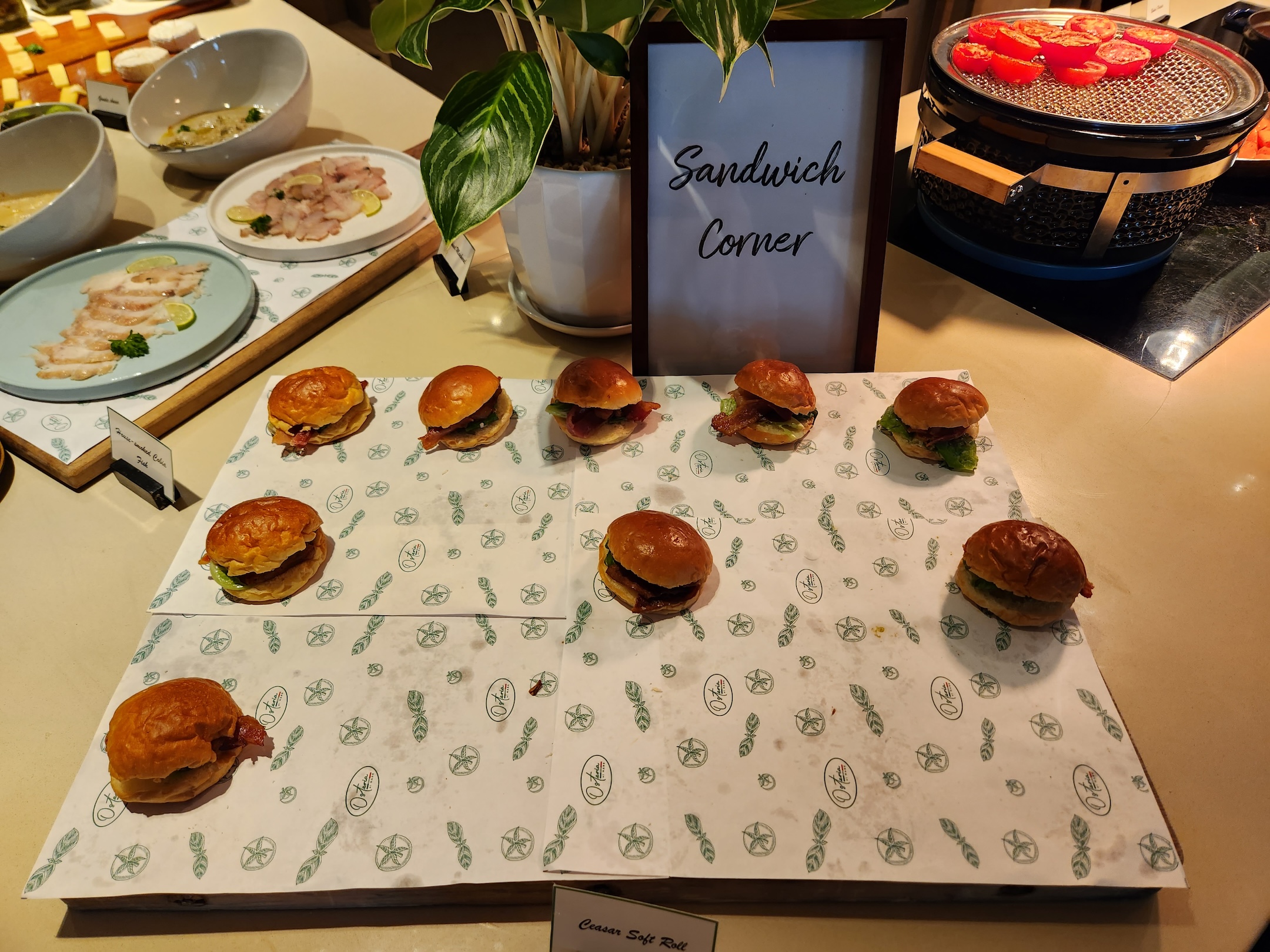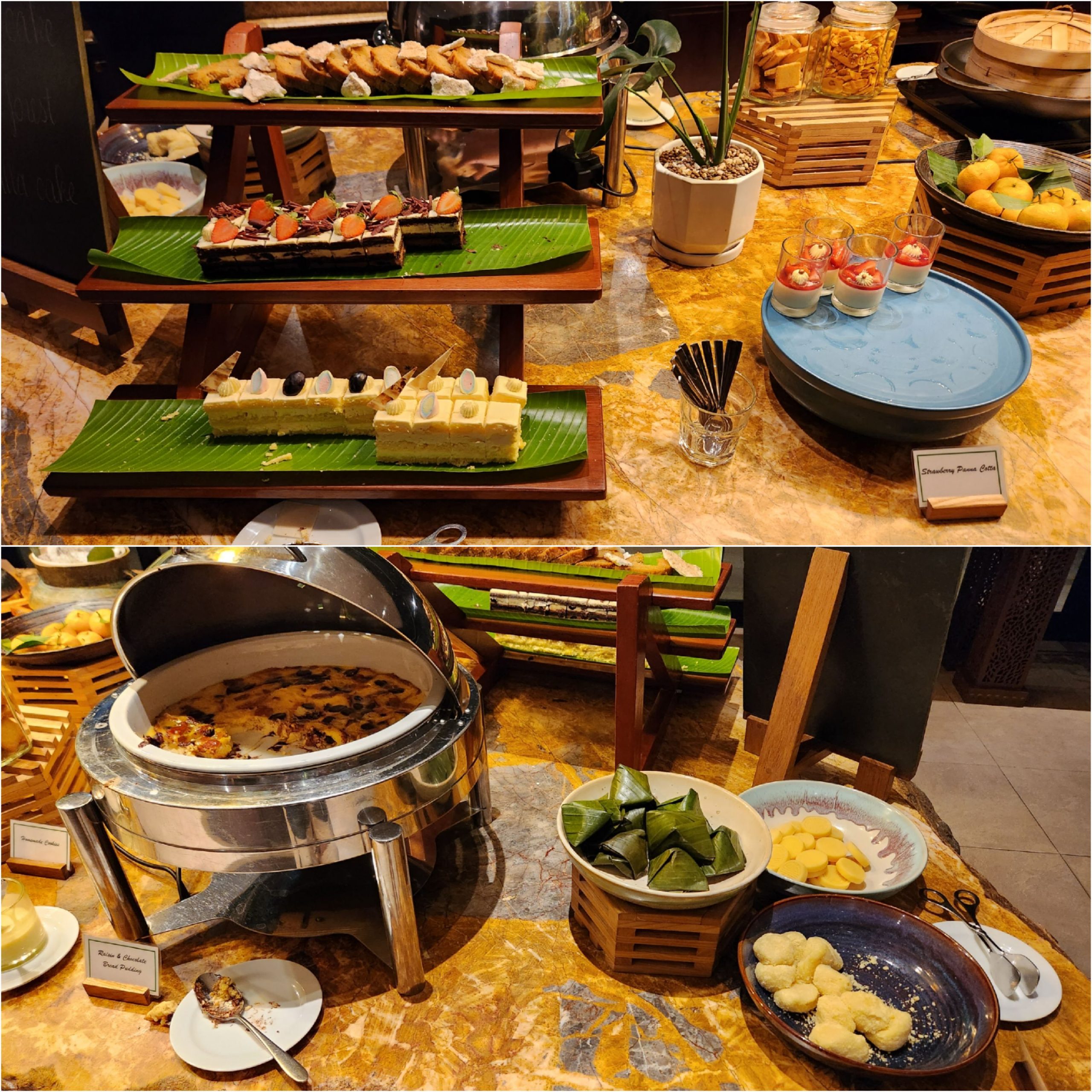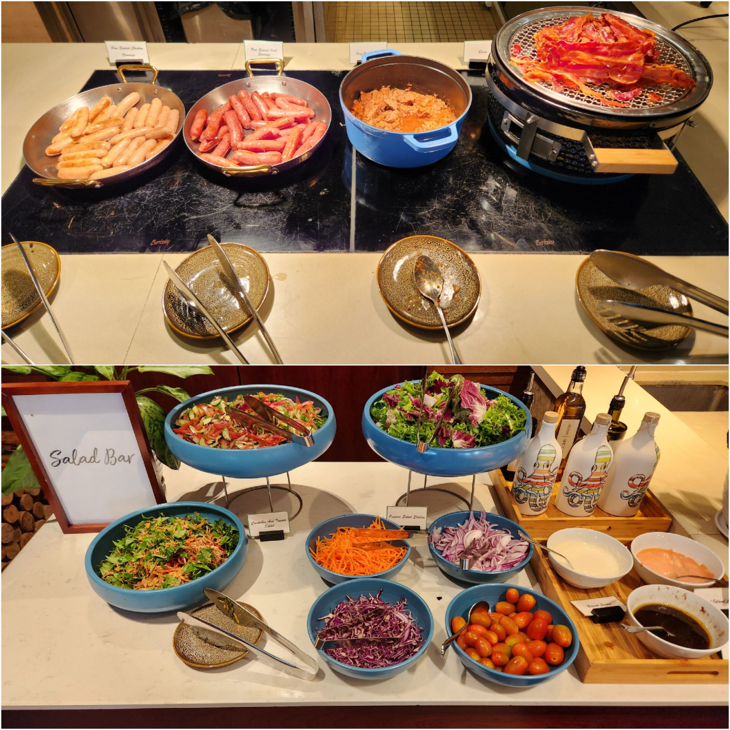 而到了黃昏的時刻,嘉賓軒內則是有提供「歡樂時光」時段的餐飲服務,會擺放一些熱食/沙拉/甜點/酒精飲料等等的選擇。雖然峴港當地也有很多美食,在晚餐時段絕對值得出外品嚐一下,不過某幾天剛好遇到下雨,而且是大暴雨的時刻,因此留在渡假村裡面用餐,也是很不錯的。就讓我透過以下的照片,讓讀者們參考一下「歡樂時光」時段的一些餐飲供應。