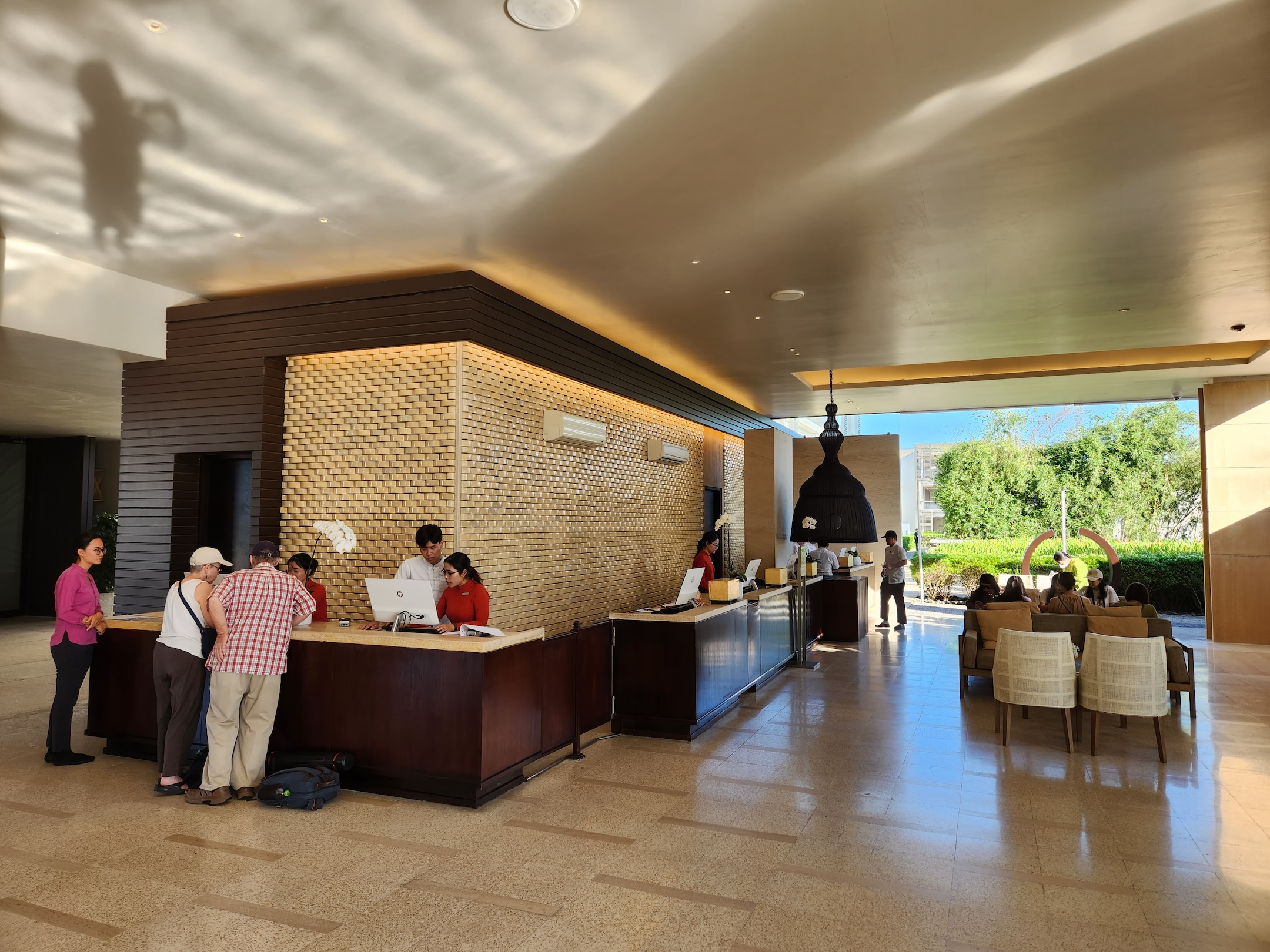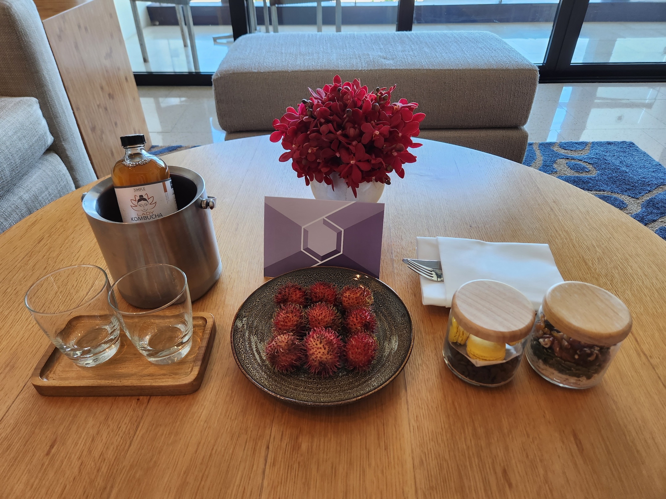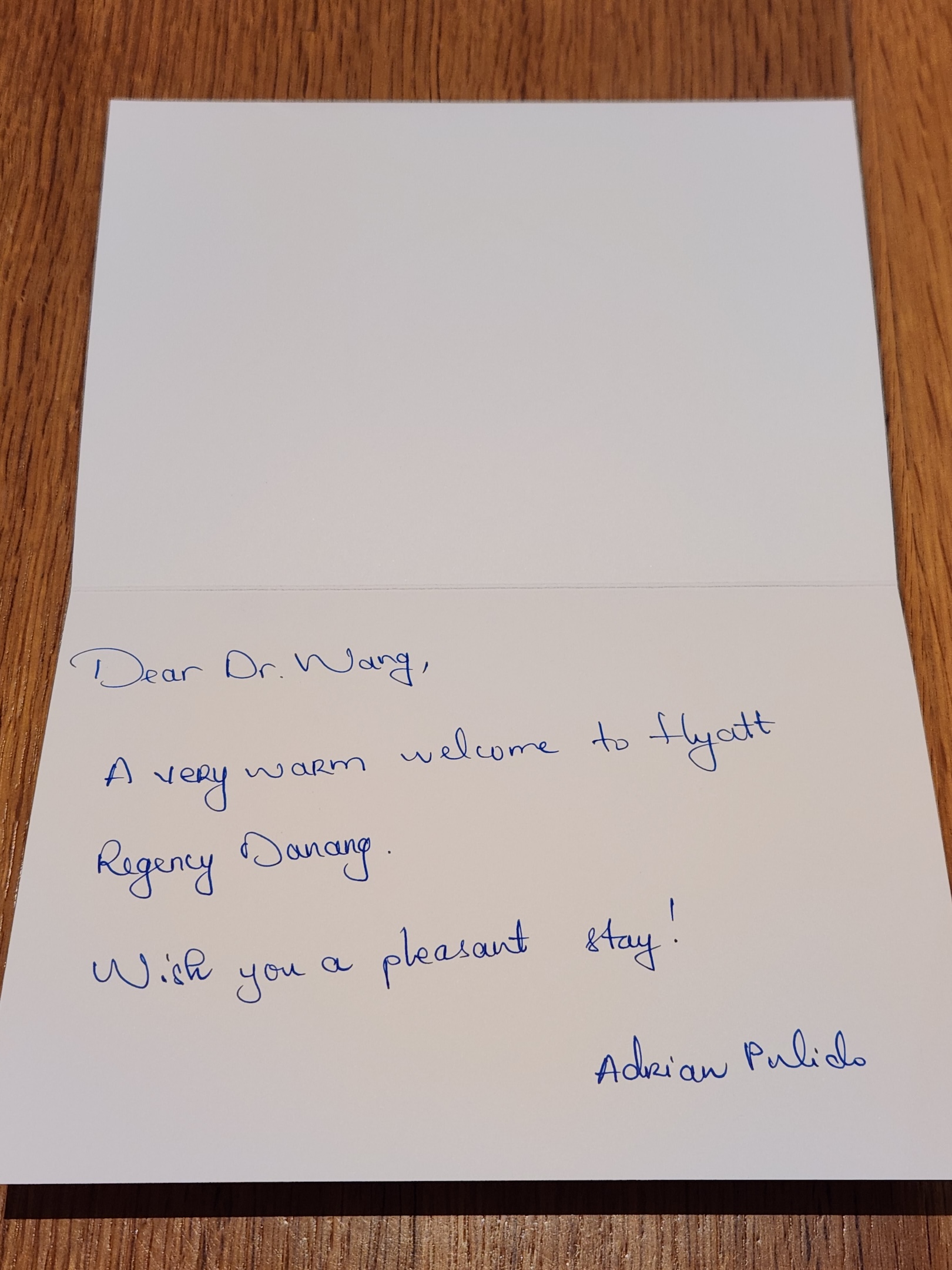 雖然出遊的時間是11月,但是越南中部的天氣依舊炎熱,還好持有「環球客」(Globalist) 會籍的話,可以不用在沒有冷氣的大廳內進行Check-In的手續,而是可以前往「嘉賓軒」(Regency Club) 辦理。而我在入住之前,也使用了「套房升等券」(Suite Upgrade Award) 來升等這次的住宿,服務人員確認了我的護照與信用卡,也同時確認了我這次入住的「套房」訂位紀錄,接著就讓其他的服務人員拿著我的行李,一路帶領著我前往我的房間,真的能夠感受到「環球客」會籍的尊絕不凡,也算是給了我相當好的第一印象。