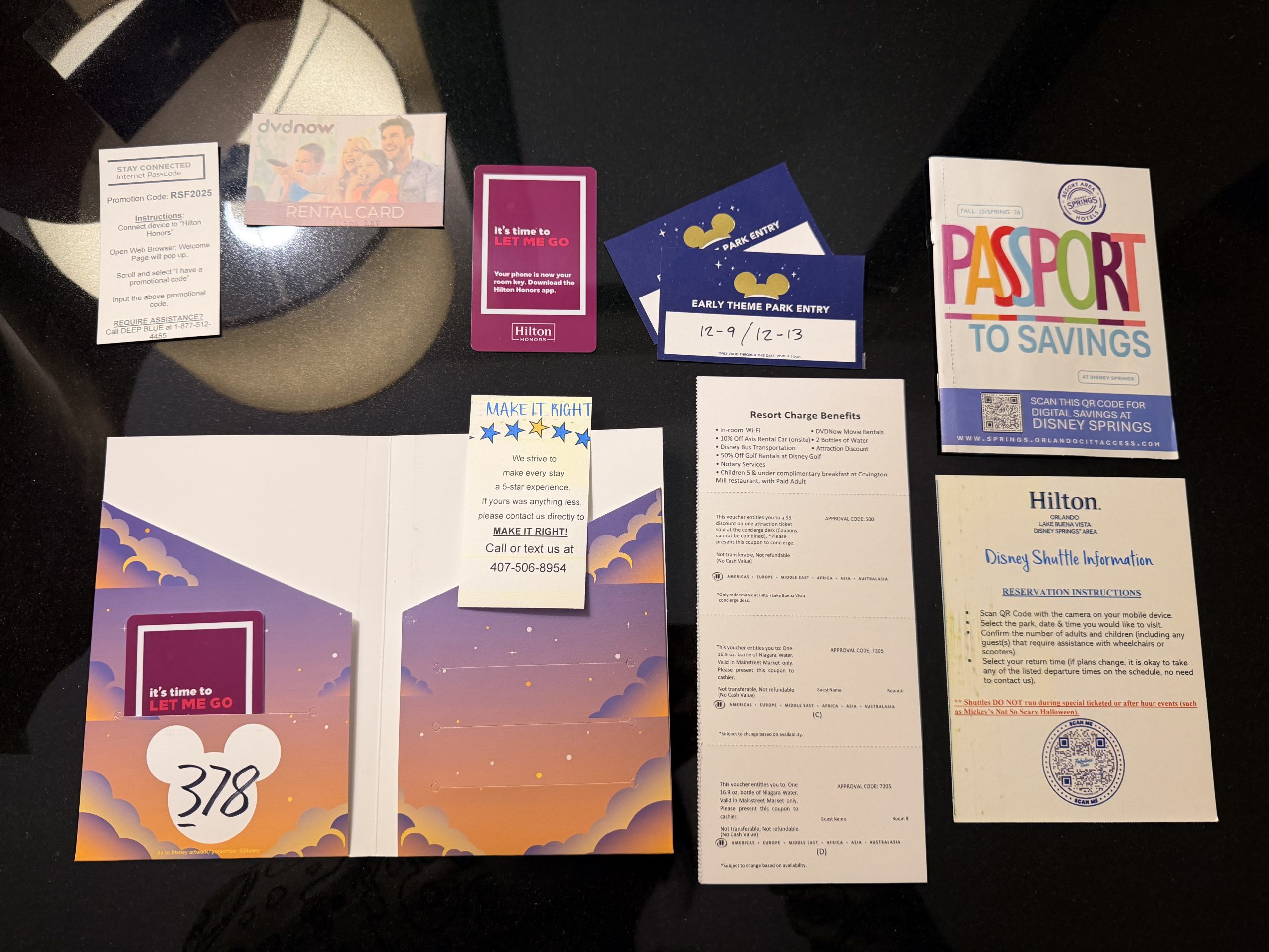 辦理入住時獲得了很多東西,包括房卡,提早入園券,渡假村費用 (Resort Fee) 支付說明券,還有「迪士尼泉」區的優惠券等等