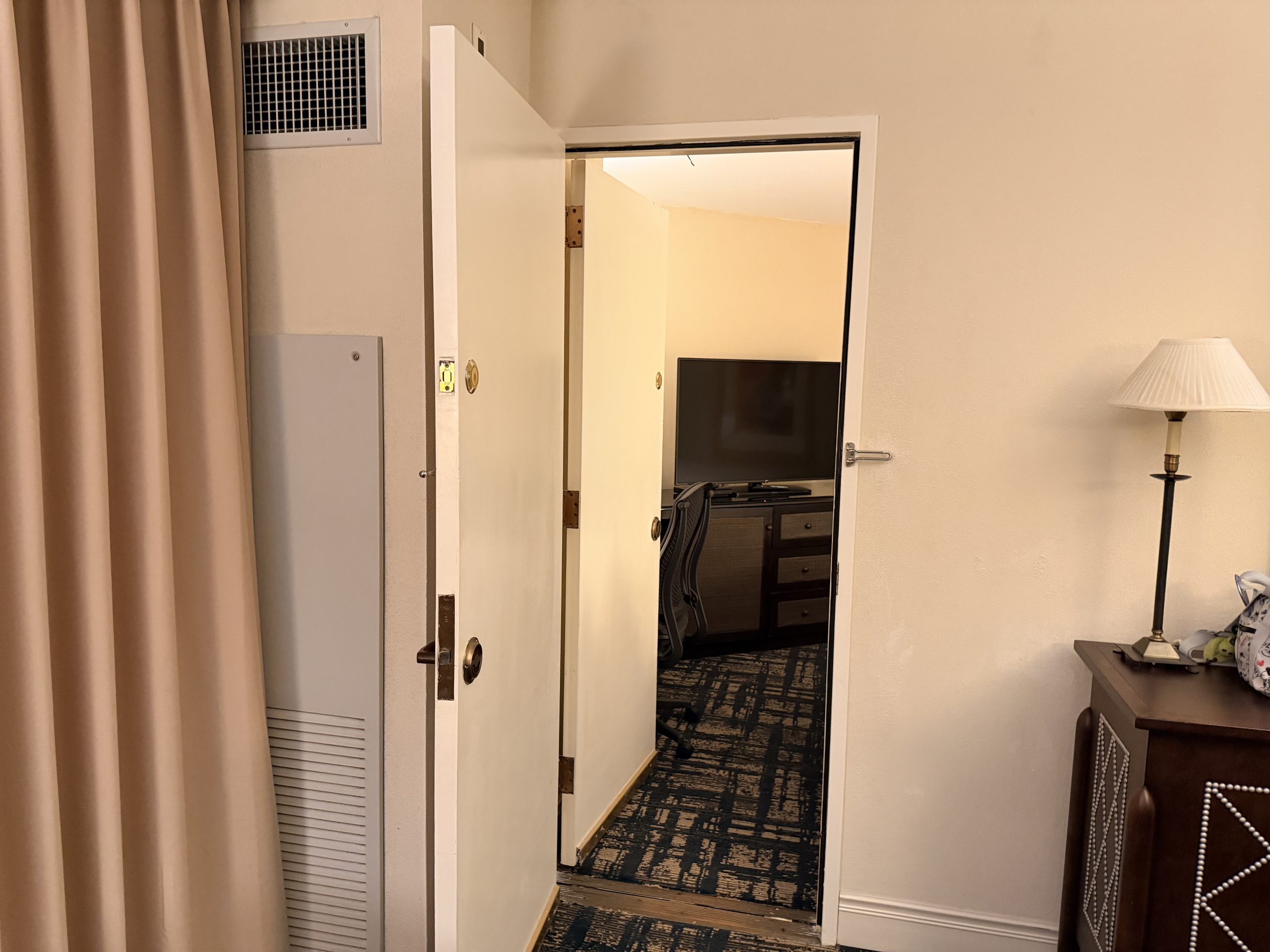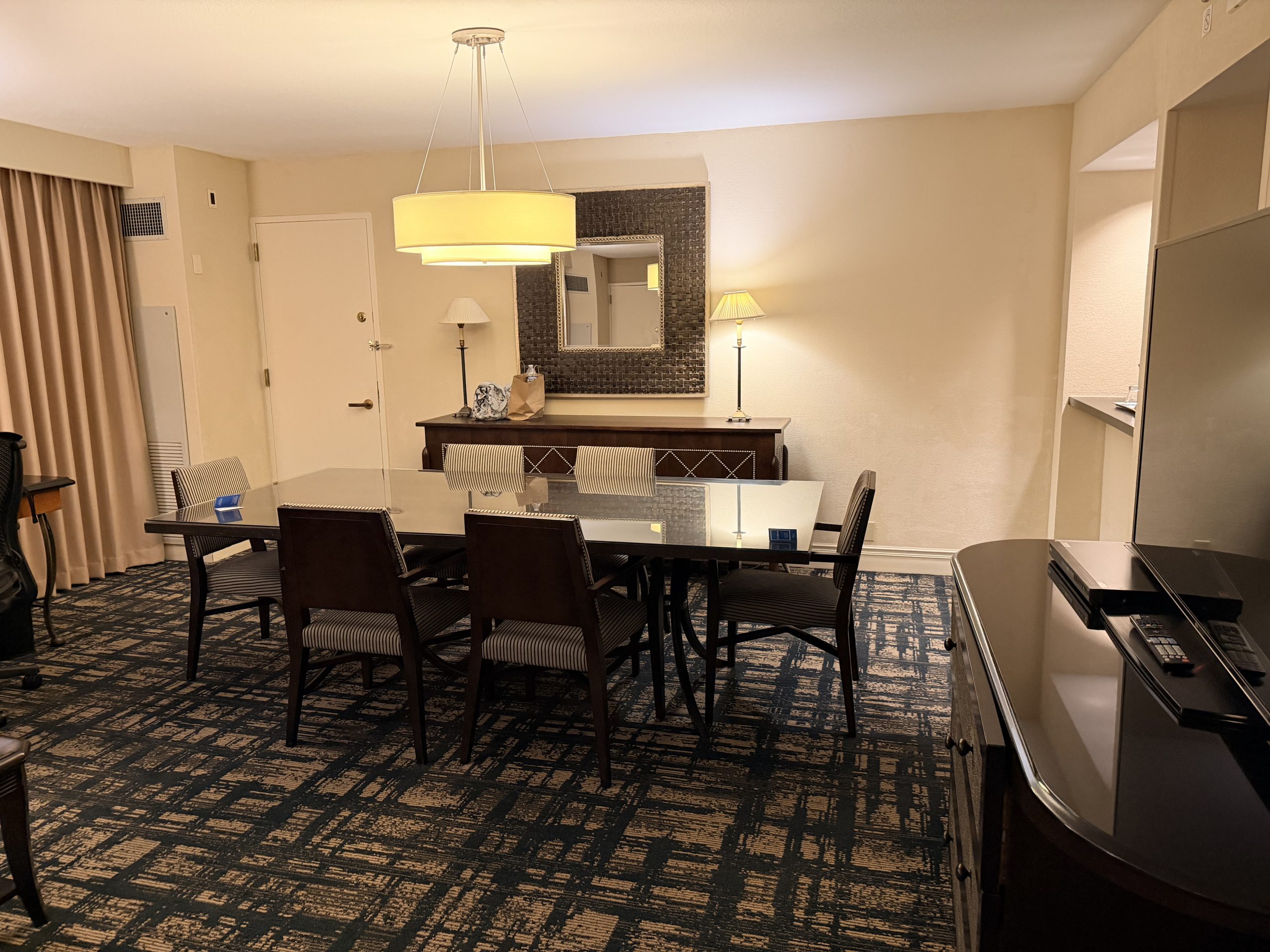第二天早上跟櫃台服務人員確認是否有「大床」的房型,服務人員很好心的幫我替換到含有大床的套房。新更換後的房間其實是兩個房間連結起來,房間內有一個客廳,一張大床,一個6人座餐桌,還有一個小小的吧台空間,而連結的房間則是一間標準雙床房,因此兩間連通起來,就是一間有「三張床」的大套房。雖然房間很大,不過還是看起來相當陳舊,尤其是床單與毛巾的狀況,床單的邊緣有個小小的破洞,浴巾上也有幾處明顯的磨損與小破洞,確實讓人有點失望,希望未來可以改善。