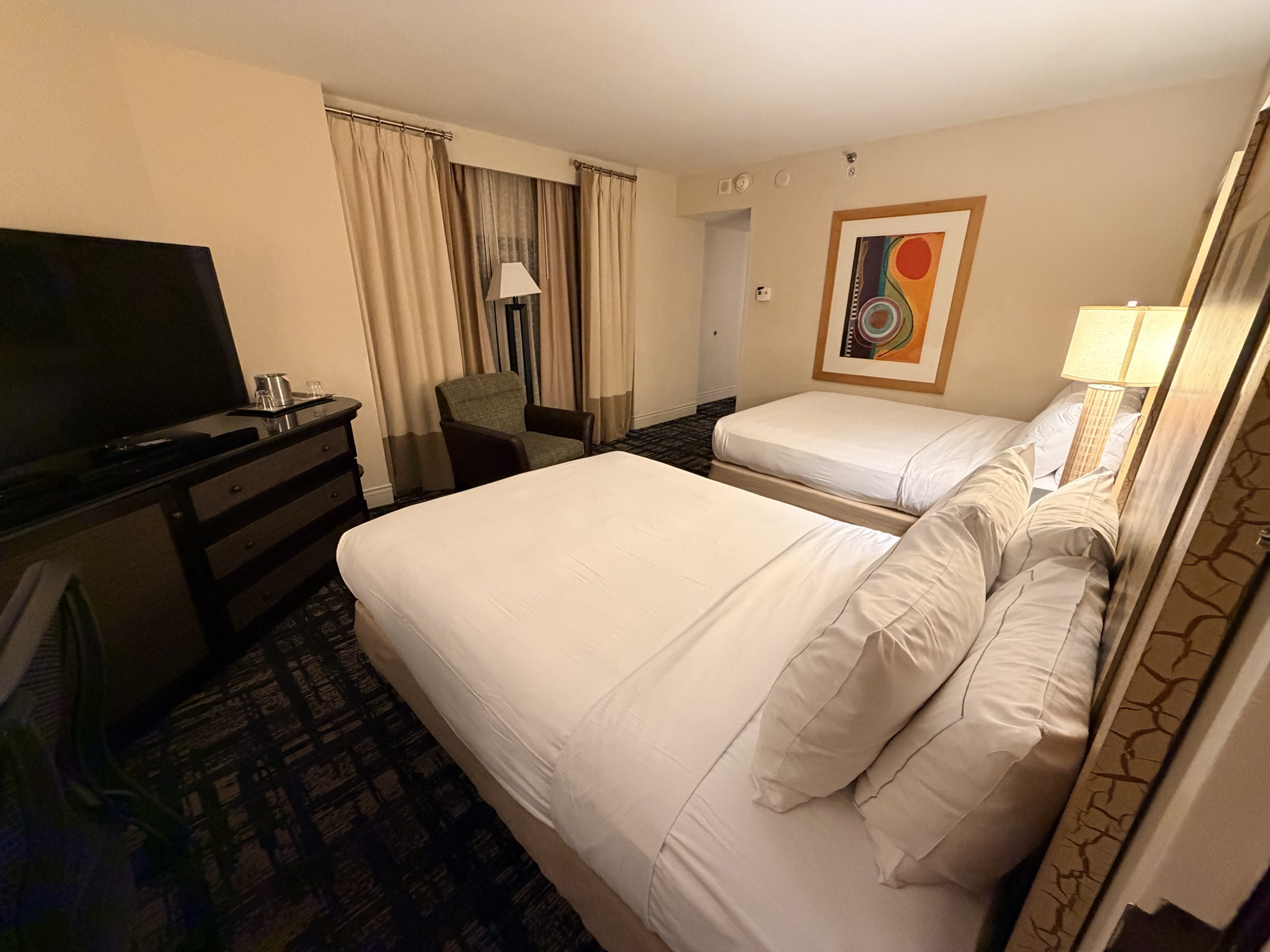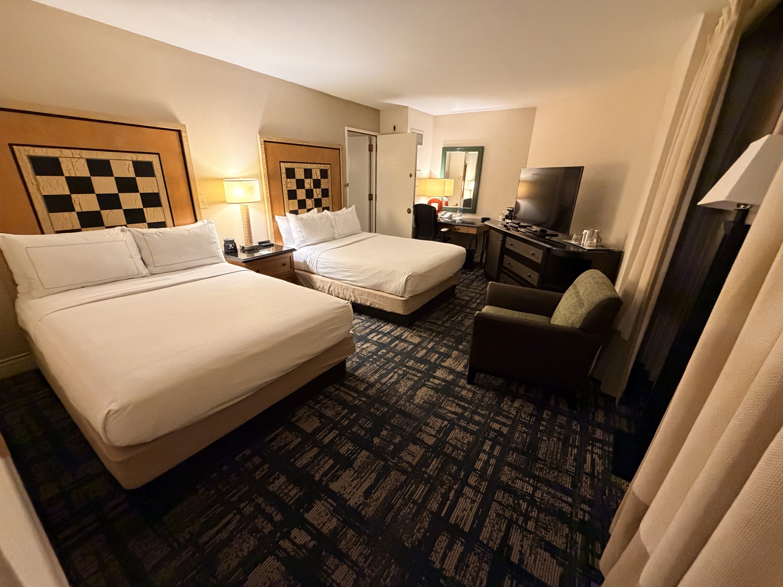 第一晚入住的是雙床小套房,因為當晚有舉行會議的關係,所以沒有大床的房型可以讓我入住。推開房門之後,映入眼簾的空間相當寬敞。兩張「Queen Size」的大床並排擺放,床頭是深色木質的背板,搭配白色的床單與枕頭。房間的另一側有個小型的起居區域,一張雙人沙發面對著電視櫃上的平面電視,而沙發可以調整為沙發床,讓這間房間最多可以有6個人入住,相當適合家庭出遊。