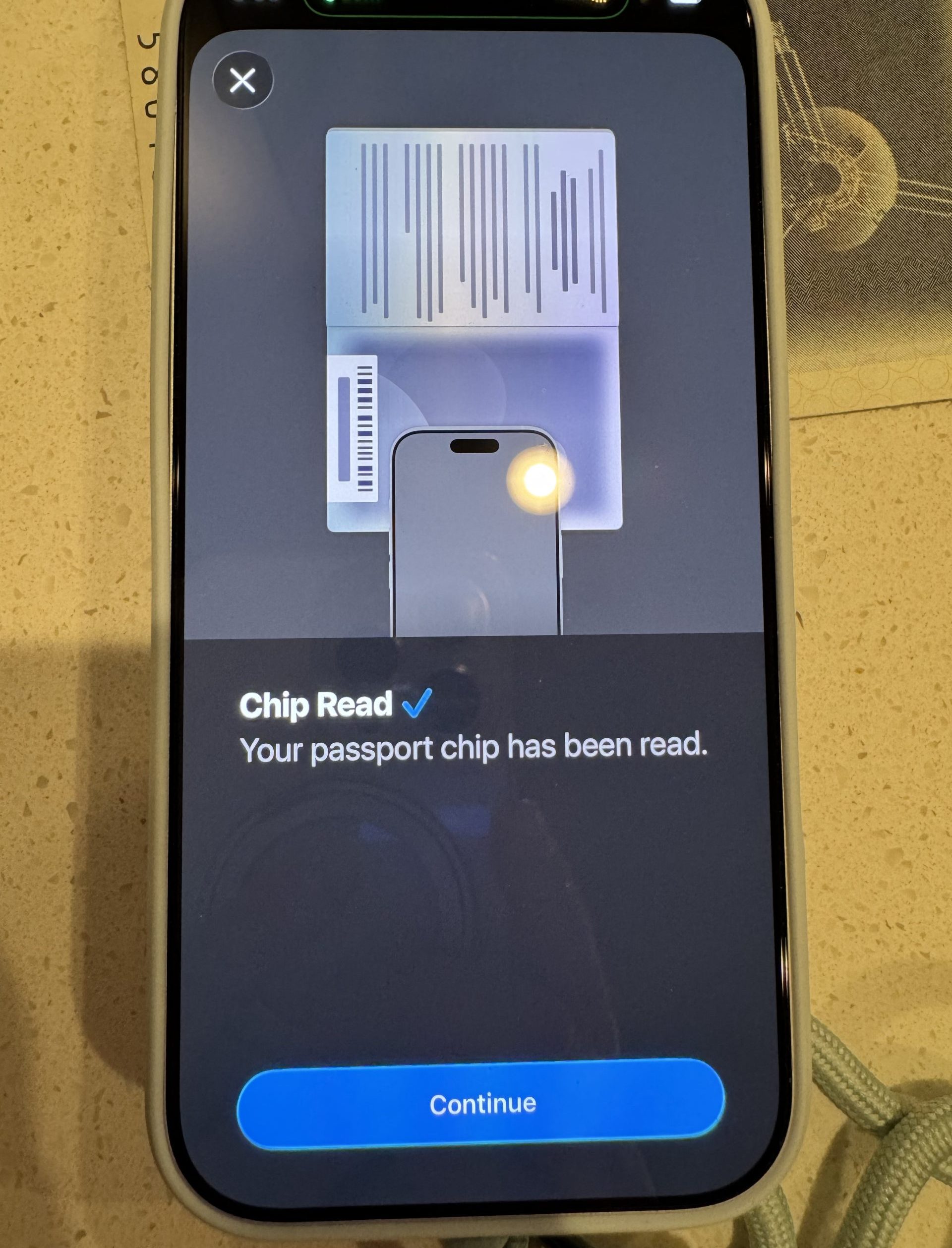 - 接著將iPhone手機放在護照背面的晶片上,即可讓手機讀取並驗證護照內資料