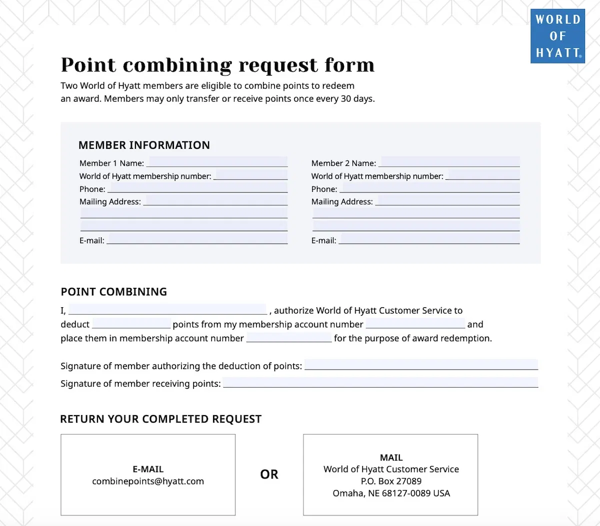 - 在表格上填寫相關資料,例如轉出與轉入帳號持有人姓名/凱悅集團計劃會員號碼/電話號碼/地址/E-mail/欲轉移的點數等等資訊