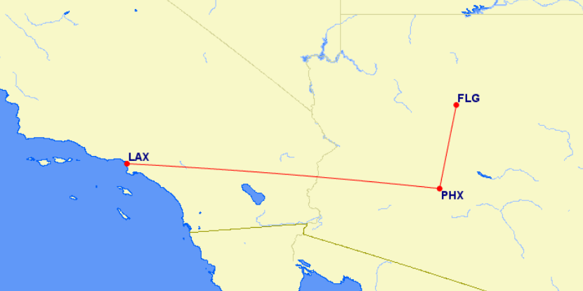 美國境內需要轉機的短程飛行,像是下圖的「弗拉斯塔夫 (FLG)~鳳凰城 (PHX)~洛杉磯 (LAX)」航線,如果使用北美短程機票兌換之王-阿拉斯加航空 (Alaska Airlines) 的話,兌換標準為7,500 points,而使用澳洲航空哩程兌換的話,是單純計算「弗拉斯塔夫 (FLG)~鳳凰城 (PHX)~洛杉磯 (LAX)」航線的總飛行距離 (489 mile),因此兌換單程經濟艙機票所需的哩程數為9,200 points,比起使用阿拉斯加航空哩程來說多了一些,但考量到阿拉斯加航空哩程比較難透過美國信用卡靈活點數系統來轉點的關係,因此若是要使用澳洲航空哩程計畫來兌換,也不失為一個替代的方案。