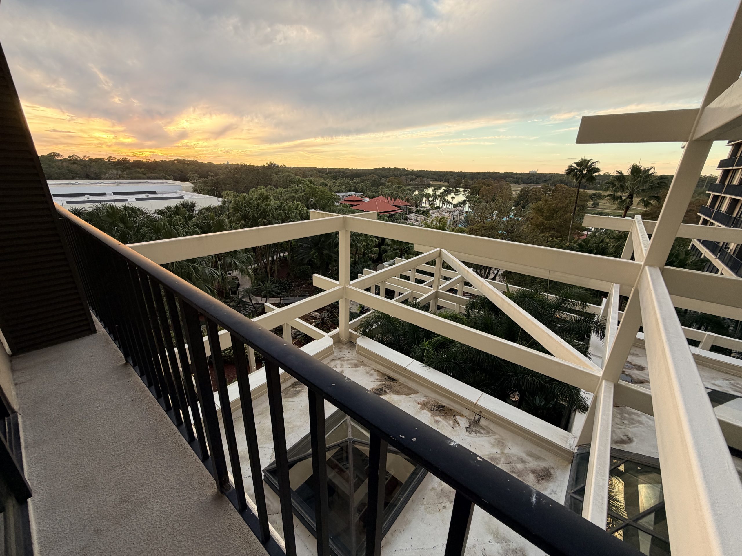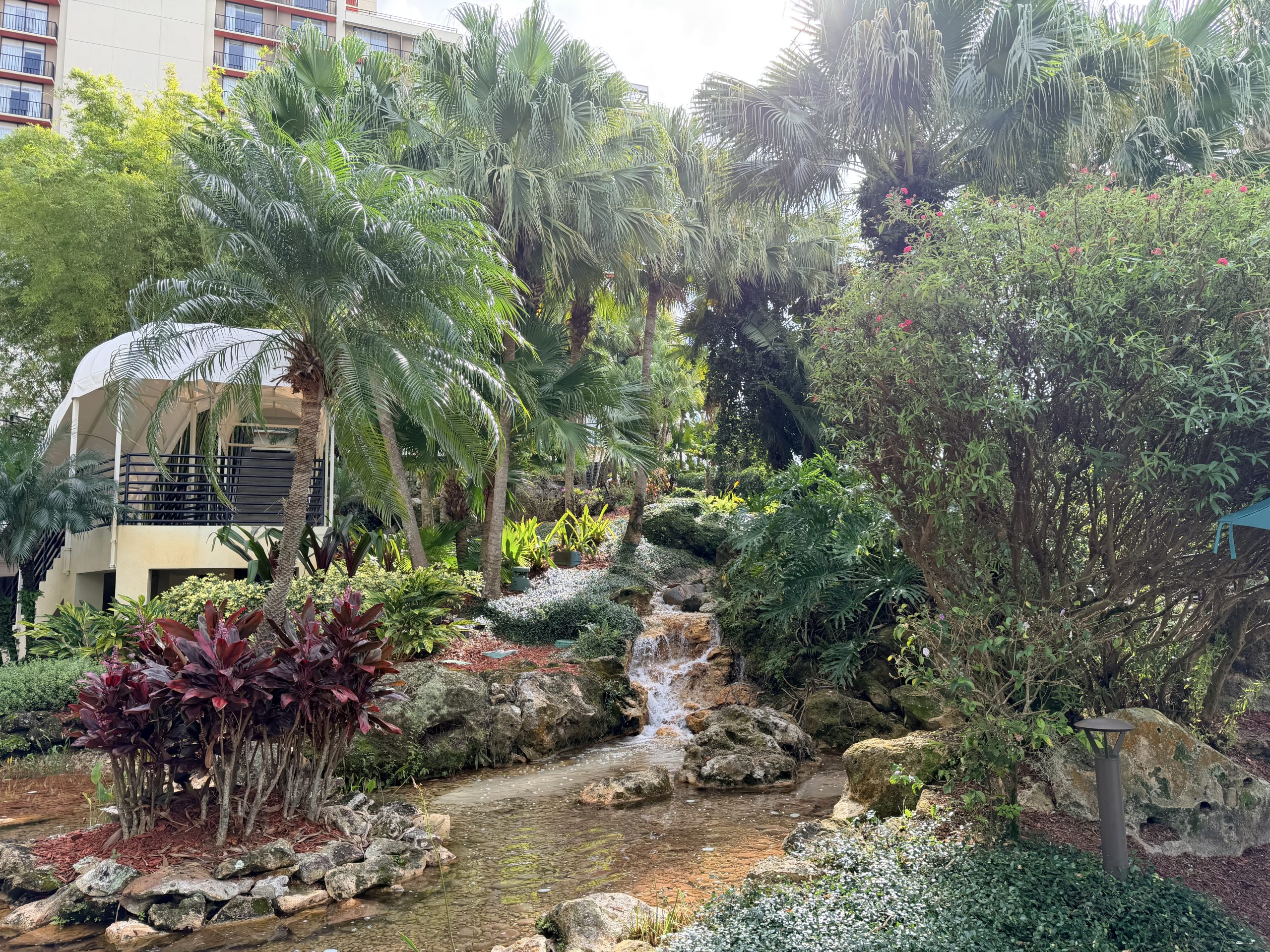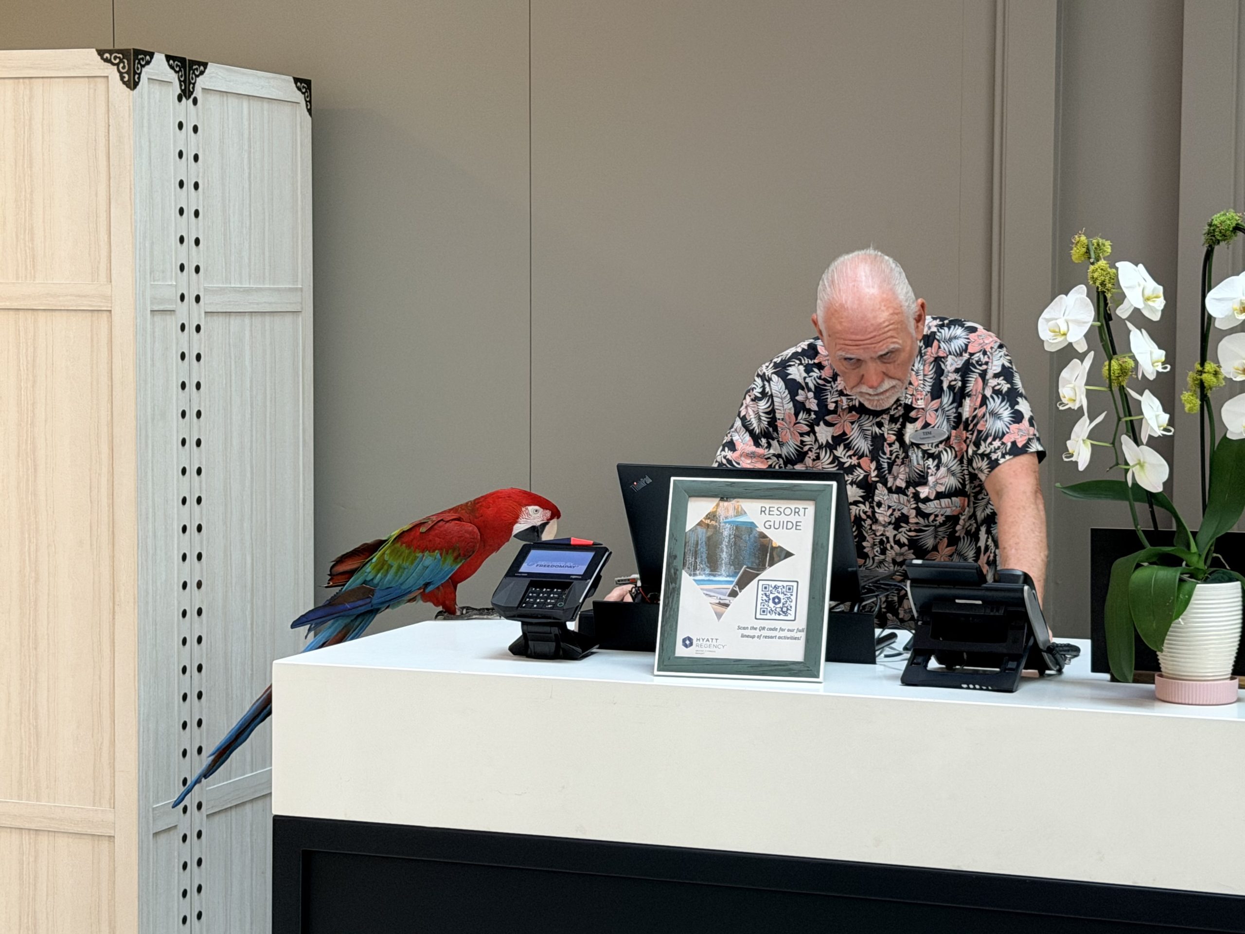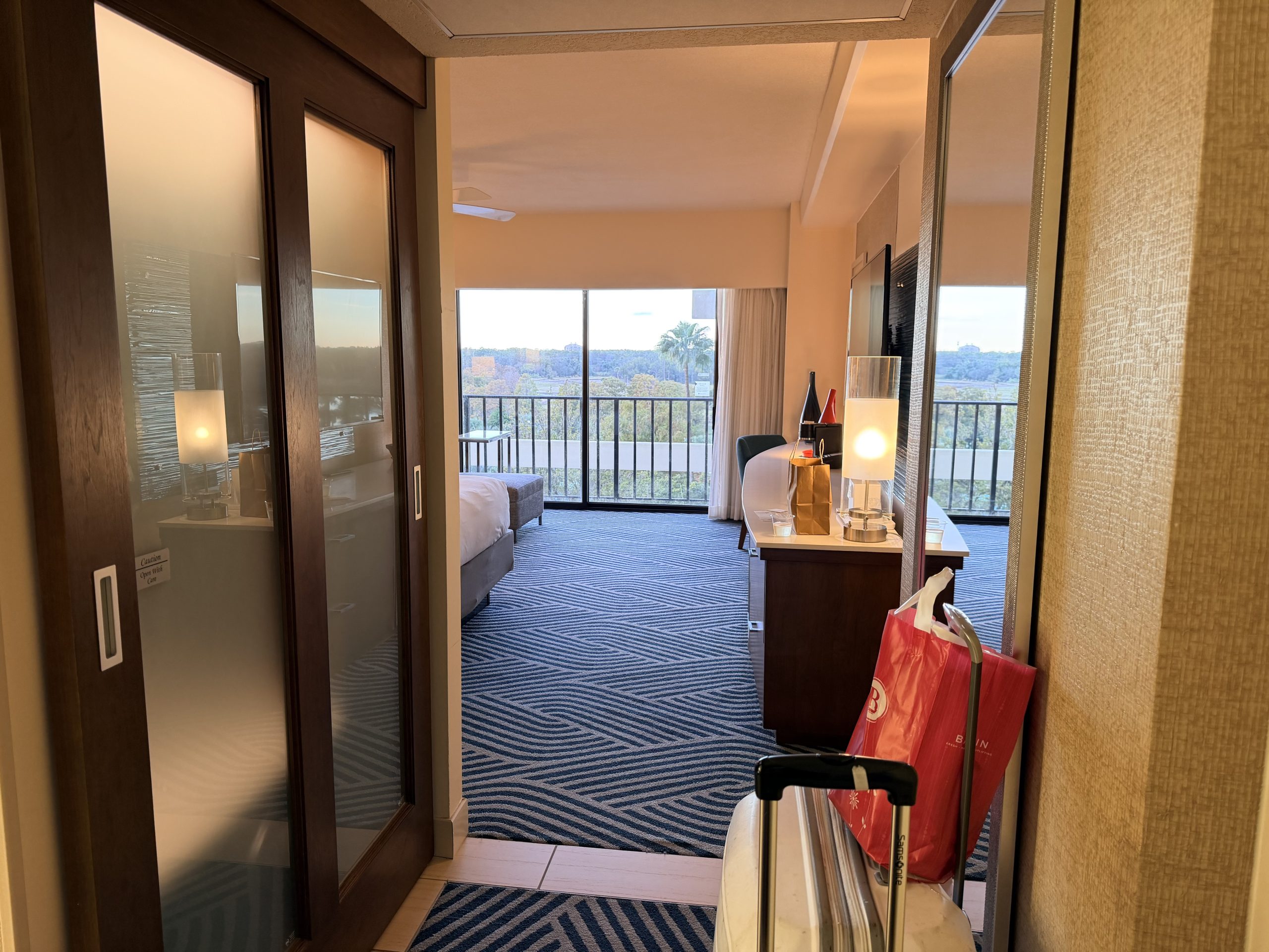 抵達時,挑高的大廳裡灑進佛羅里達州當地的溫暖陽光,排隊辦理入住的人有點多,在排隊的時候有位「臉很臭」的大叔,帶著一隻紅紅的金剛鸚鵡在大廳走來走去,增加不少「加勒比海」海盜的風情。因為當日入住的人蠻多的,所以這次只有入住到高樓層的湖景房。