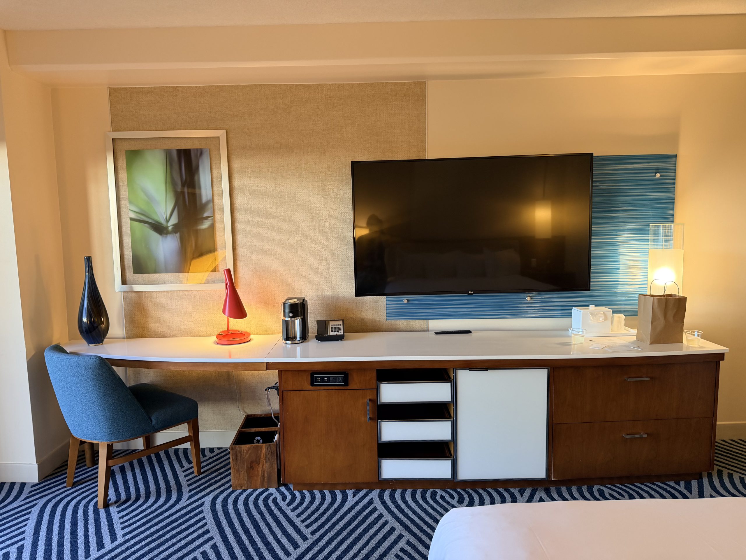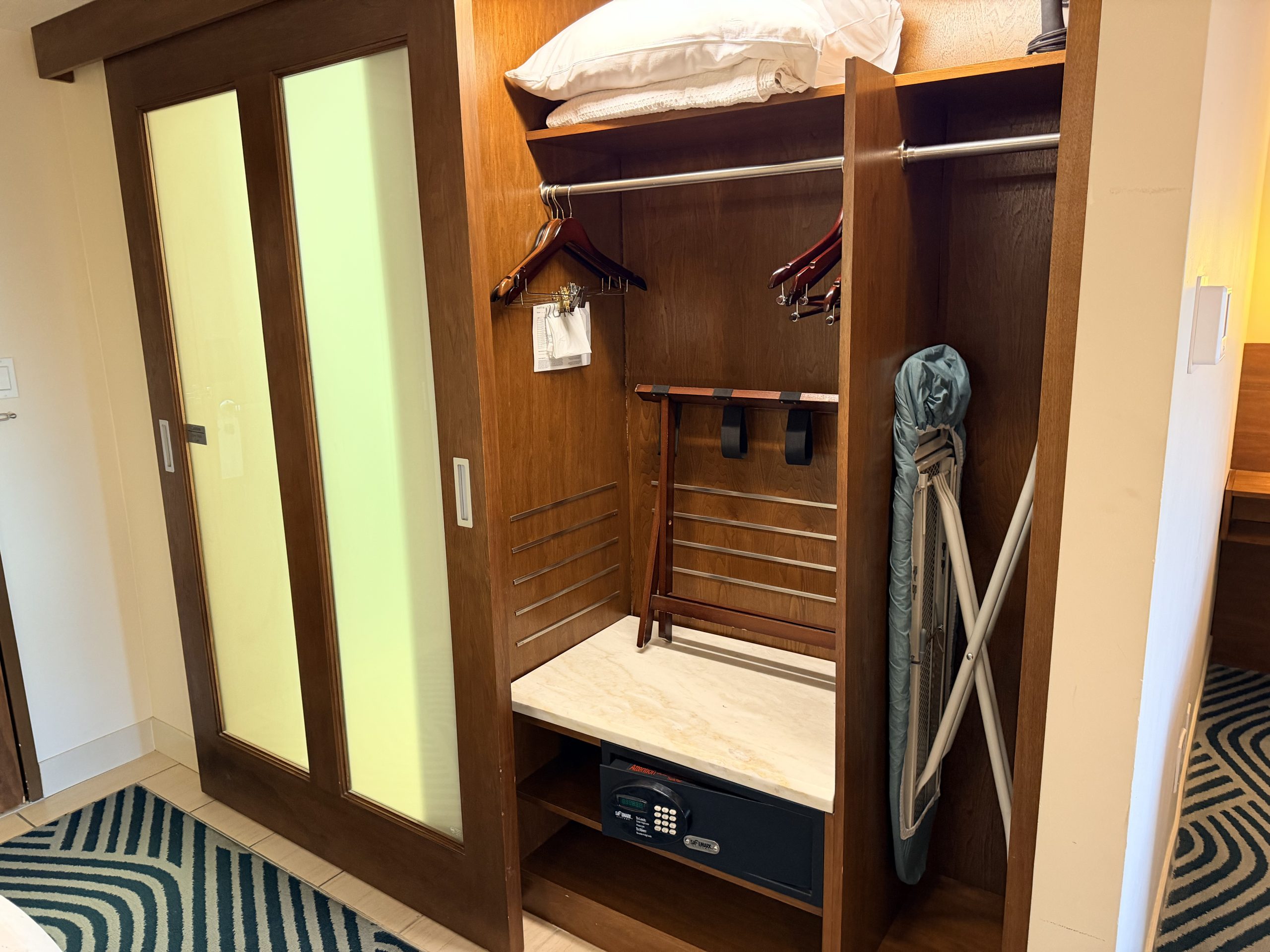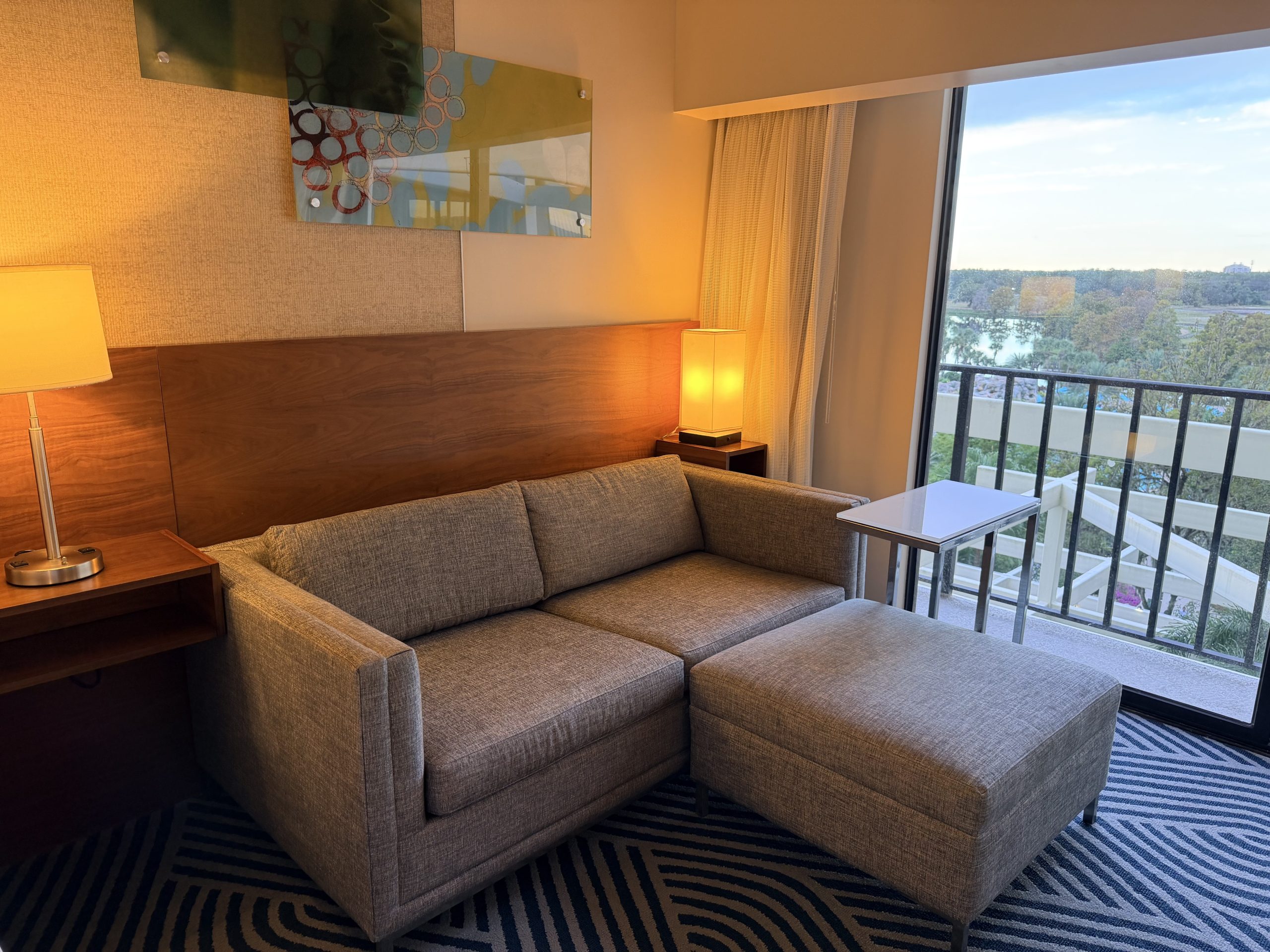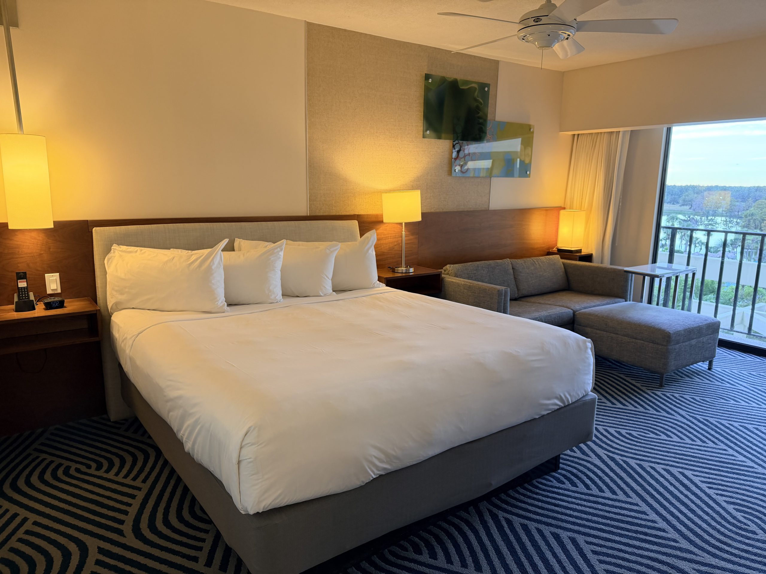 我入住的湖景大床房型,約有360平方英呎的大小,房間的空間感還挺夠的,而且還備有沙發床,應該適合舉家出遊。在我的房間內,晚上可以在陽台看到遠遠的「迪士尼世界」樂園的「EPCOT」園區的煙火。