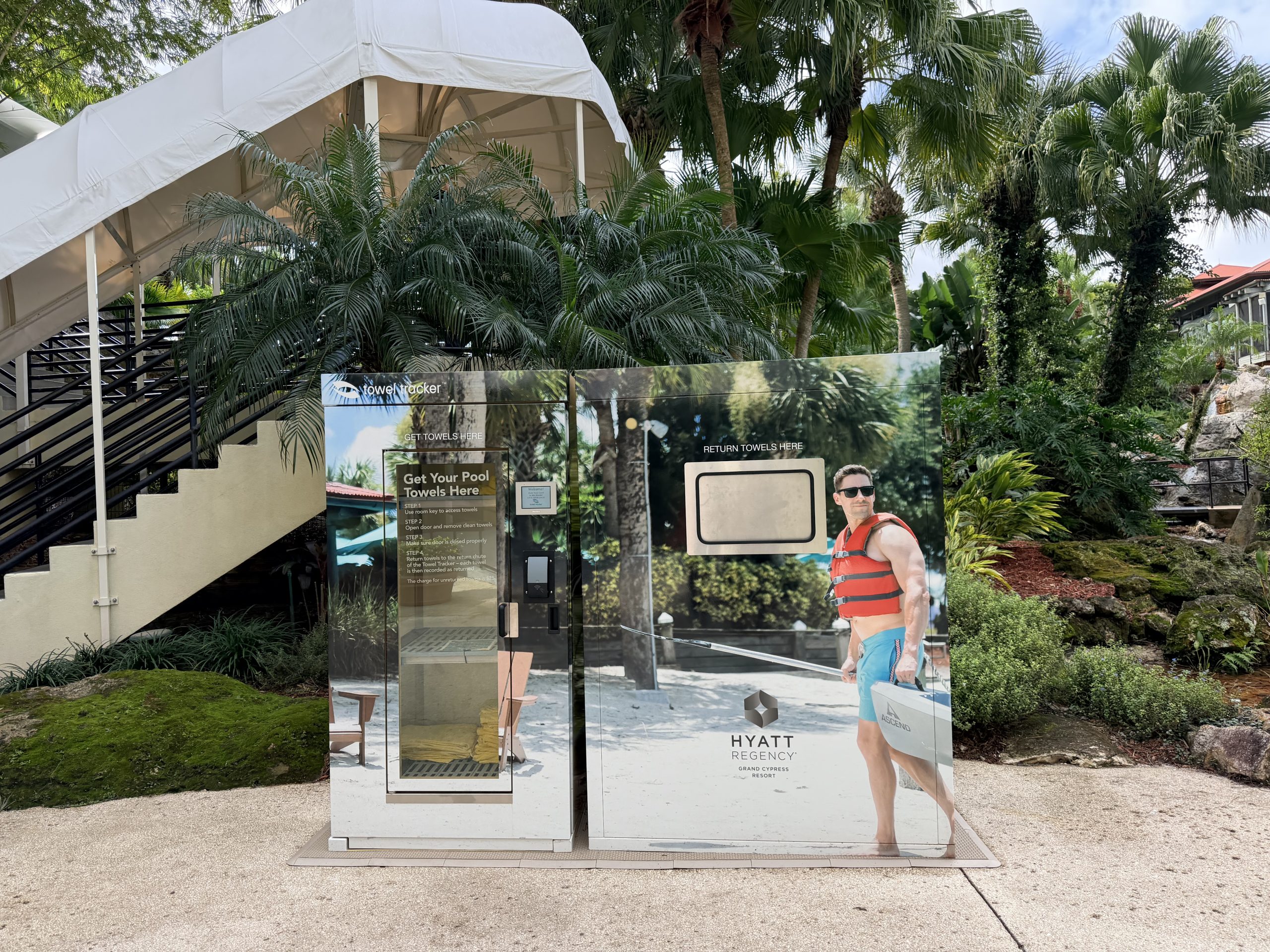 很融入周遭庭園的毛巾取用機