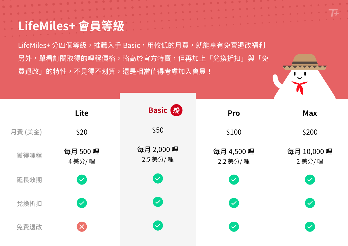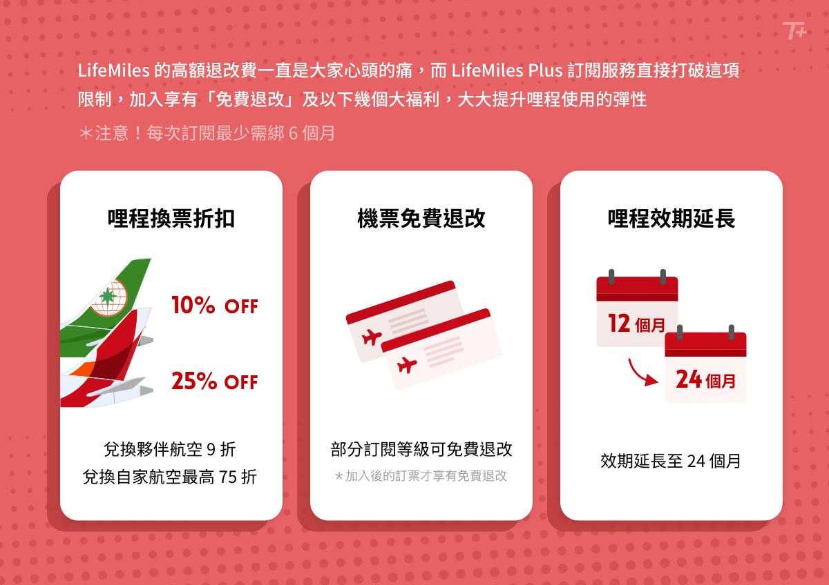 - 雖然購買「LifeMiles+」訂閱制服務的所有等級,都享有相關兌換優惠與效期延長的福利,但是若要有免費取消/改期的福利,必須要購買「Basic」或以上等級才能獲得。