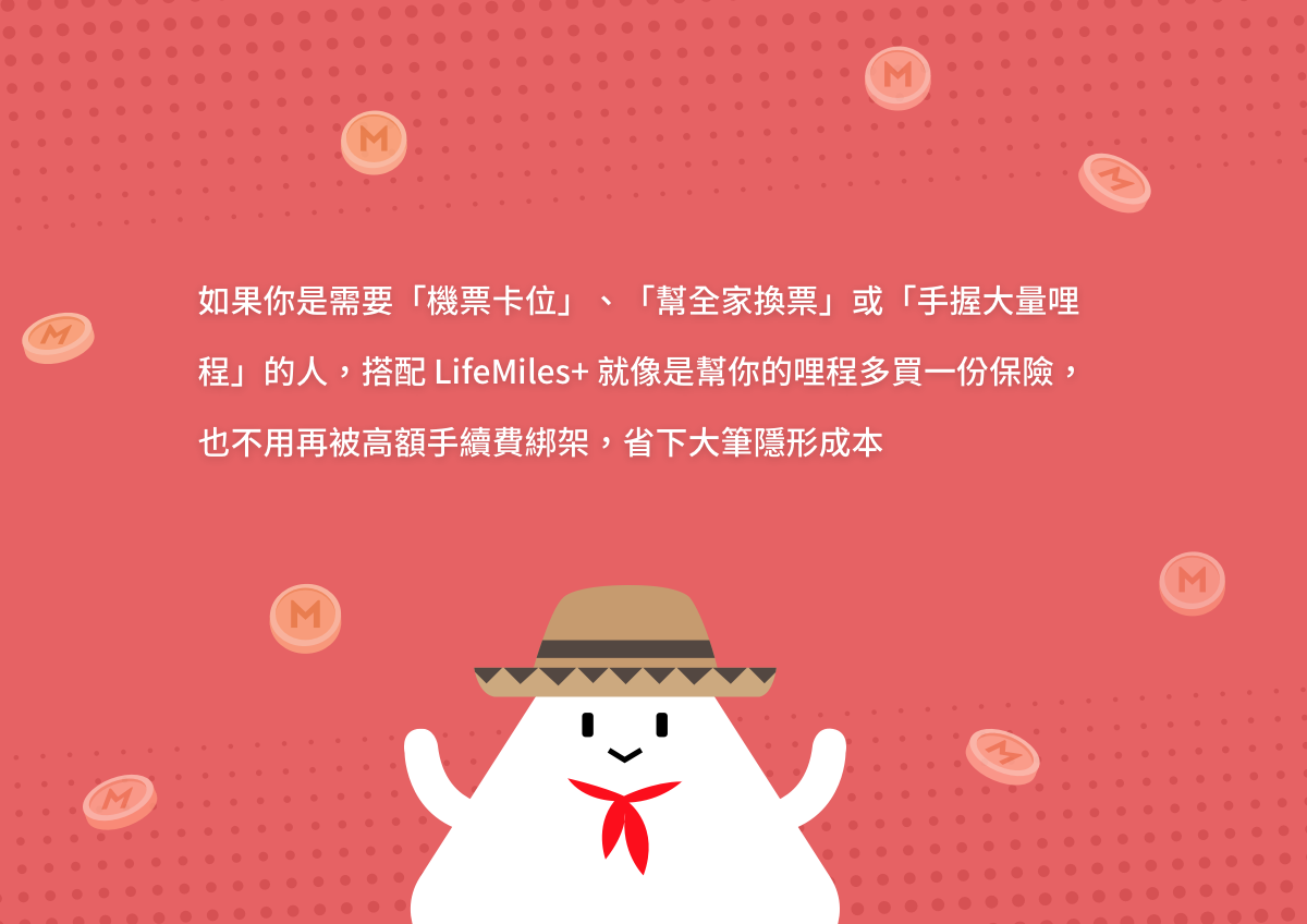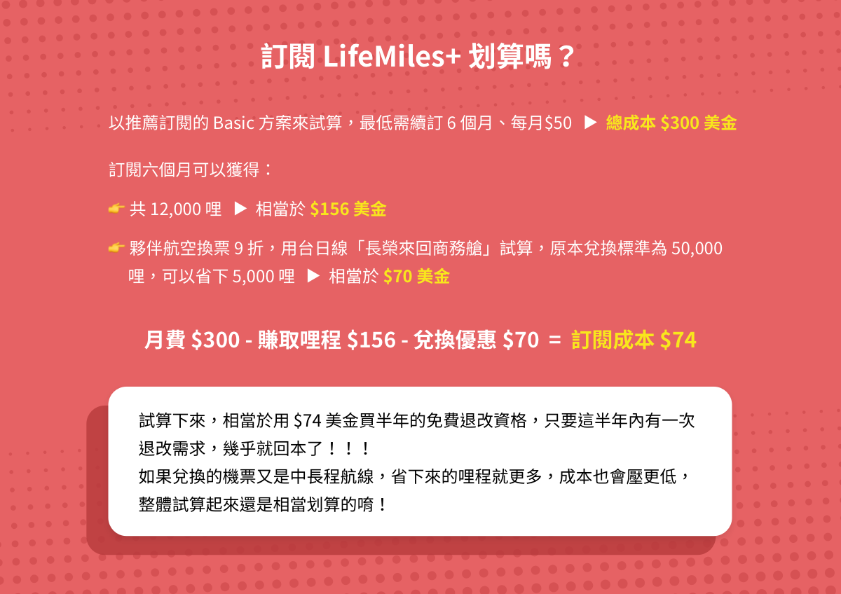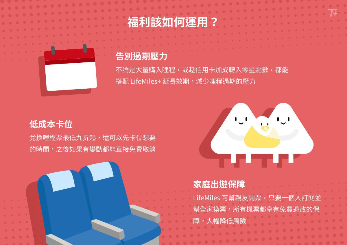 - 如果是需要先行兌換哩程機票來「卡位」,幫忙家人一起兌換哩程機票,或是手握大量哩程的話,購買「LifeMiles+」訂閱制服務等於多了一層保障。