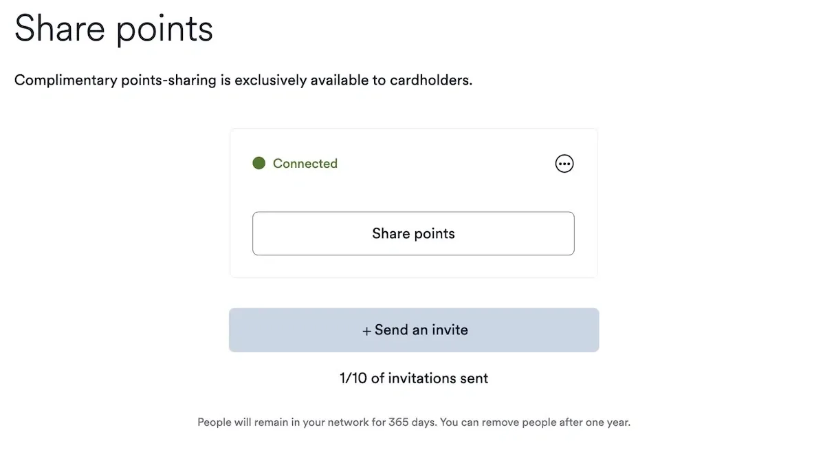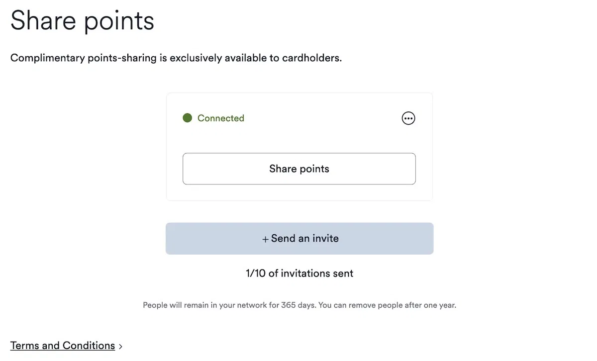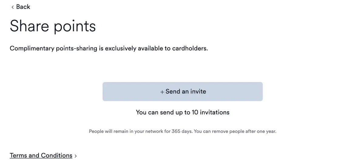 (3) 進入「Points Sharing」的選項頁面後,就會看到如下圖的畫面,接著點擊「Send An Invite」的選項,就可以開始邀請親友加入免費轉移哩程的「家庭」網路。
