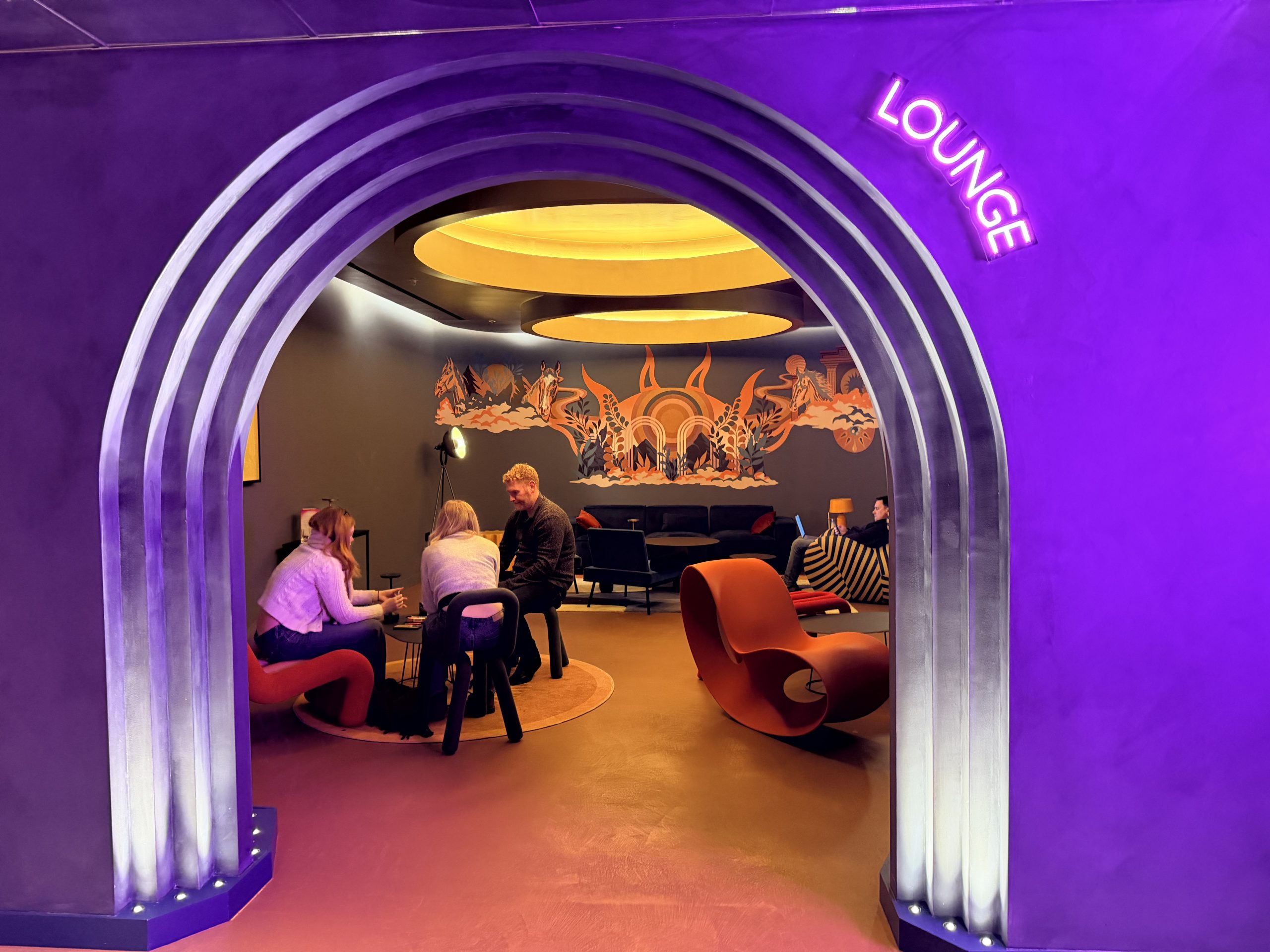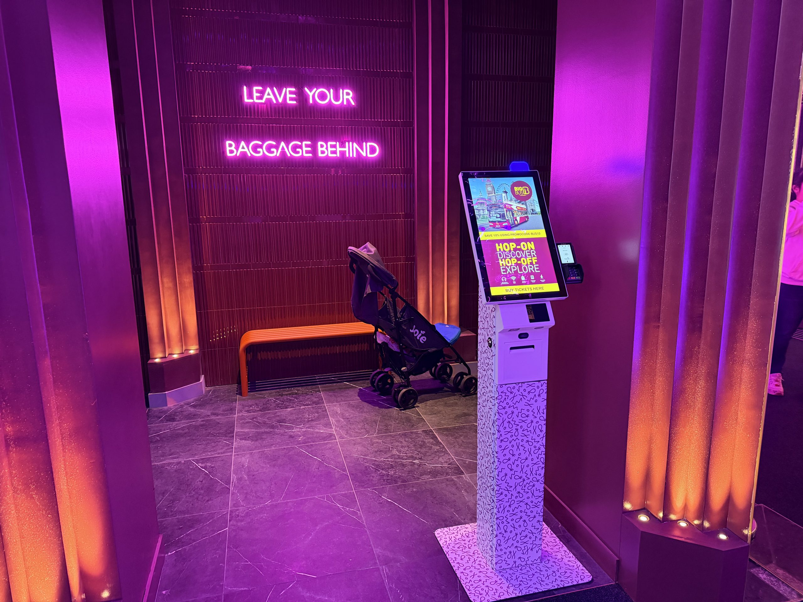 剛抵達酒店時,一時之間還真是分辨不出來入口的位置,下車時迎面走進像是百貨公司入口的旋轉門,接著走上一條長長的手扶梯,隨著手扶梯向上移動,賞玩兩側牆上出現的濃厚普普藝術風潮設計。到達大廳樓層時,迎面而來的不是傳統酒店那種正經八百的櫃台,而是一個結合酒吧與接待功能的開放式大廳。我一開始先走到了旁邊的自助入住辦理櫃台,但是當下自助櫃台無法辦理入住手續,要我前往櫃台辦理入住手續。但是我繞了兩圈,都沒看到入住櫃台,後來是酒吧內的服務人員叫住我,我才發現原來從手扶梯一上來,看到一整面的酒吧就是入住櫃台。大廳的設計充滿巧思,工業風格的裸露天花板,復古的皮革沙發,霓虹燈管裝飾,以及角落的拍貼機跟自動販賣機,充滿了倫敦街頭文化的叛逆精神。