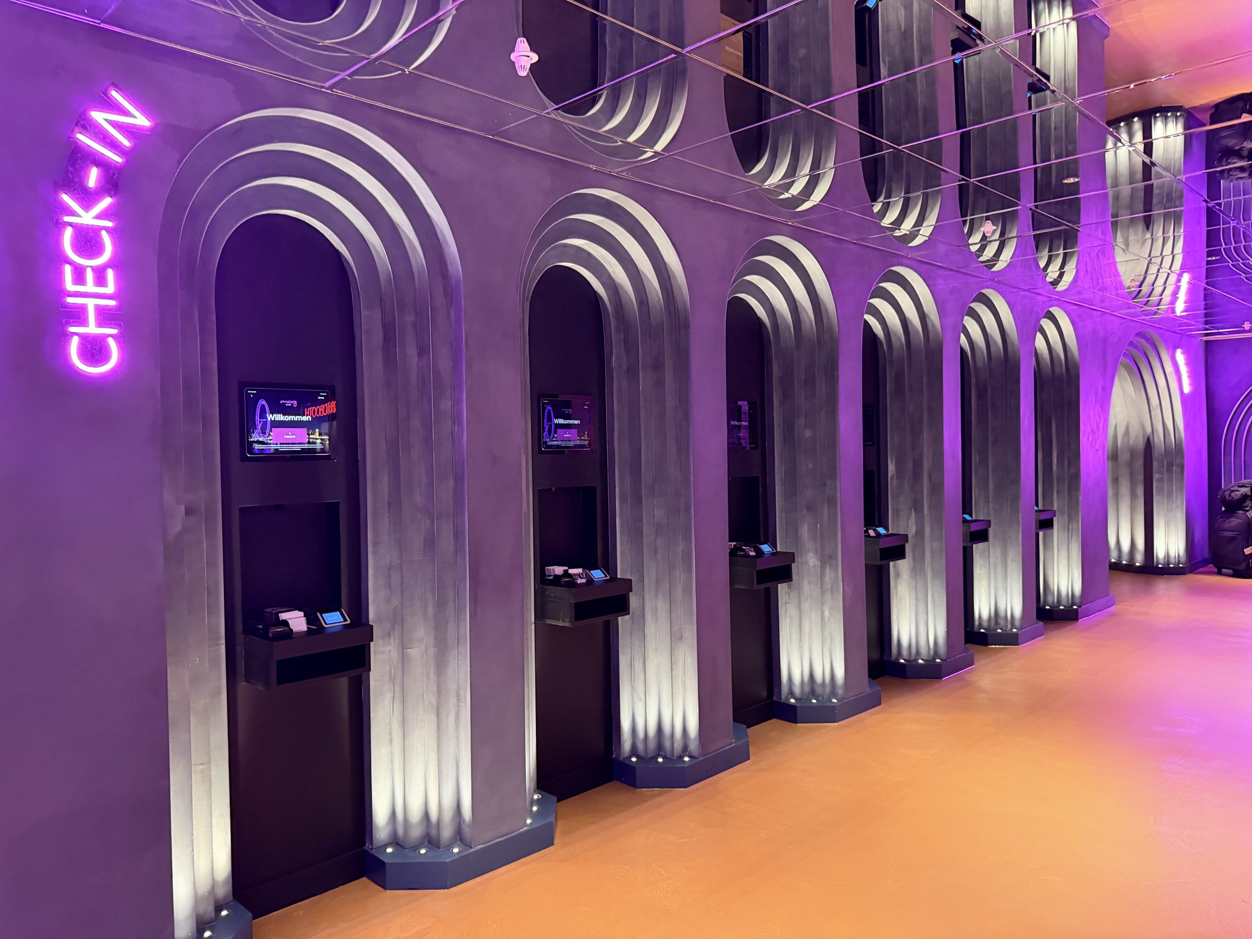 一整排的自助式辦理入住手續櫃台