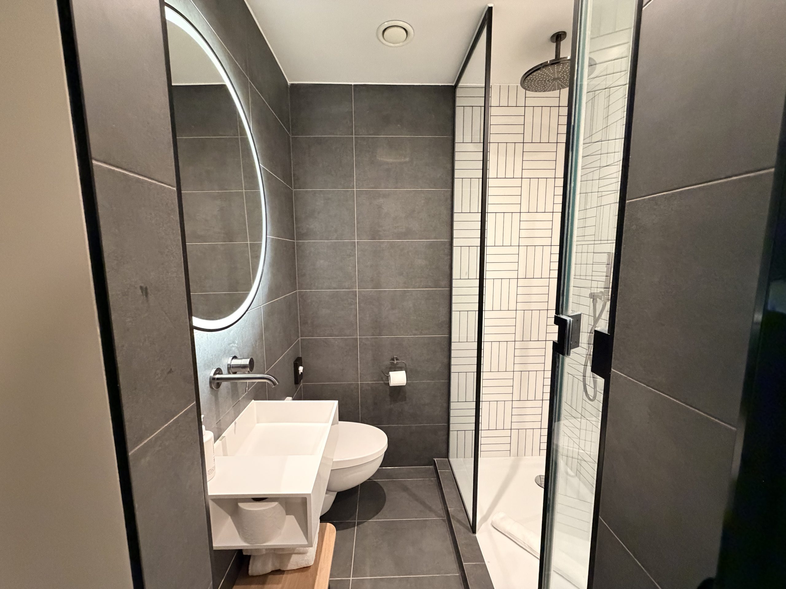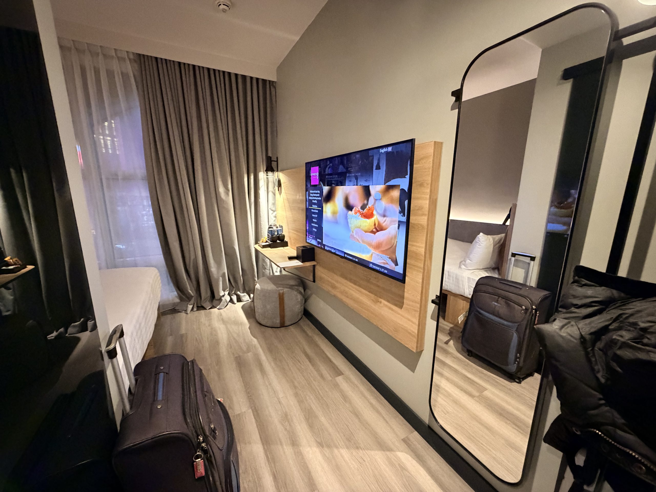 這次使用點數兌換到的是基本房型,這間酒店的基本房型是沒有窗戶的房間,不過在辦理入住時,服務人員有幫我升等到「有窗戶」的房間。在推開房門的那一刻,我必須承認,房間的空間確實偏小,大約只有13平方公尺左右,但酒店非常聰明地將空間設計得非常好。有一個Queen Size的床鋪,而且窗邊設置了一個L型的桌面,結合了書桌與梳妝台的功能。在浴室的部分,採用「現代簡約」的設計風格,雖然空間不大,但是沒有擁擠的感覺。