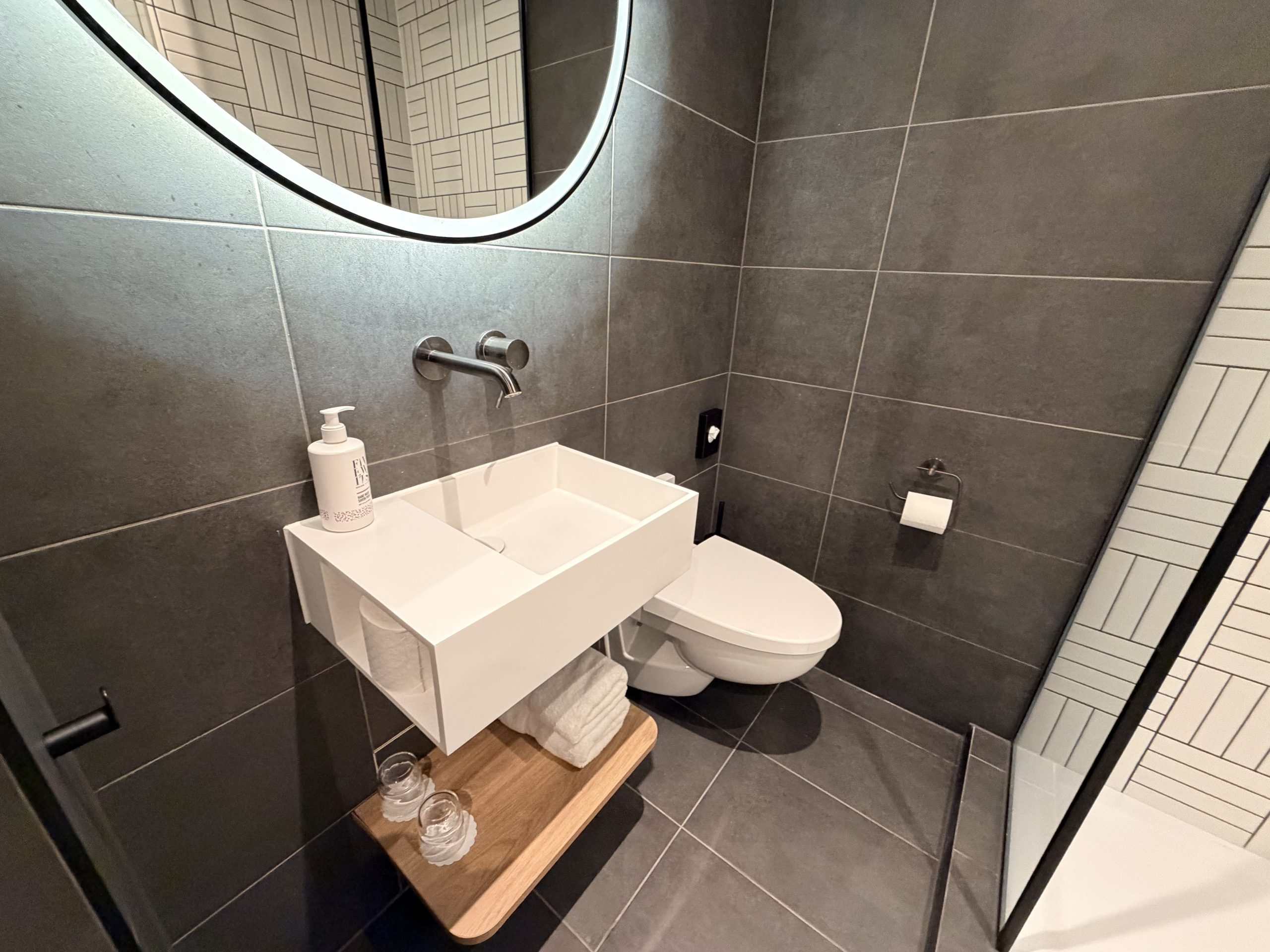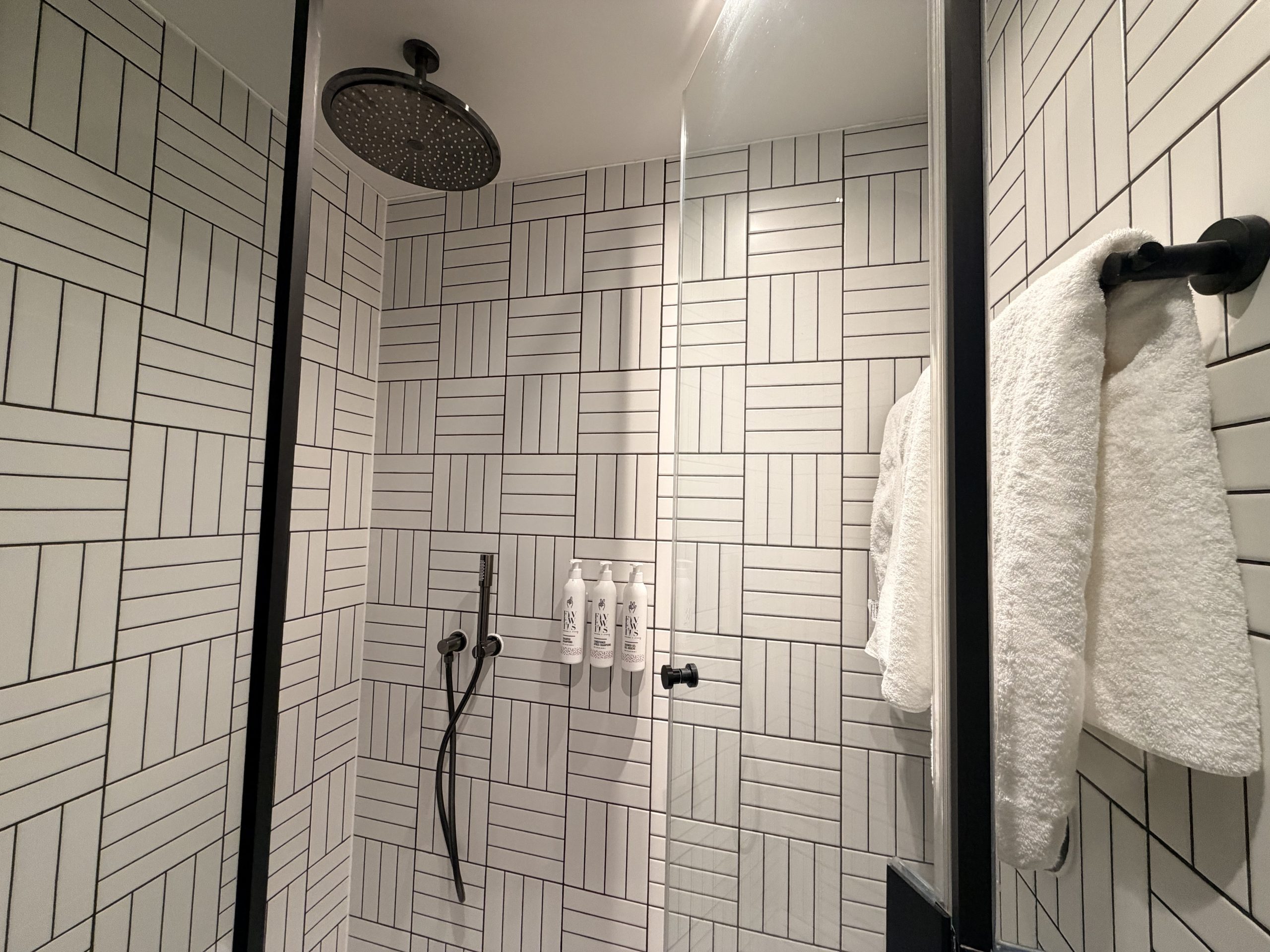 淋浴間一覽,以條紋格子黑白拼接的磁磚為主,利用2D扁平的視覺差,反而加大了空間感