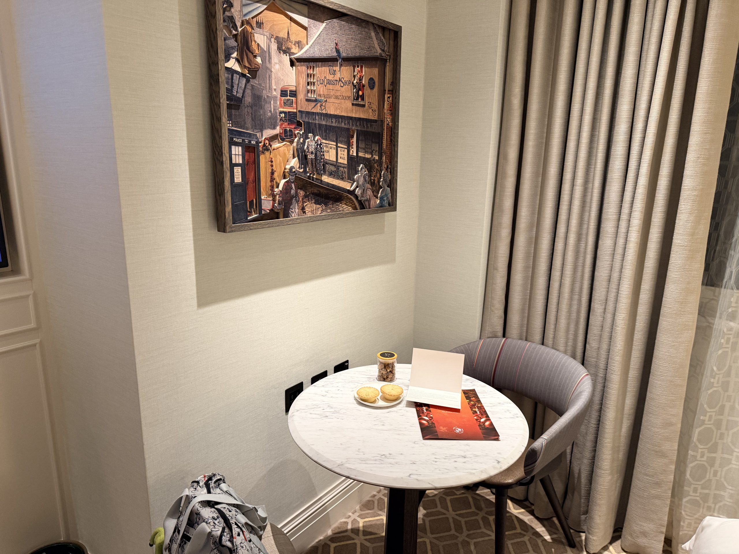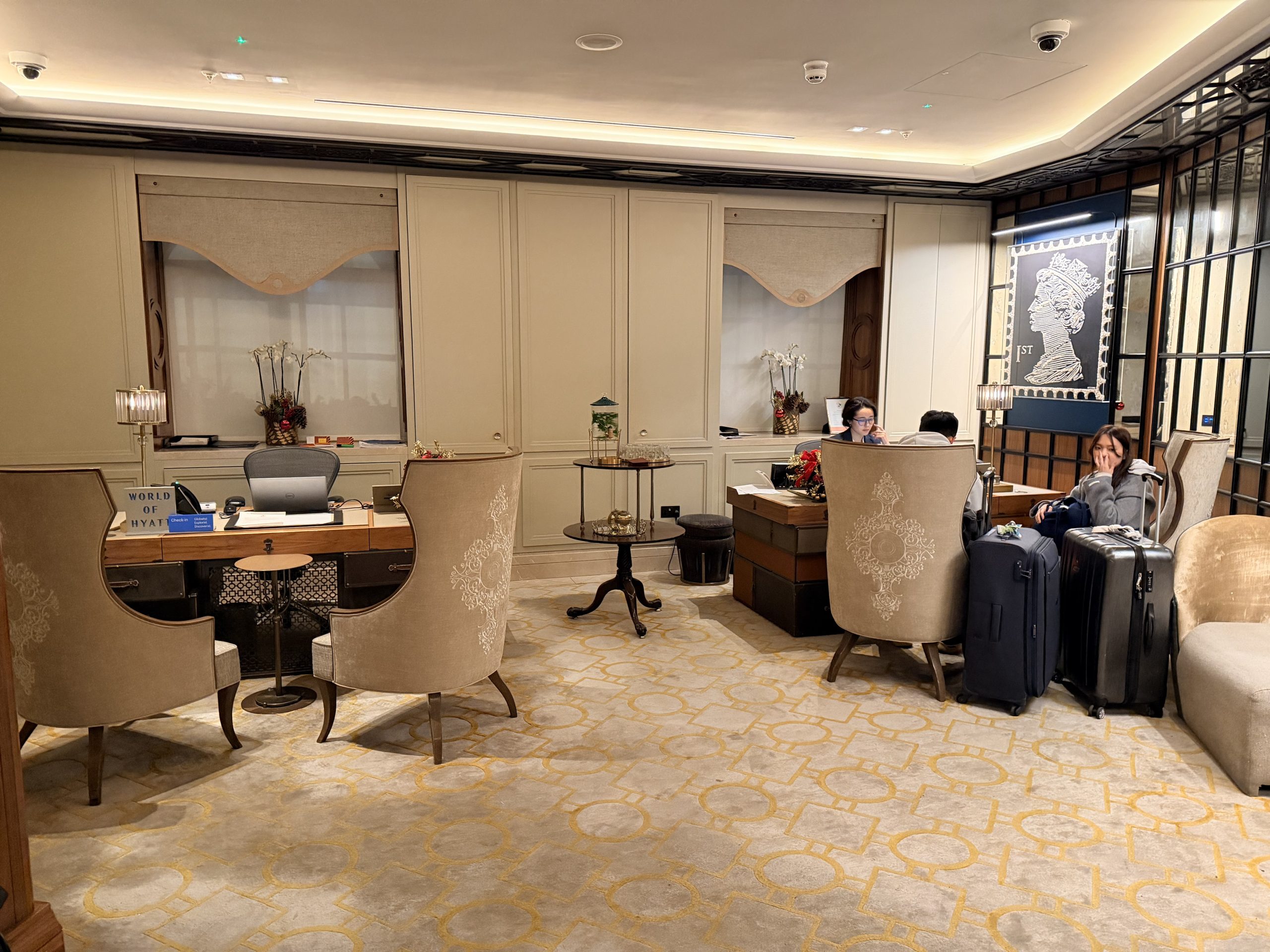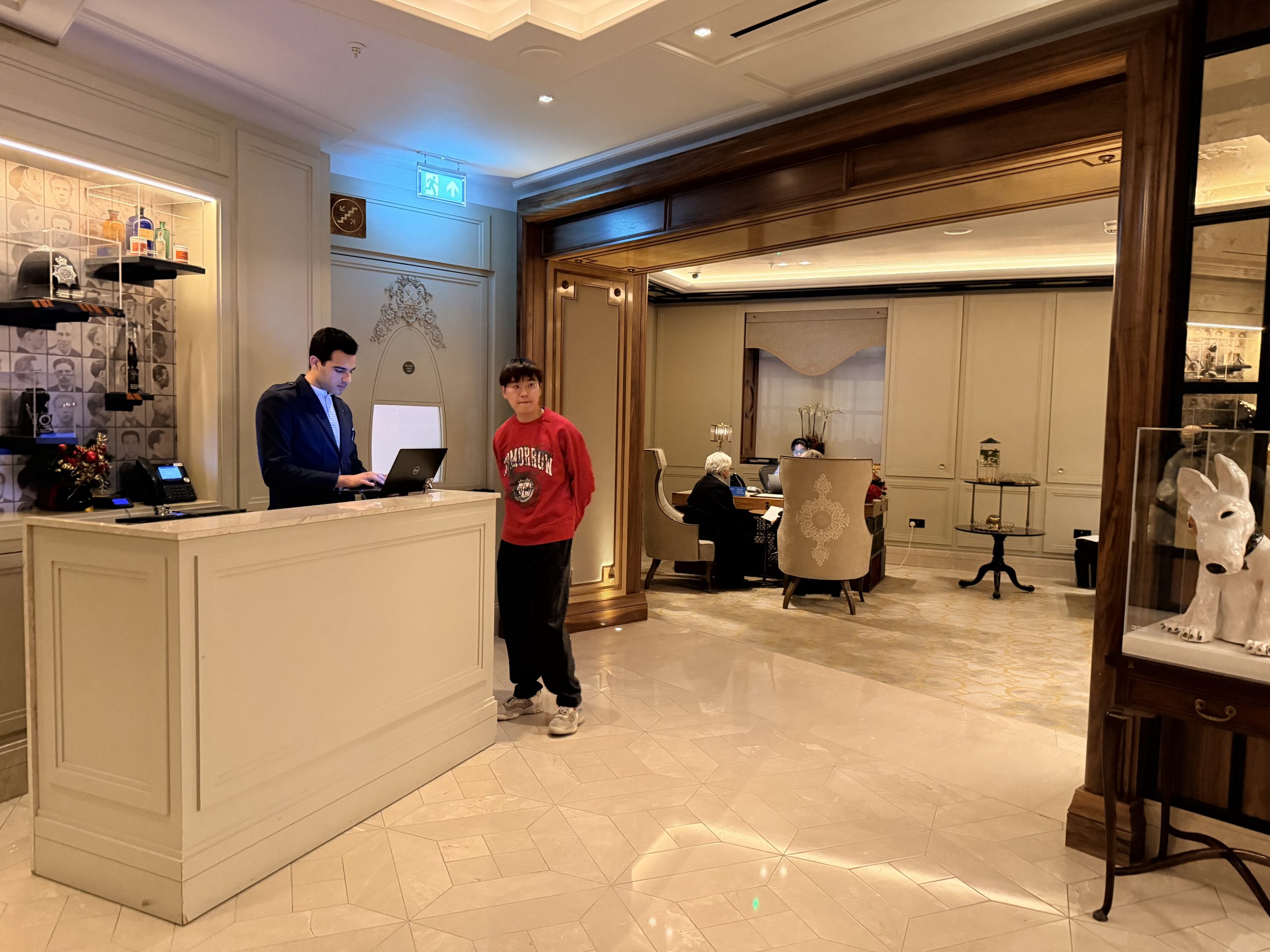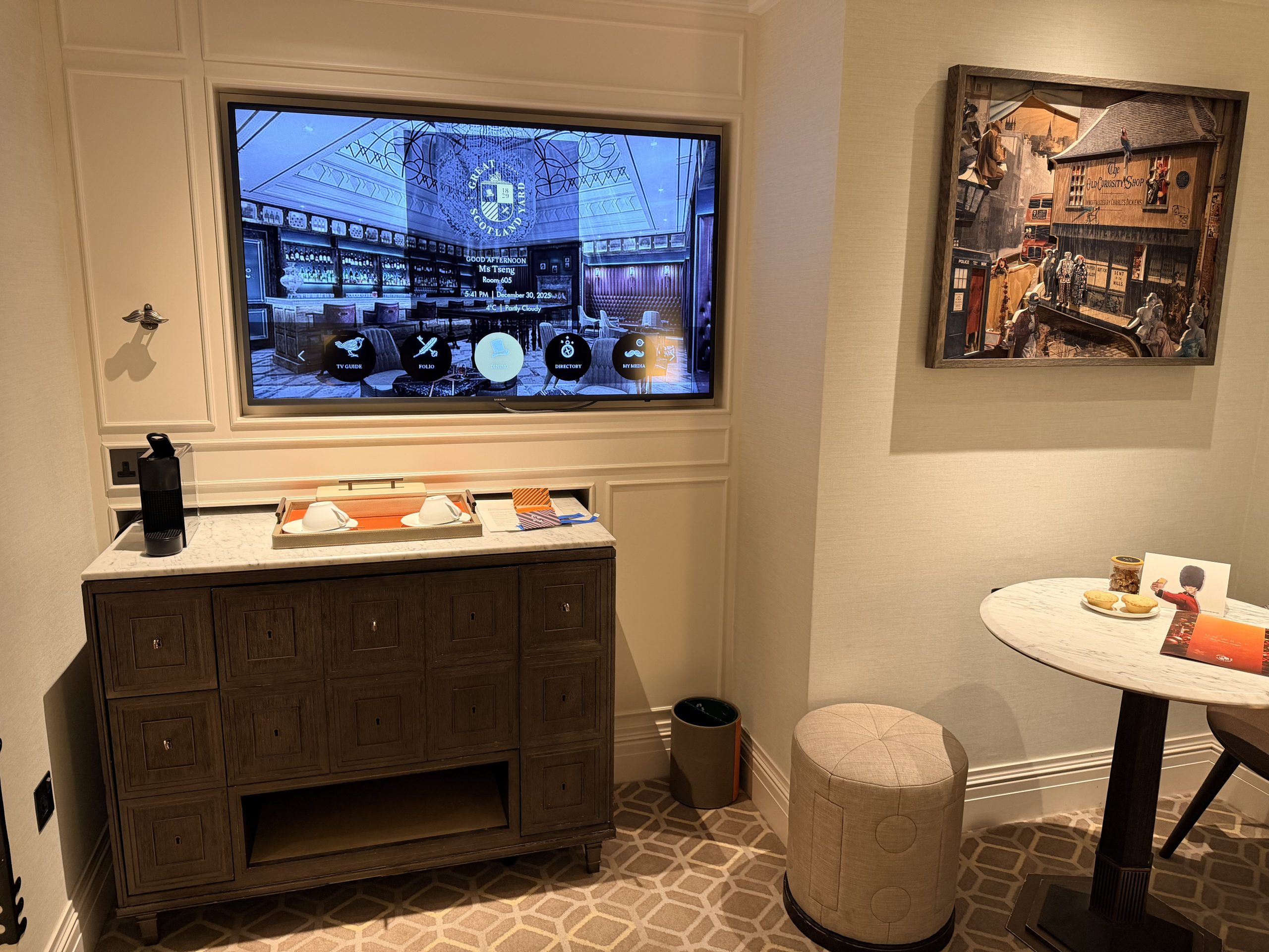酒店大廳巧妙地融入了現代裝置藝術,當代家具與精選藝術品,配合經典英倫風格,創造出一種「經典與前衛對話」的獨特氛圍。辦理入住的當下,或許是一時服務人員太忙,因此除了沒有人幫我拿行李之外,也沒有招待我辦理入住手續,讓我站在那裏一時半刻後才被接待。但是辦理入住手續時,還是能感受到英式禮賓的態度,而且最後要退房時,服務超好到令人動容,因為酒店周遭為了新年遊行的關係,實施交通管制,所有的車子都進不來,必須走到國家美術館旁,才有辦法叫車離開,酒店方面因此還專門找服務人員幫忙拉著行李,並且陪伴我們一行人一路走到國家美術館,最後看著我們上車之後才離開,算是給了我們2026年開始的滿滿祝福與溫暖。