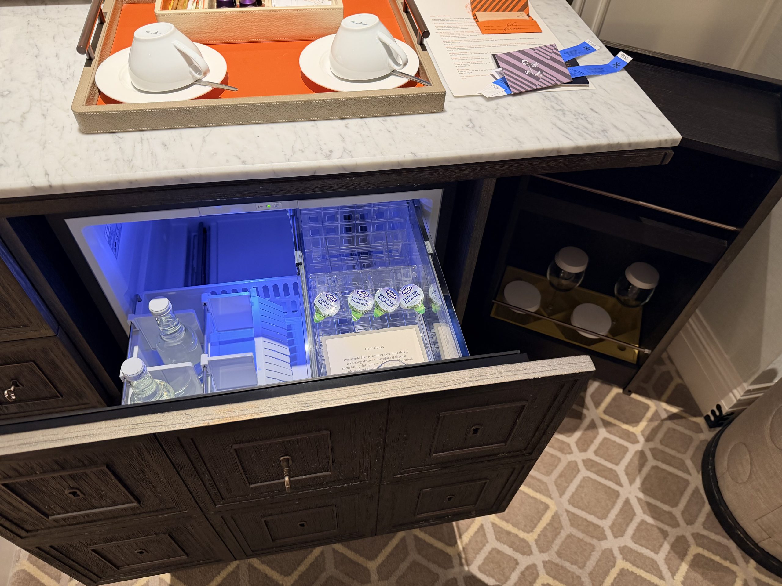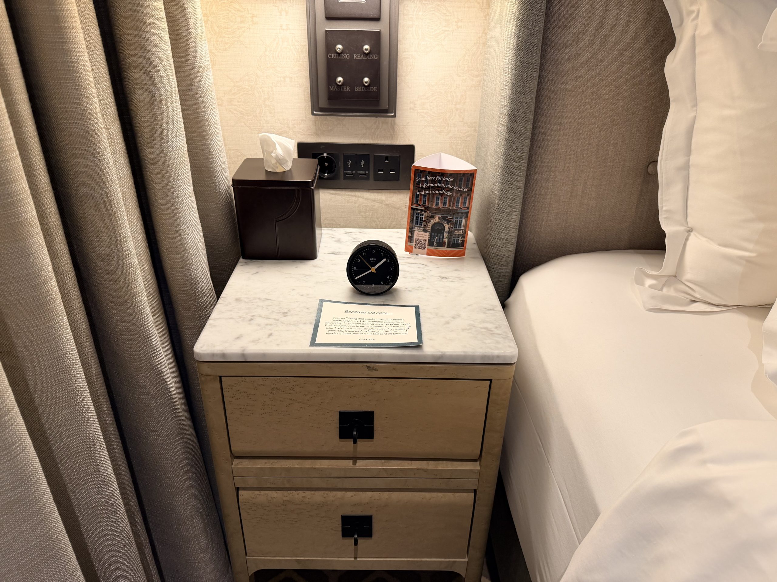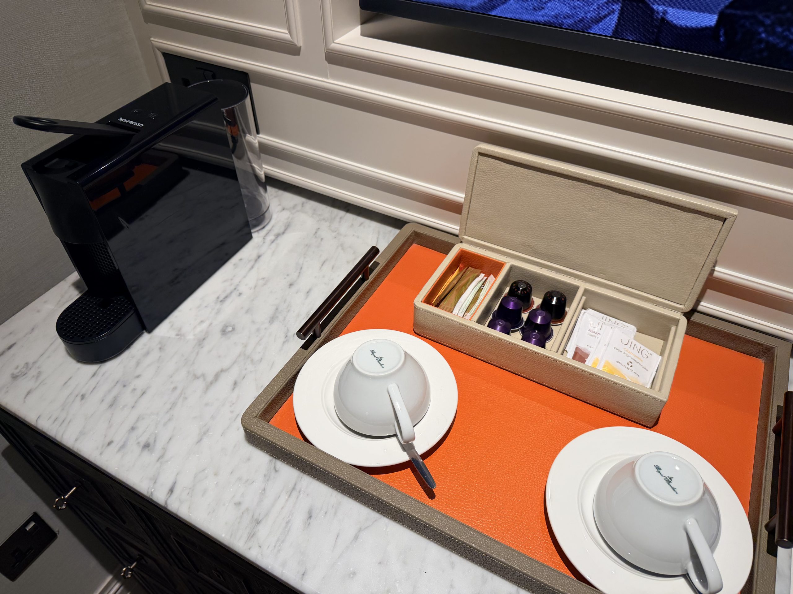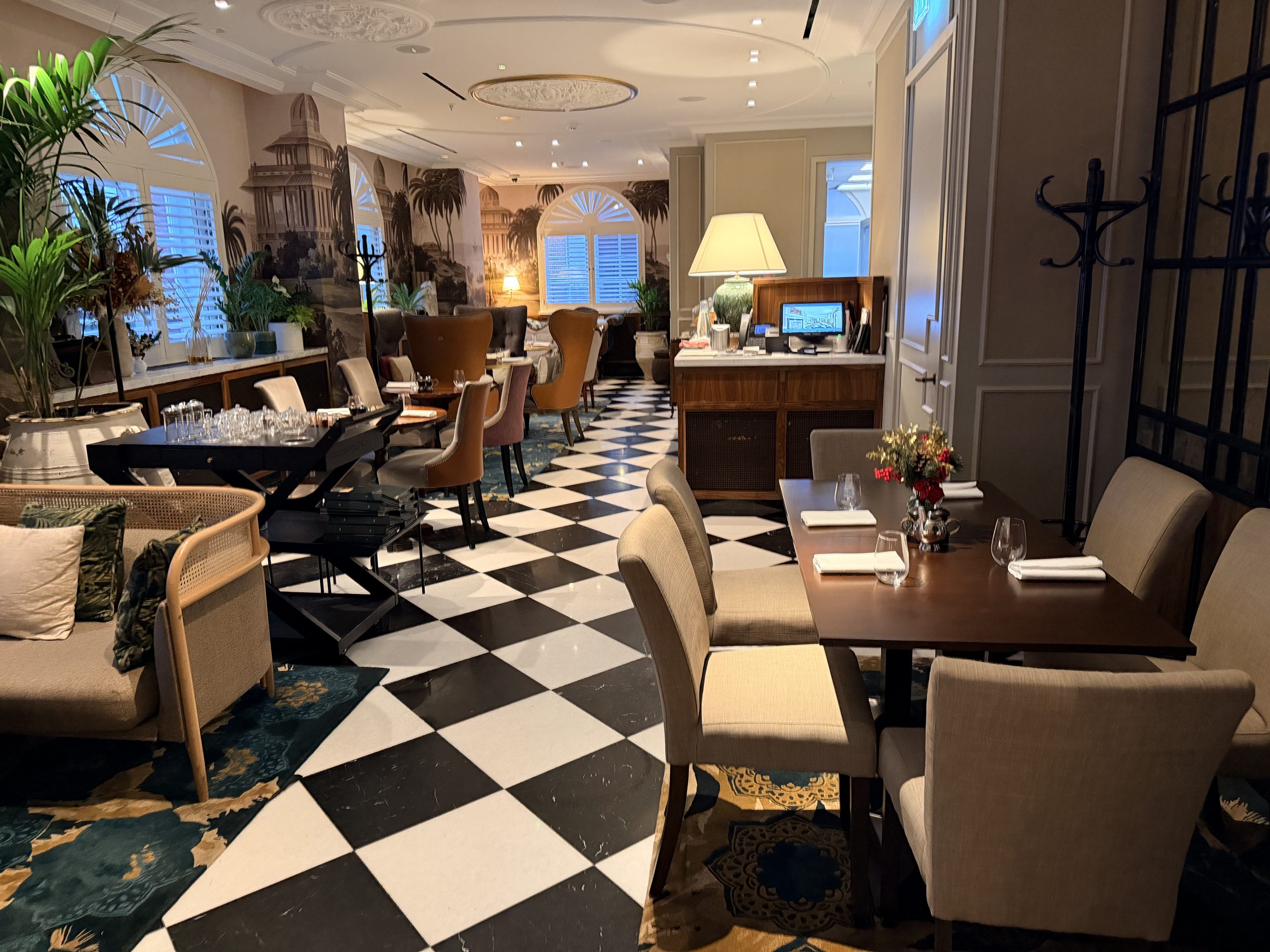 酒店大廳巧妙地融入了現代裝置藝術,當代家具與精選藝術品,配合經典英倫風格,創造出一種「經典與前衛對話」的獨特氛圍。辦理入住的當下,或許是一時服務人員太忙,因此除了沒有人幫我拿行李之外,也沒有招待我辦理入住手續,讓我站在那裏一時半刻後才被接待。但是辦理入住手續時,還是能感受到英式禮賓的態度,而且最後要退房時,服務超好到令人動容,因為酒店周遭為了新年遊行的關係,實施交通管制,所有的車子都進不來,必須走到國家美術館旁,才有辦法叫車離開,酒店方面因此還專門找服務人員幫忙拉著行李,並且陪伴我們一行人一路走到國家美術館,最後看著我們上車之後才離開,算是給了我們2026年開始的滿滿祝福與溫暖。