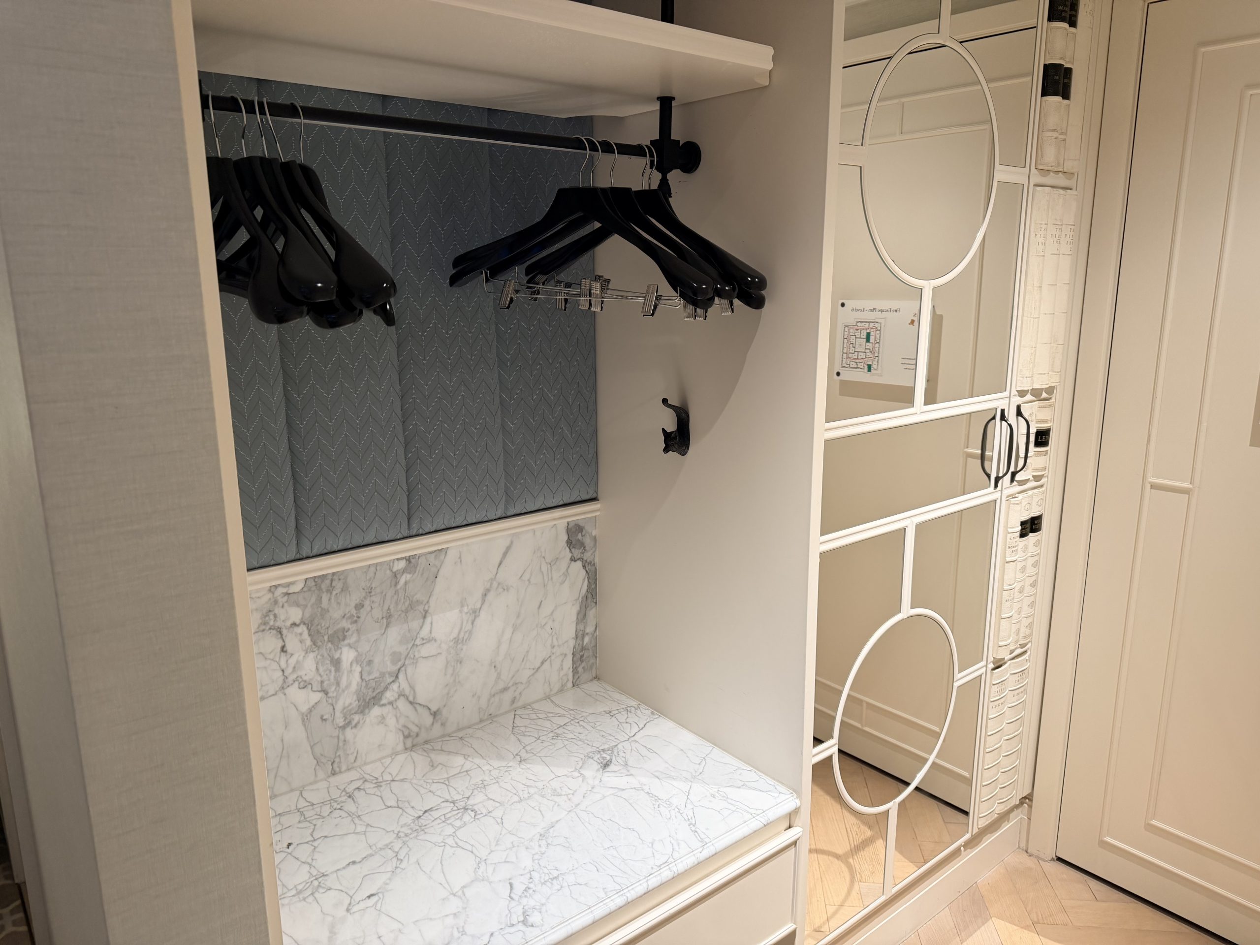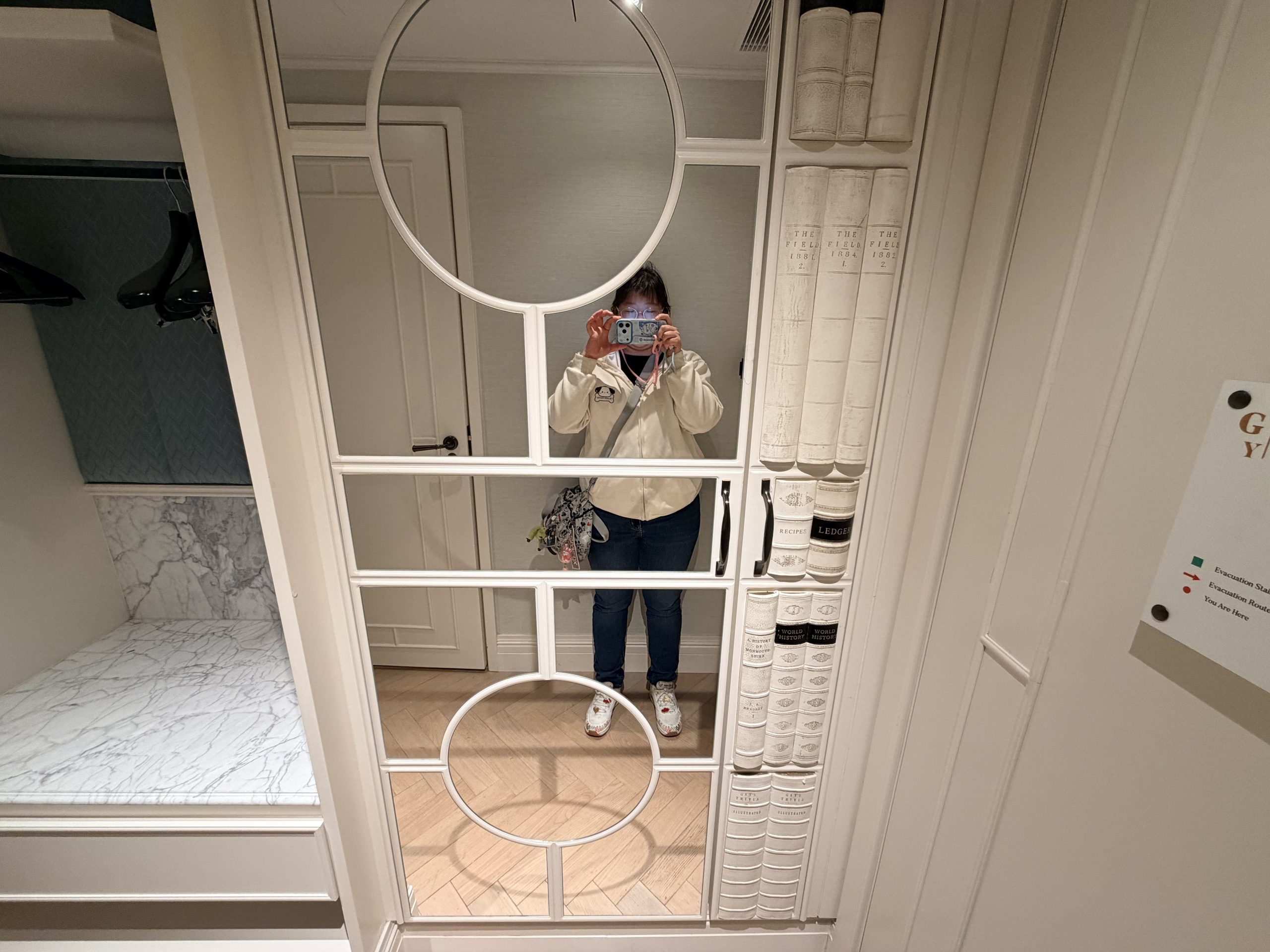 鏡面的牆讓空間感覺大了些,旁邊有個「假書櫃」造型的裝飾