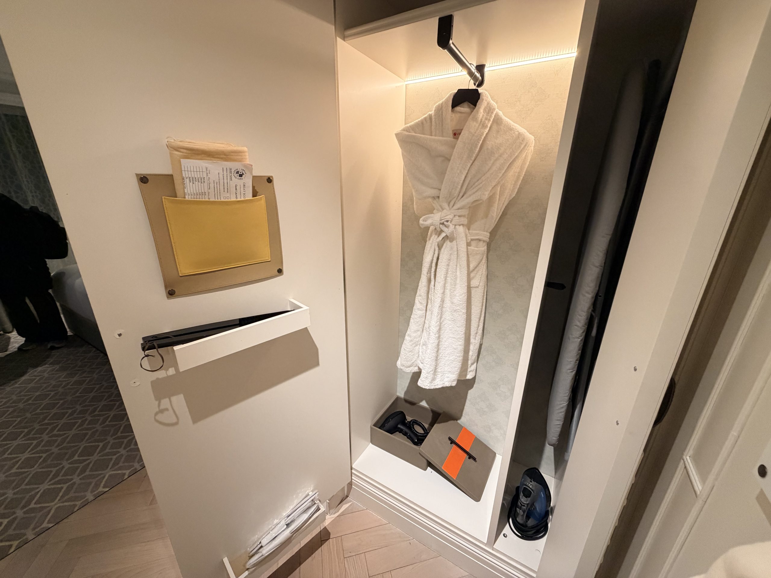 將衣櫃打開來後,可以看到睡衣與拖鞋,假書櫃後面則是燙衣板組
