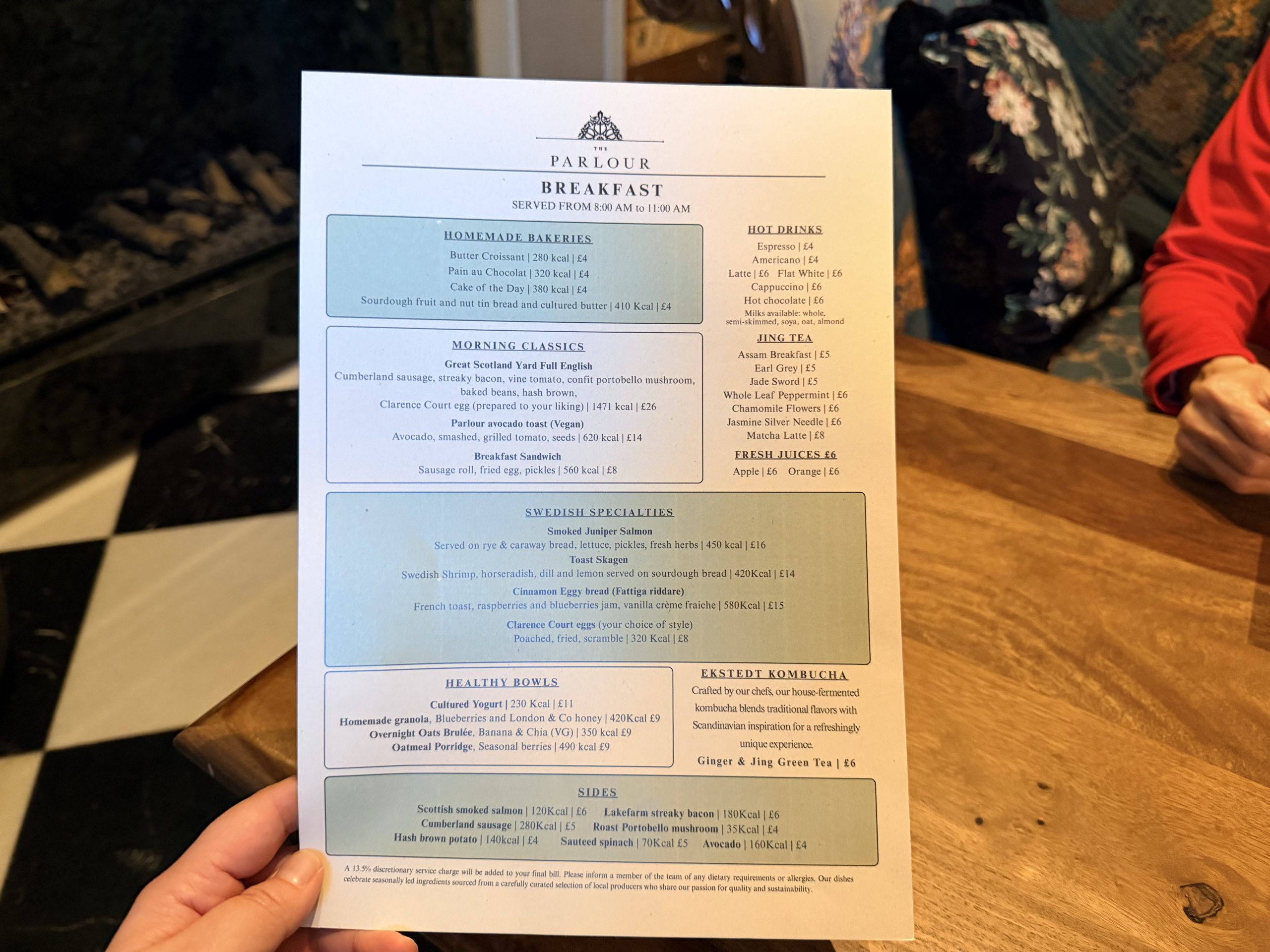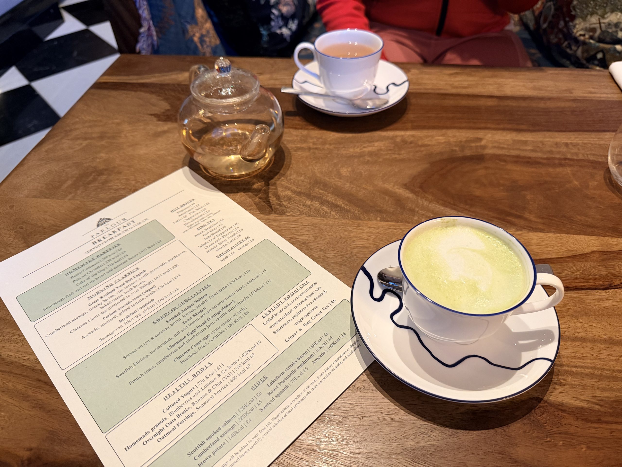這個「The Parlour」餐聽有提供早/午/晚餐,不過我認為主要定位是高級「英式下午茶」的餐廳,整間餐廳很有「上流貴婦享用下午茶」的感覺,座位看起來很華麗,不過可能裡面的傢俱也有點年紀了,沙發坐起來覺得有點扁硬。我第一天在這邊享用的早餐,完全都是單點形式,但是可以愛點多少就點多少,除此之外,這間最棒的就是飲料有精心現現做的咖啡與茶類,我點了個抹茶拿鐵,服務我的大叔服務人員還拿出茶碗,很專業地弄了抹茶粉,相當有意思。