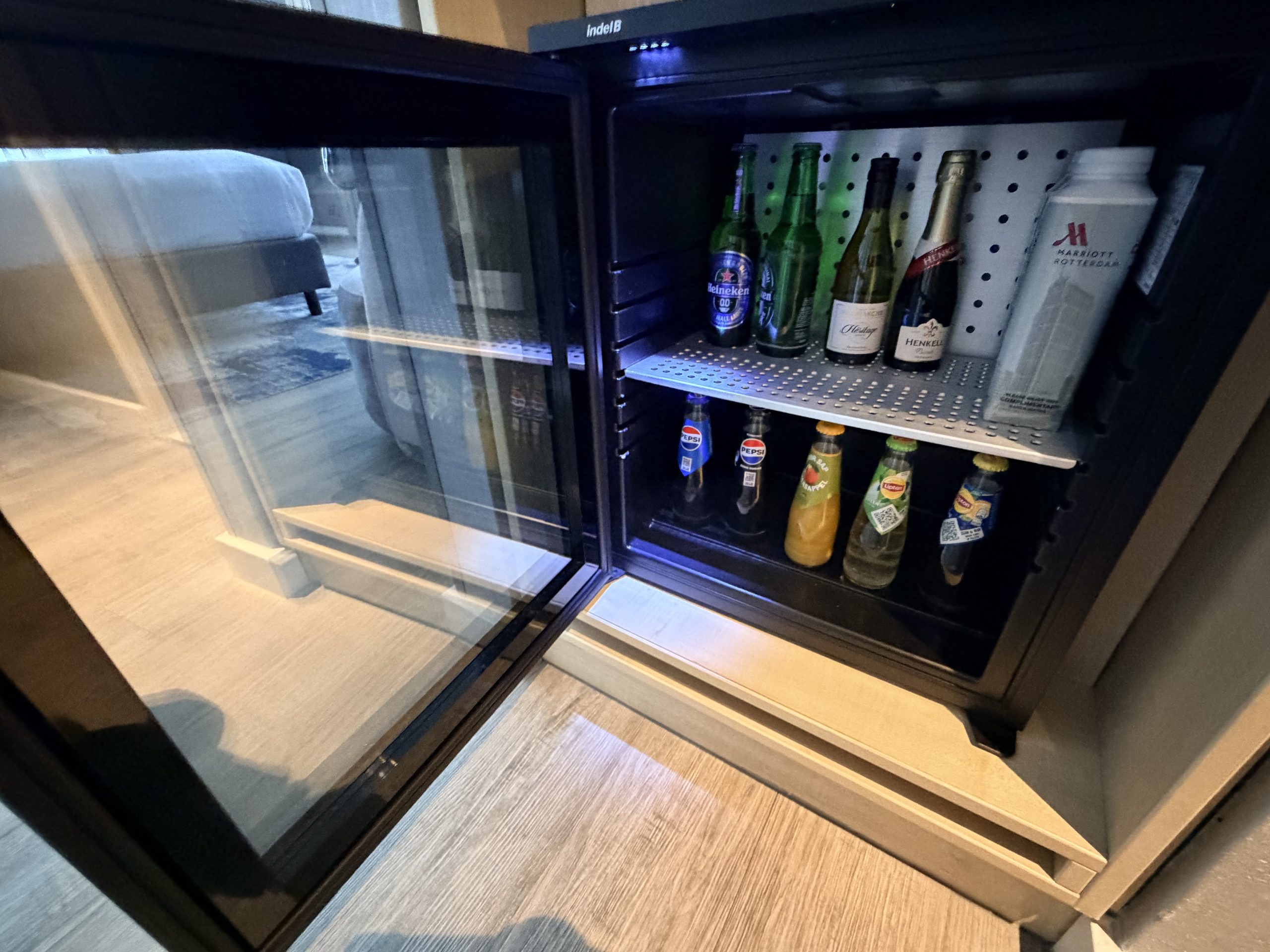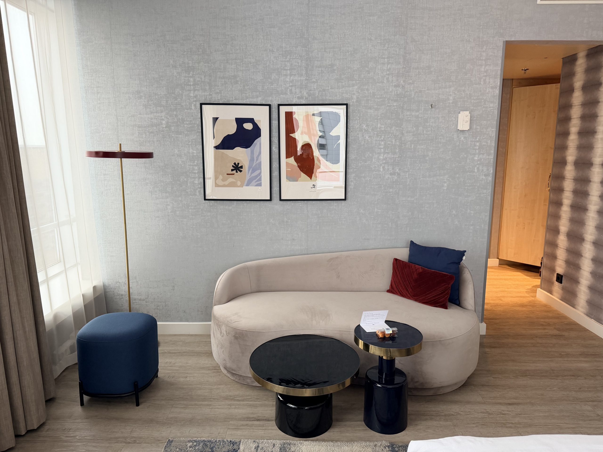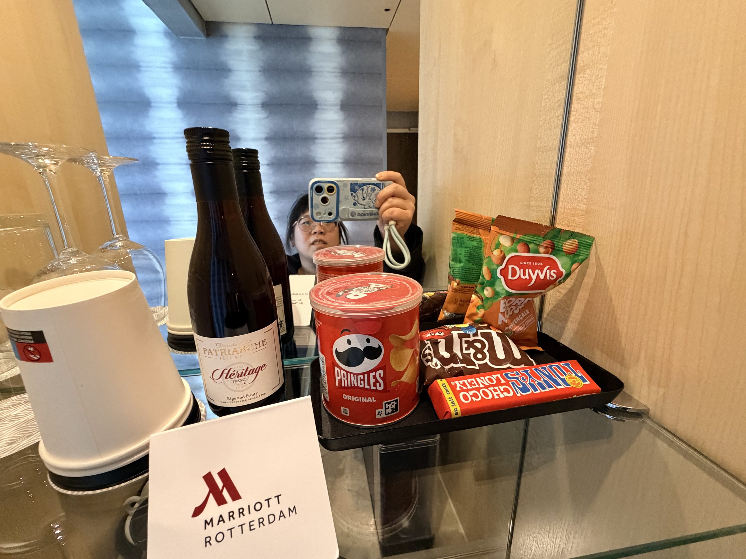 這次的住宿,櫃台服務人員幫我升等到了小套房的房型,房間位於行政樓層,走樓梯就可以到樓上的行政酒廊「M Lounge」。空間有496平方英呎左右,位於高樓層,搭配房間內整面的大窗戶,可以觀賞鹿特丹市區內的市區美景。開放式的起居區域,增加了房間的空間感,而房間內的點心/飲品都可以隨意免費取用,真的是令人超開心。房間內的裝潢雖然稍嫌老氣,不過整體來說保養得還不錯。