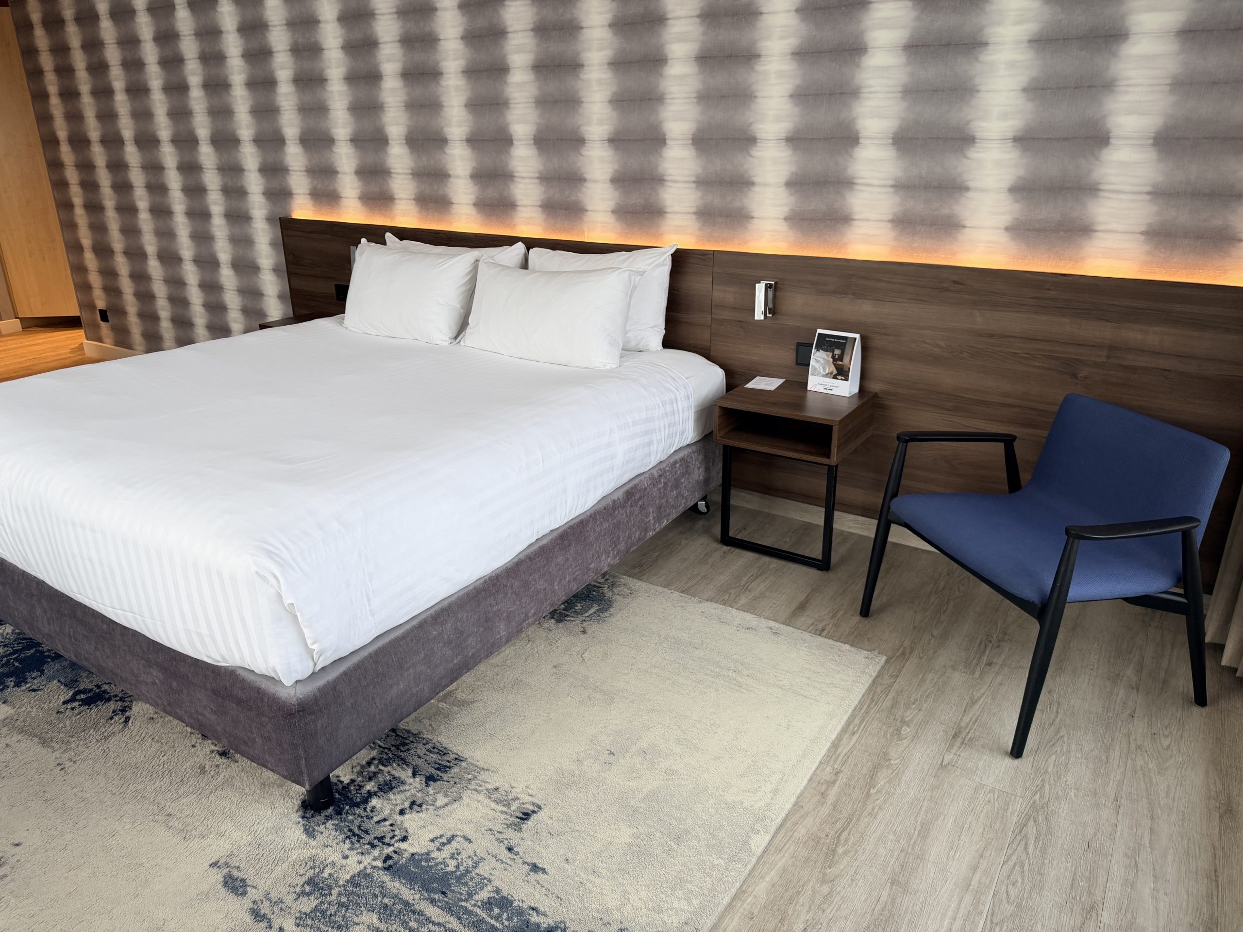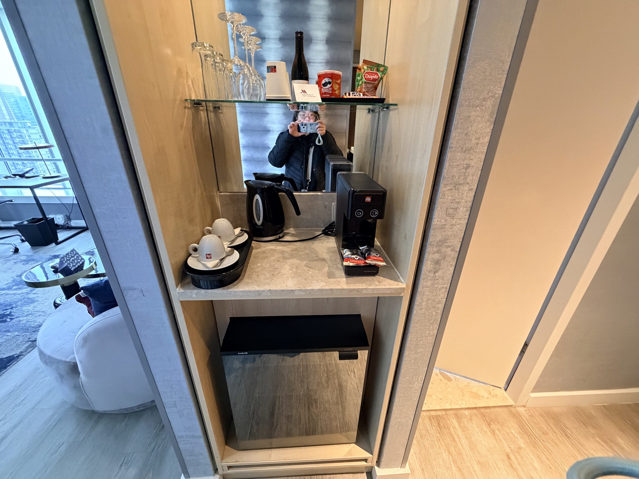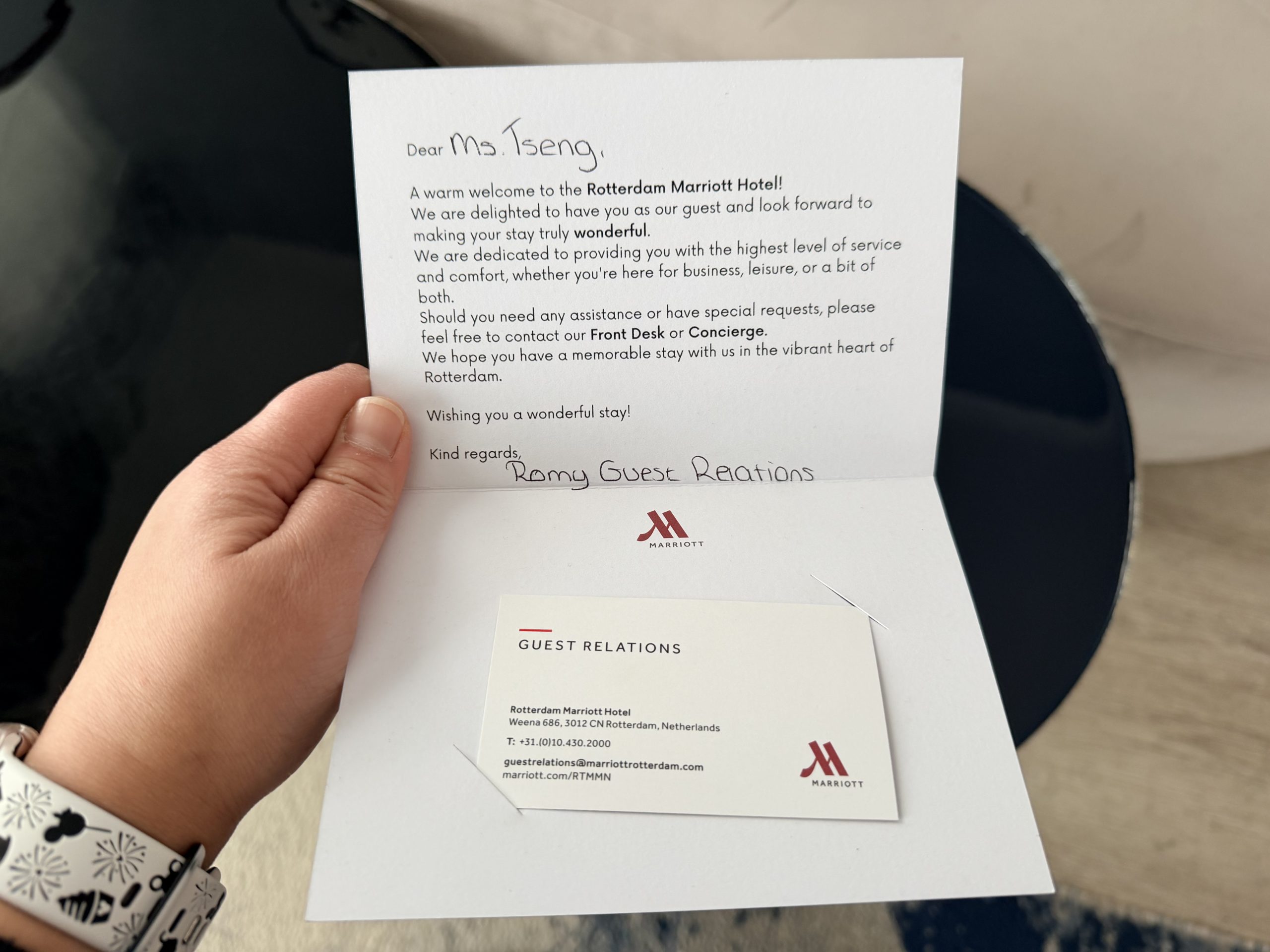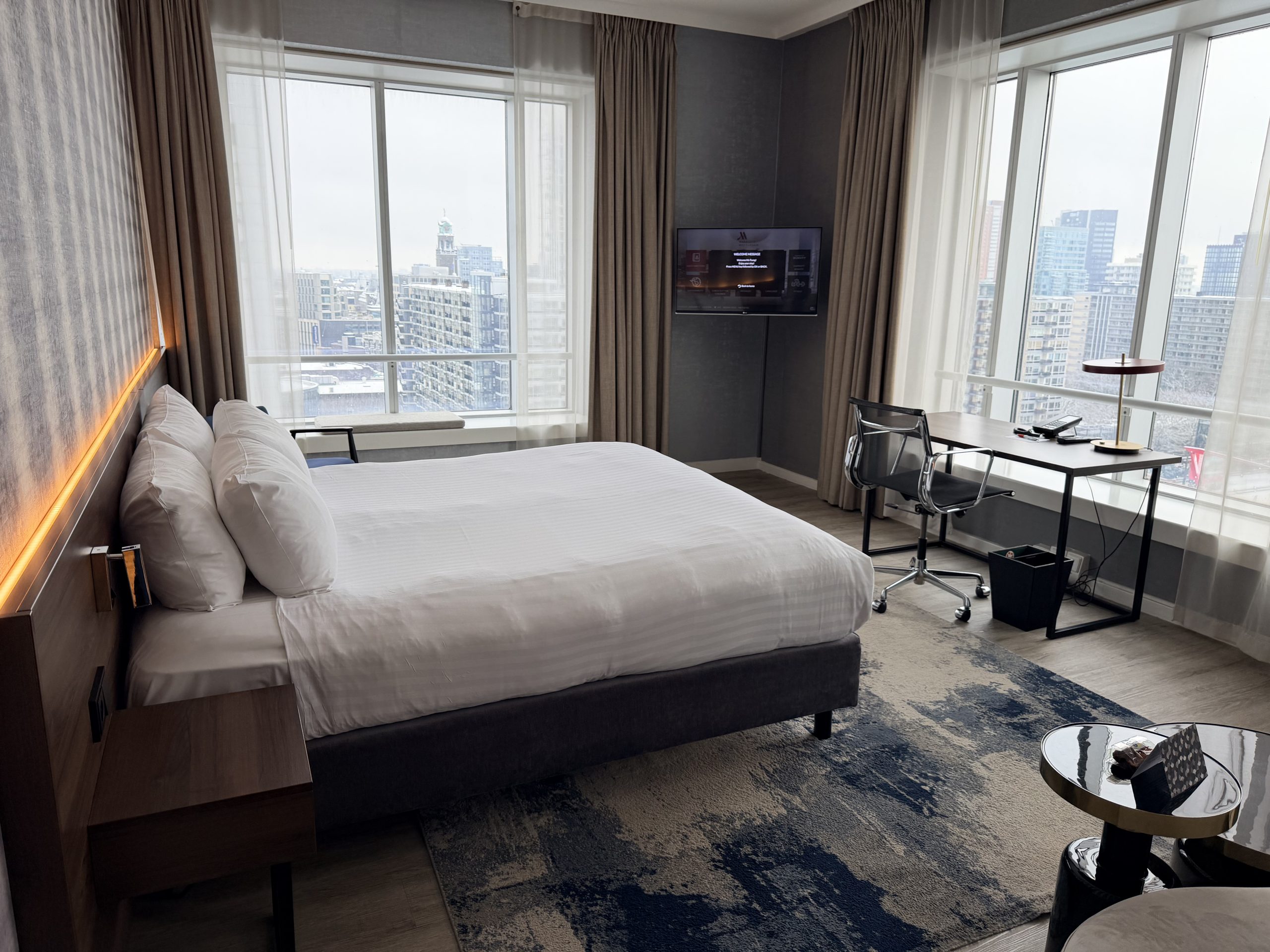 這次的住宿,櫃台服務人員幫我升等到了小套房的房型,房間位於行政樓層,走樓梯就可以到樓上的行政酒廊「M Lounge」。空間有496平方英呎左右,位於高樓層,搭配房間內整面的大窗戶,可以觀賞鹿特丹市區內的市區美景。開放式的起居區域,增加了房間的空間感,而房間內的點心/飲品都可以隨意免費取用,真的是令人超開心。房間內的裝潢雖然稍嫌老氣,不過整體來說保養得還不錯。