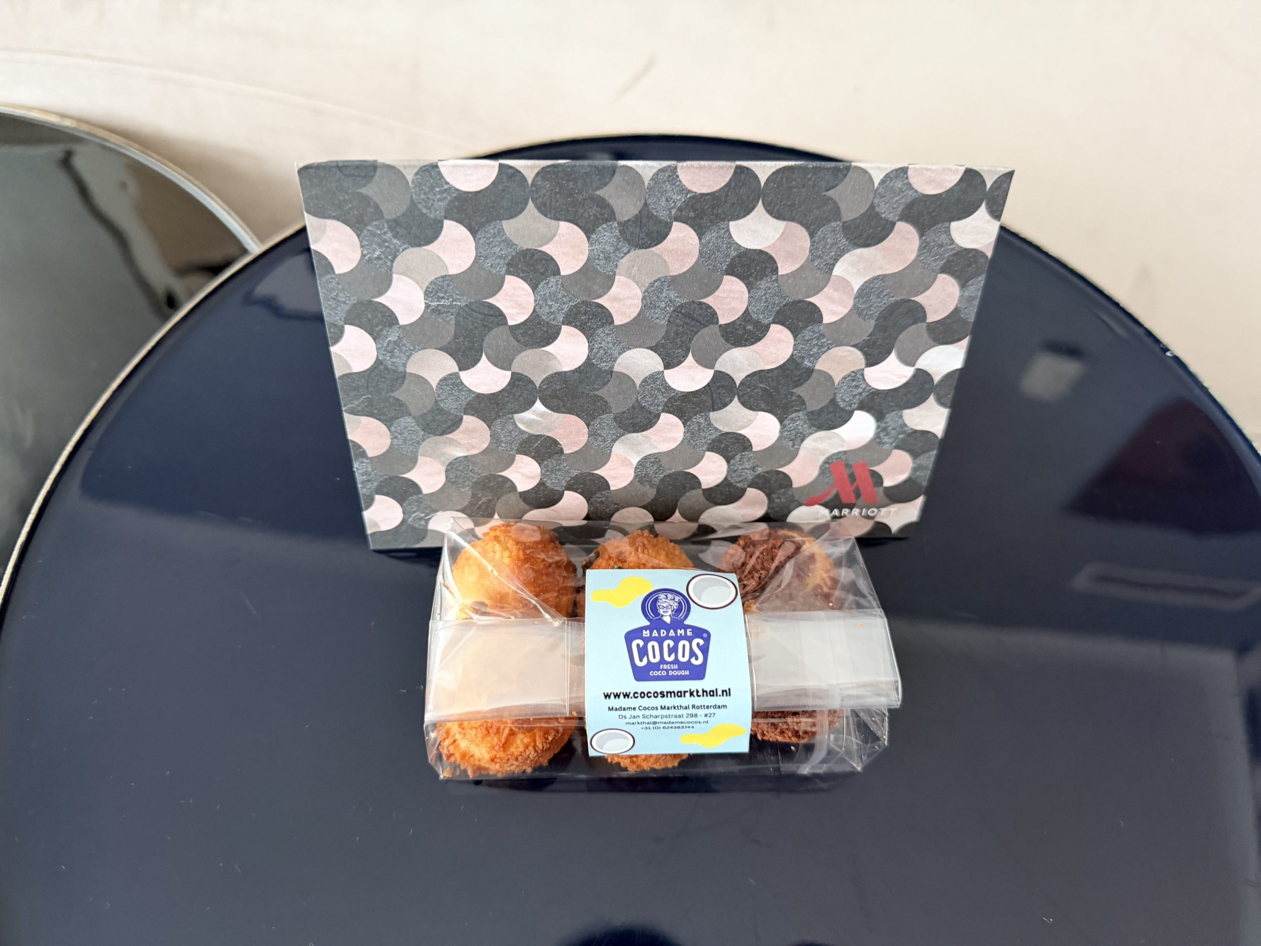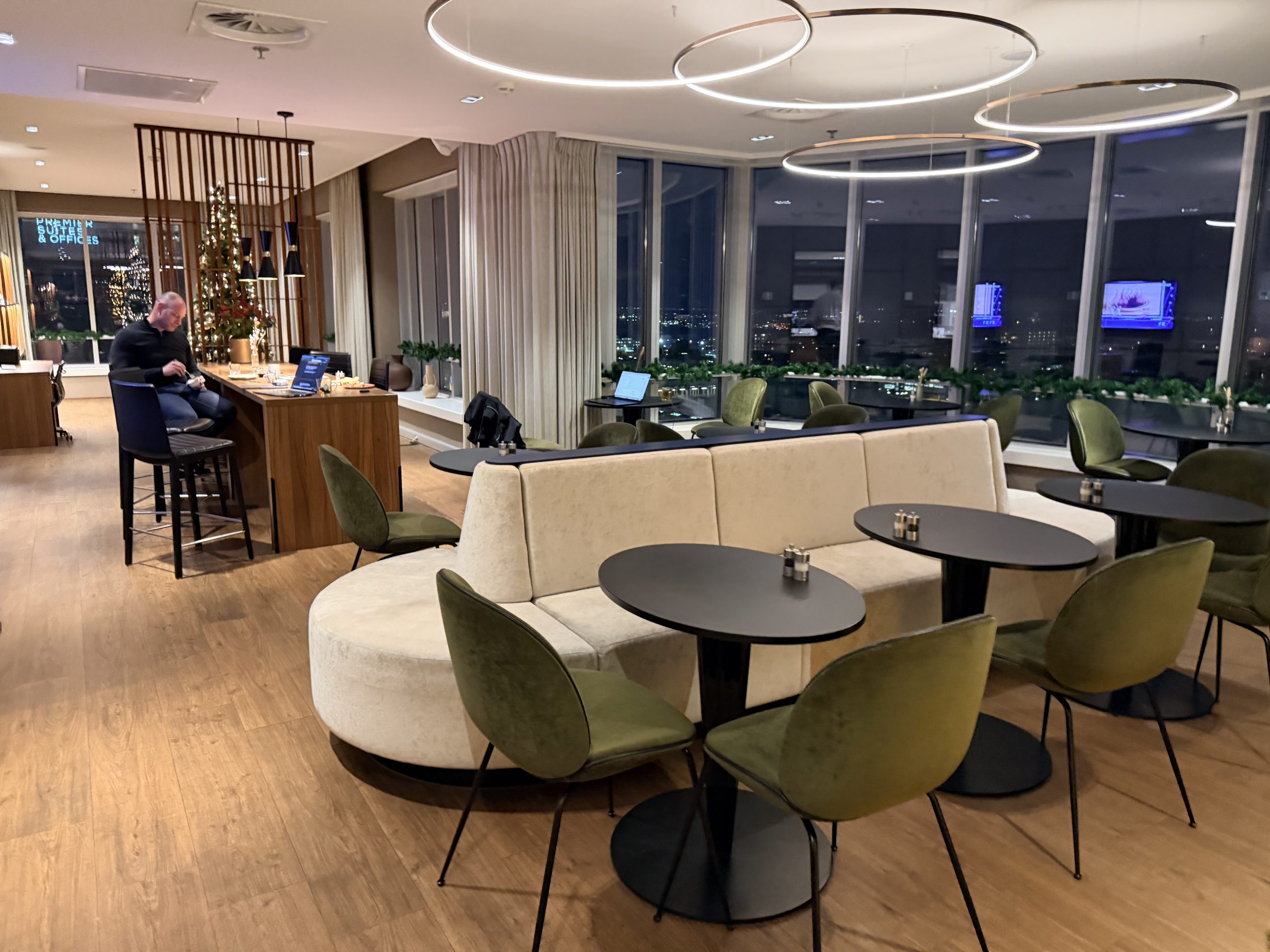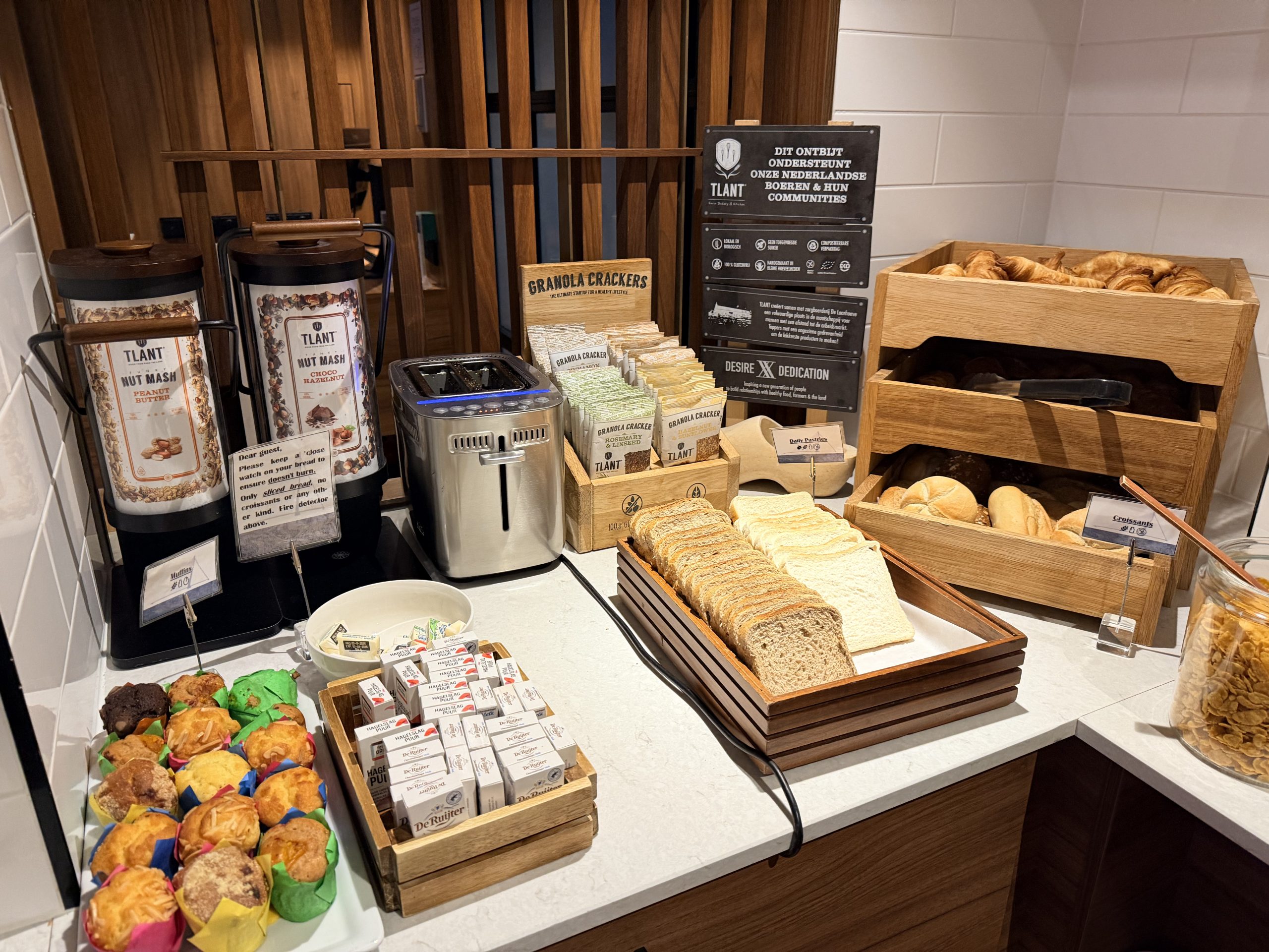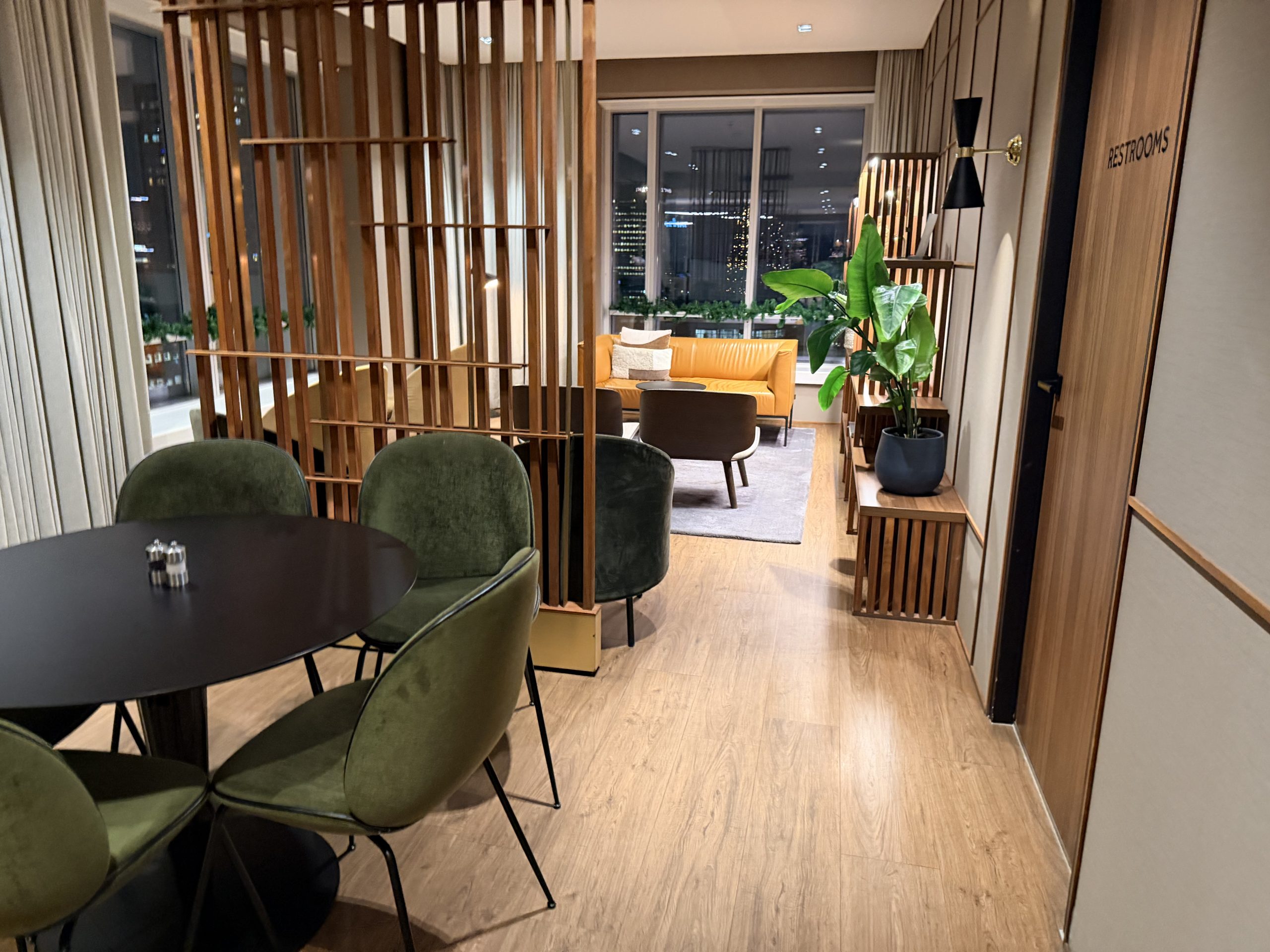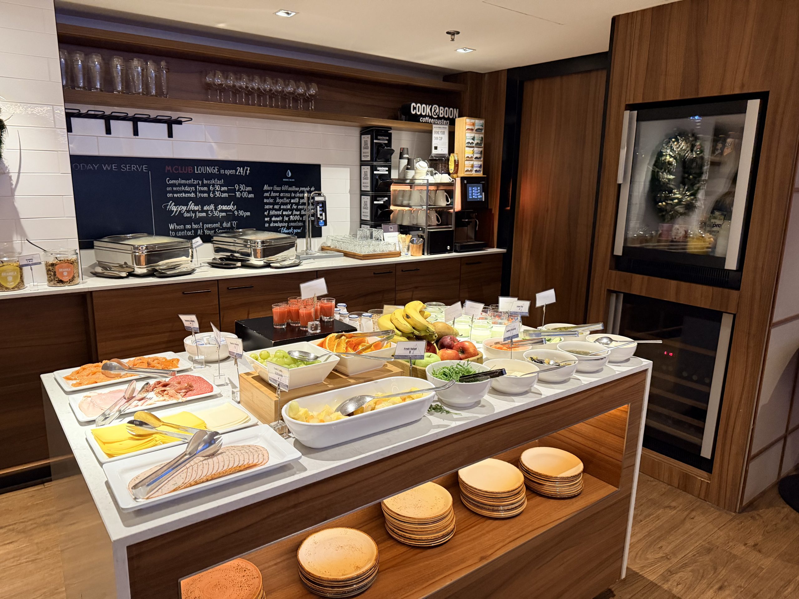 酒店內有三間餐廳,以及一間行政酒廊「M Lounge」,持有萬豪集團白金會籍以上,或是入住行政樓層的房客,都可使用行政酒廊,行政酒廊內的視野極佳,整片玻璃帷幕將鹿特丹的城市輪廓盡收眼底。在傍晚時段提供輕食點心、紅/白酒,啤酒,軟性飲料一字排開,搭配幾道鹹點,既可作為晚餐前的開胃序曲,也完全可以當成一頓輕鬆的晚餐替代方案。而在早餐時段,可在這裡享用自助式餐飲,有提供新鮮水果,冷切肉片,各式荷蘭當地起司,各式麵包,熱食選項,以及優格與燕麥等等。