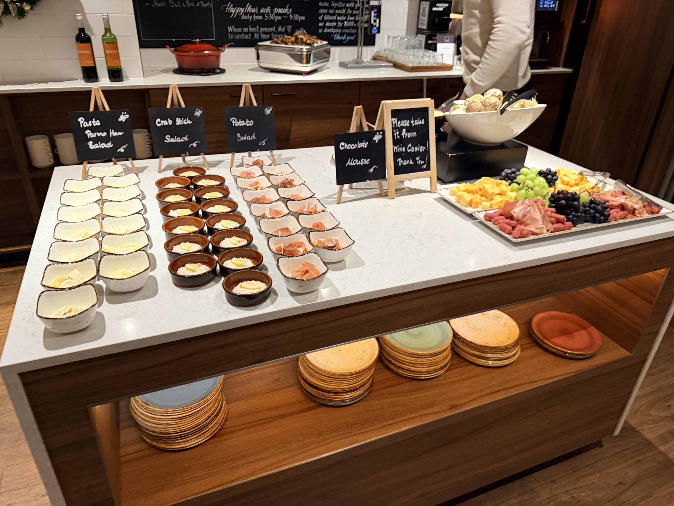 在早餐時段部分,有提供水果與沙拉,以及火腿肉片與煙燻鮭魚