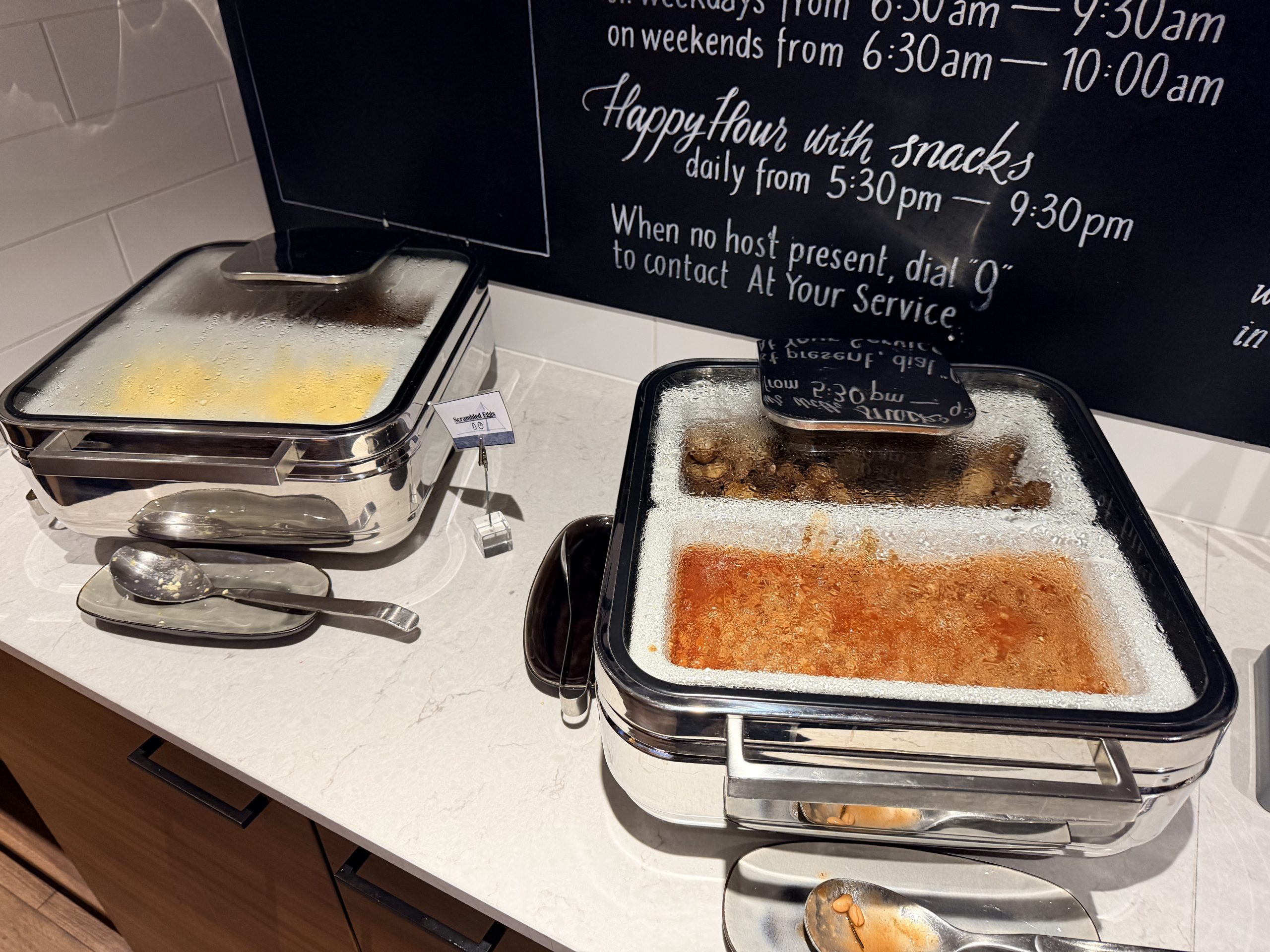 早餐時段的熱食部分,有炒蛋,香腸與豆子