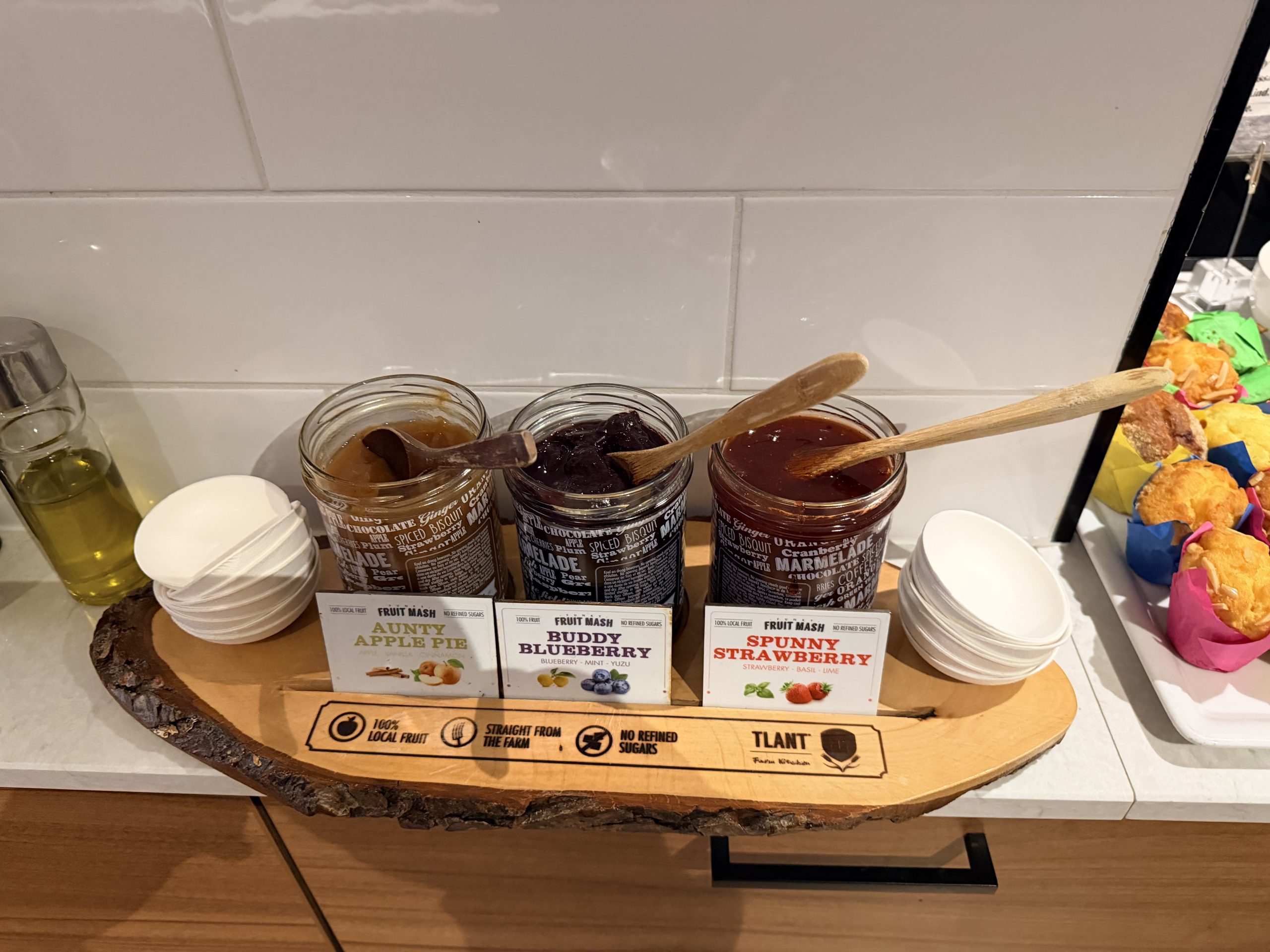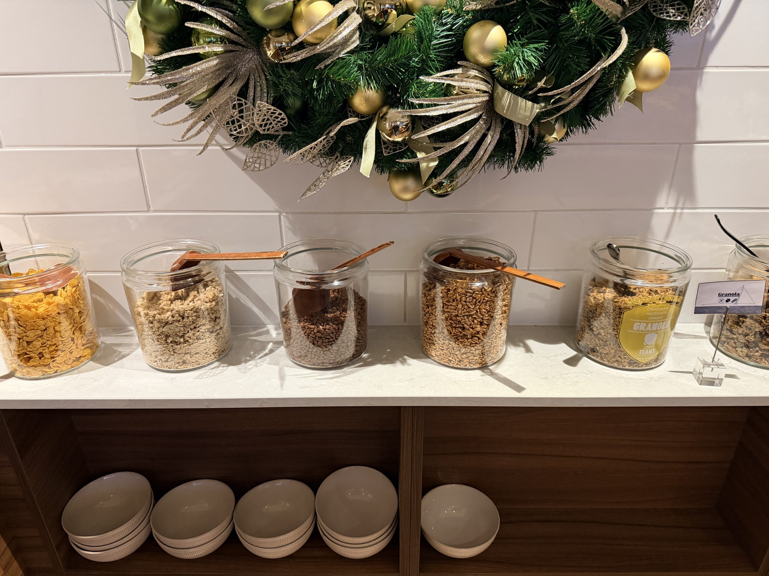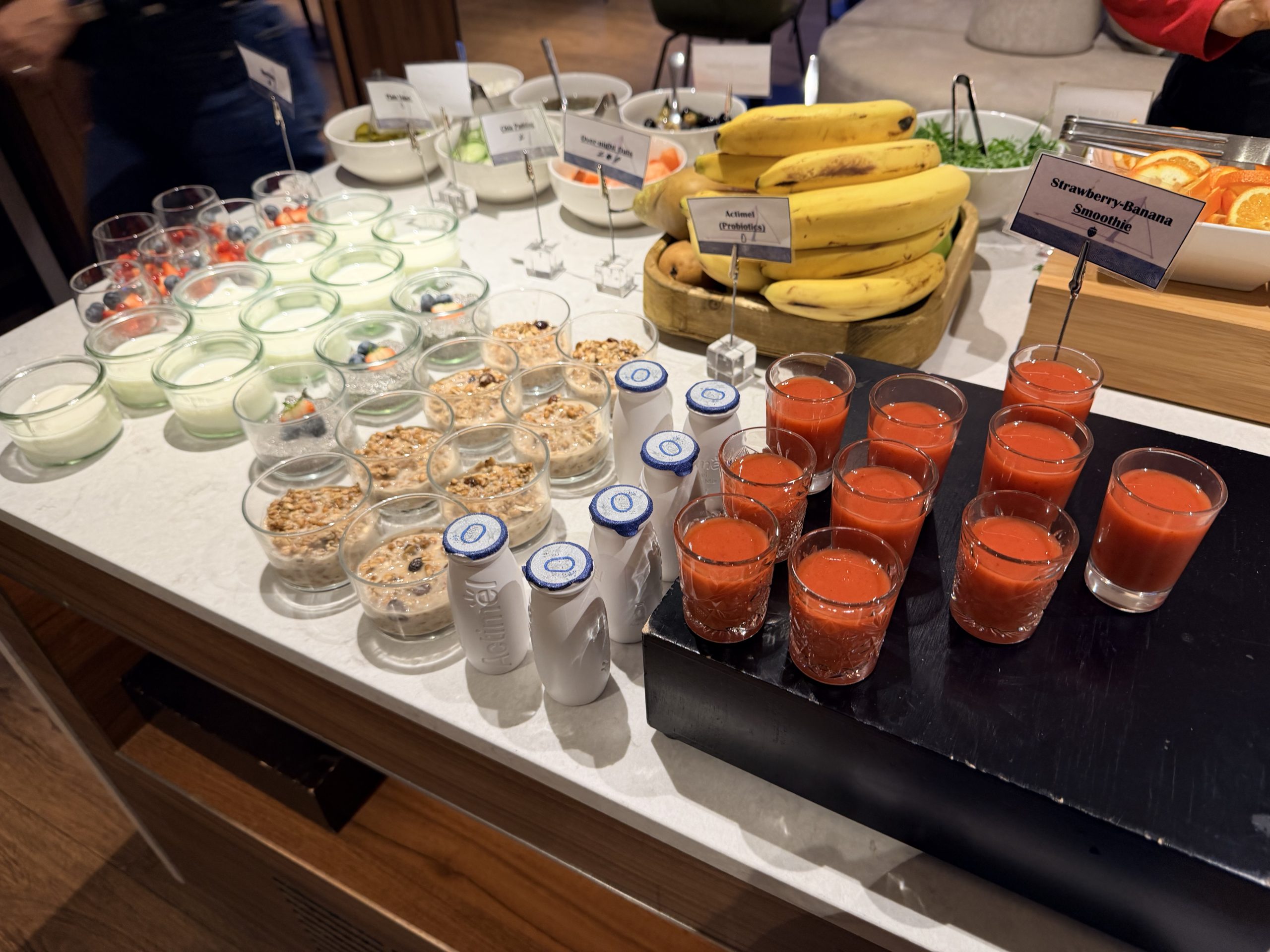 各式優格,麥片與優酪乳,還有提供紅色蔬果汁