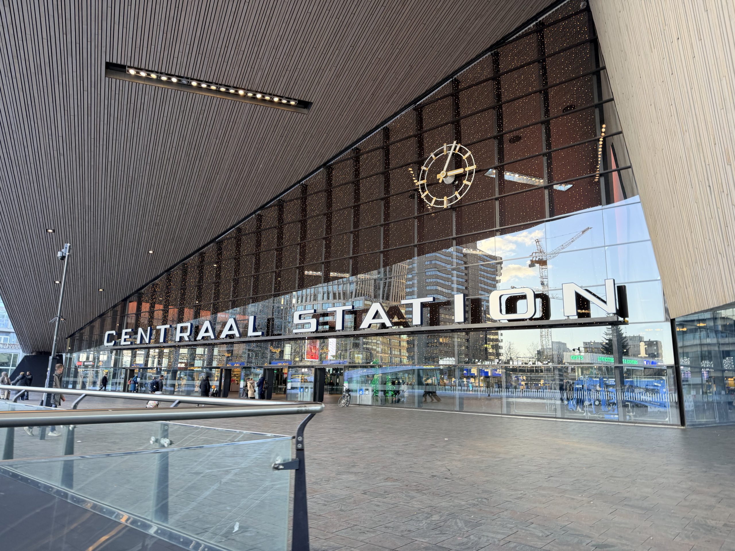 從上篇體驗文分享過的小鎮-德爾夫特 (Delft) 出發,搭火車前往鹿特丹 (Rotterdam),僅需15分鐘的車程,卻已然從一個童話般地尖頂教堂與運河倒影的氛圍,轉換到另一個以玻璃帷幕,鋼骨結構與大膽幾何呈現的現代建築風格當中。鹿特丹是第二次世界大戰之後,從廢墟中重建的城市,而抵達的這晚就是入住位於鹿特丹中央車站 (Rotterdam Centraal) 正對面,棲身於「千禧塔」(Millennium Tower) 之中的鹿特丹萬豪酒店 (Rotterdam Marriott Hotel)。