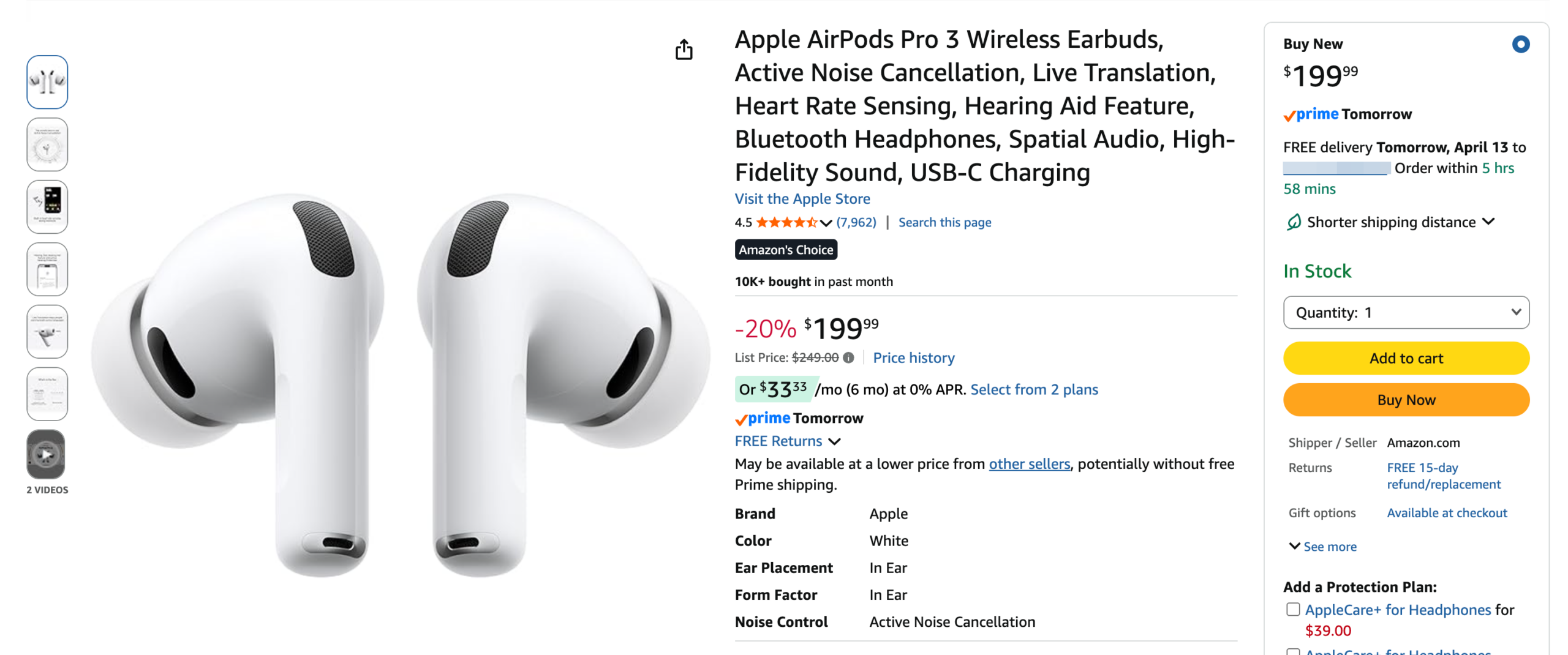 AirPods Pro 3 在 Amazon 史低,仅需 $199.99(原价 $249):
